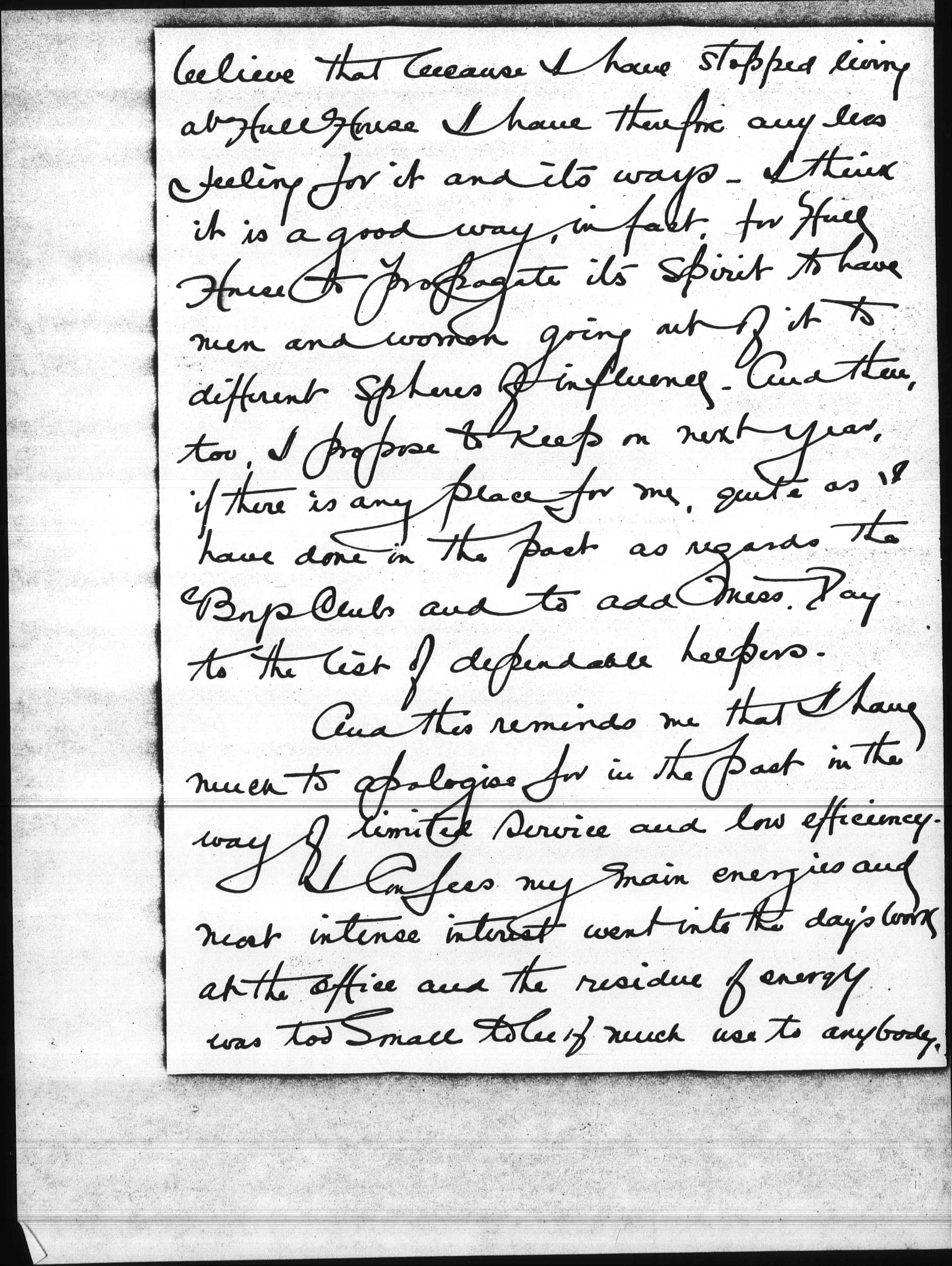I know you will be willing to [page 2] believe that because I have stopped living at Hull House I have therefore any less feeling for it and its ways. I think it is a good way, in fact, for Hull House to propagate its spirit to have men and women going out of it to different spheres of influence. And there, too, I propose to keep on next year, if there is any place for me, quite as I have done in the past as regards the Boys Club and to add Miss Day to the list of dependable helpers.