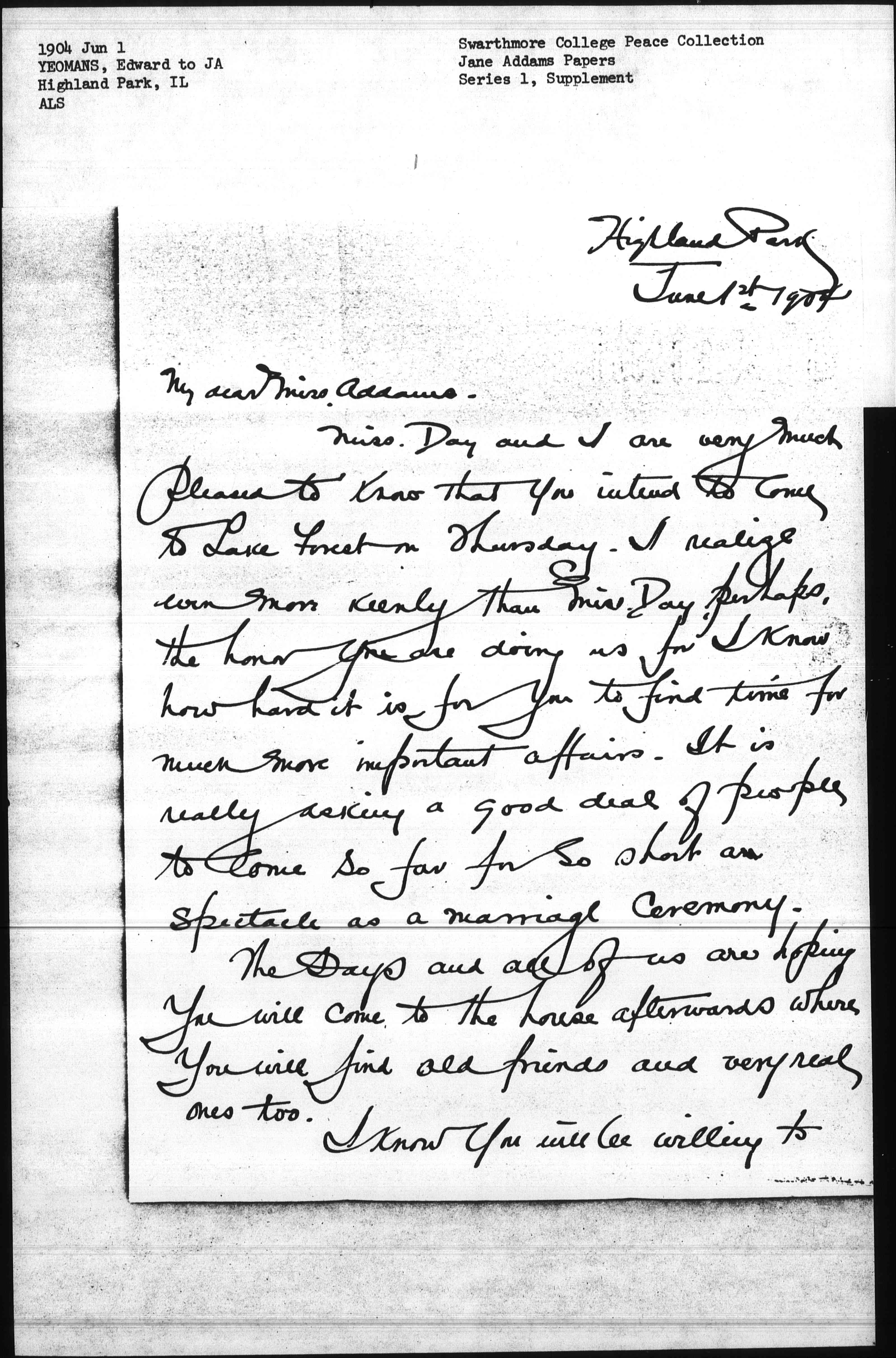 Miss Day and I are very much pleased to know that you intend to come to Lake Forest on Thursday. I realize even more keenly than Miss Day, perhaps, the honor you are doing us for I know how hard it is for you to find time for much more important affairs. It is really asking a good deal of people to come so far for so short an spectacle as a marriage ceremony.