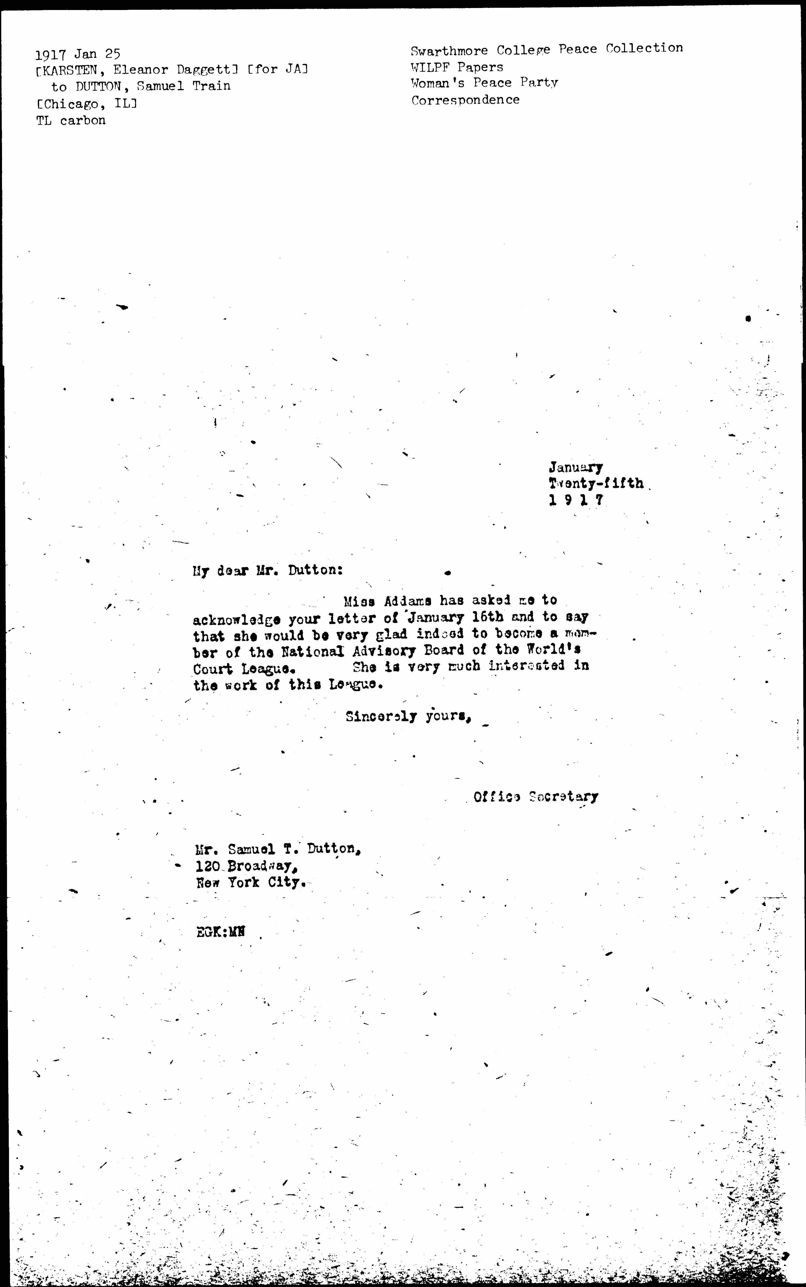 Miss Addams has asked me to acknowledge your letter of January 16th and to say that she would be very glad indeed to become a member of the National Advisory Board of the World’s Court League. She is very much interested in the work of this League.