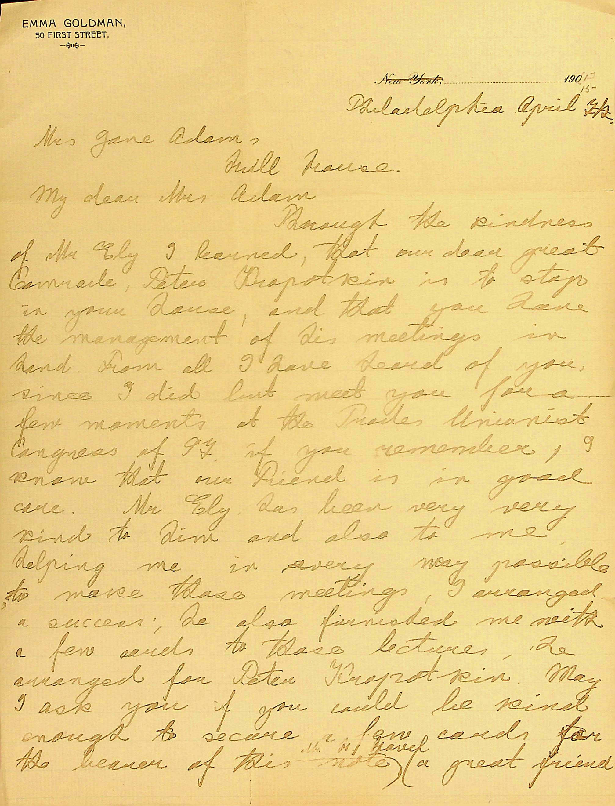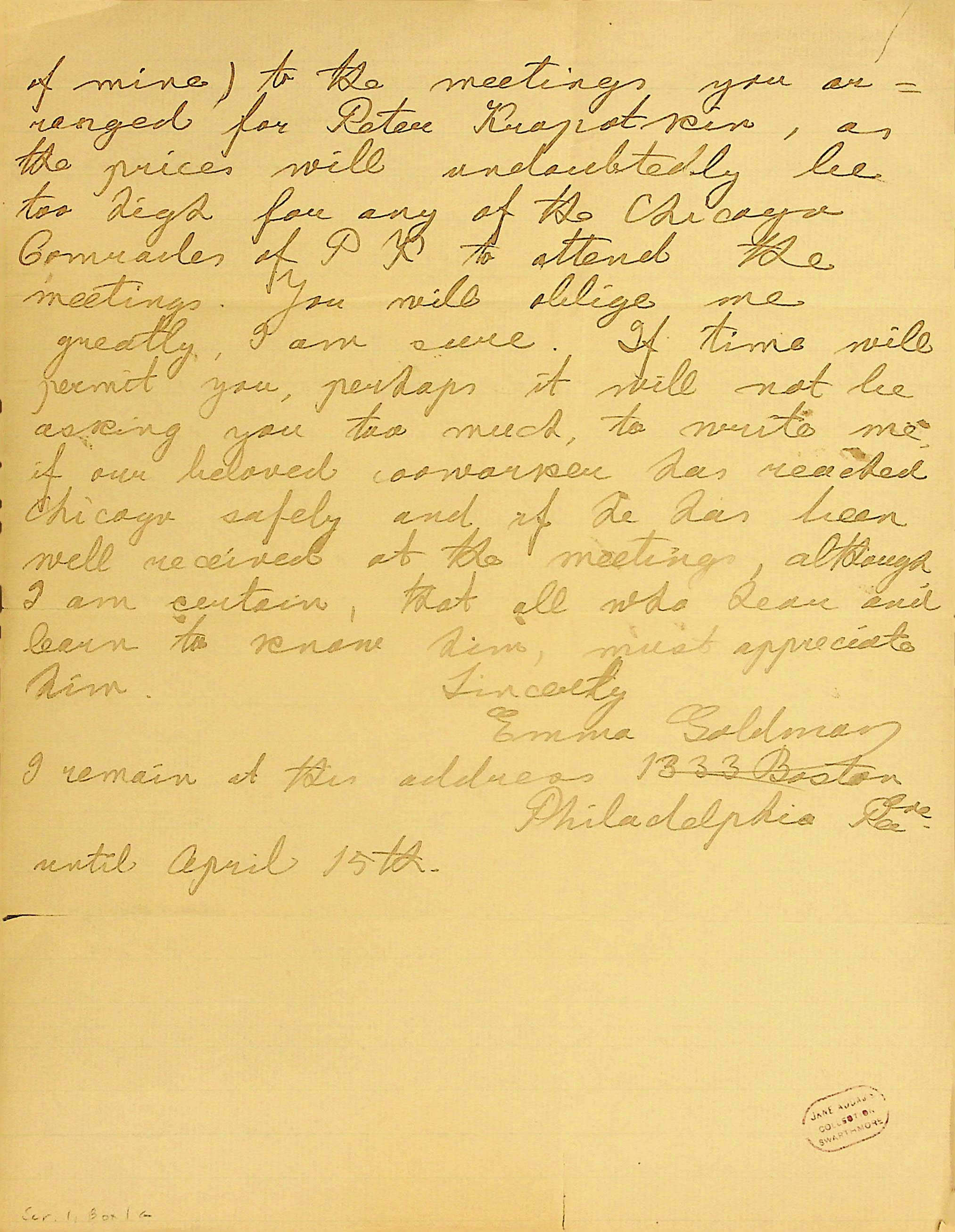 Through the kindness of Mr Ely I learned, that our dear great Comrade, Peter Kropotkin is to stop in your house, and that you have the management of his meetings in hand. From all I have heard of you, since I did last meet you for a few moments at the Trades Unionist Congress of 97 if you remember, I know that our Friend is in good care. Mr Ely has been very very kind to him and also to me helping me in every way possible to make those meetings, I arranged a success; he also furnished me with a few cards to those lectures, he arranged for Peter Kropotkin. May I ask you if you could be kind enough to secure a few cards for the bearer of this note ↑Mr H Havel↓ (a great friend [page 2] of mine) to the meetings you arranged for Peter Kropotkin, as the prices will undoubtedly be too high for any of the Chicago Comrades of PK to attend the meetings. You will oblige me greatly, I am sure. If time will permit you, perhaps it will not be asking you too much, to write me, if our beloved coworker has reached Chicago safely and if he has been well received at the meetings, although I am certain, that all who hear and learn to know him, must appreciate him.
