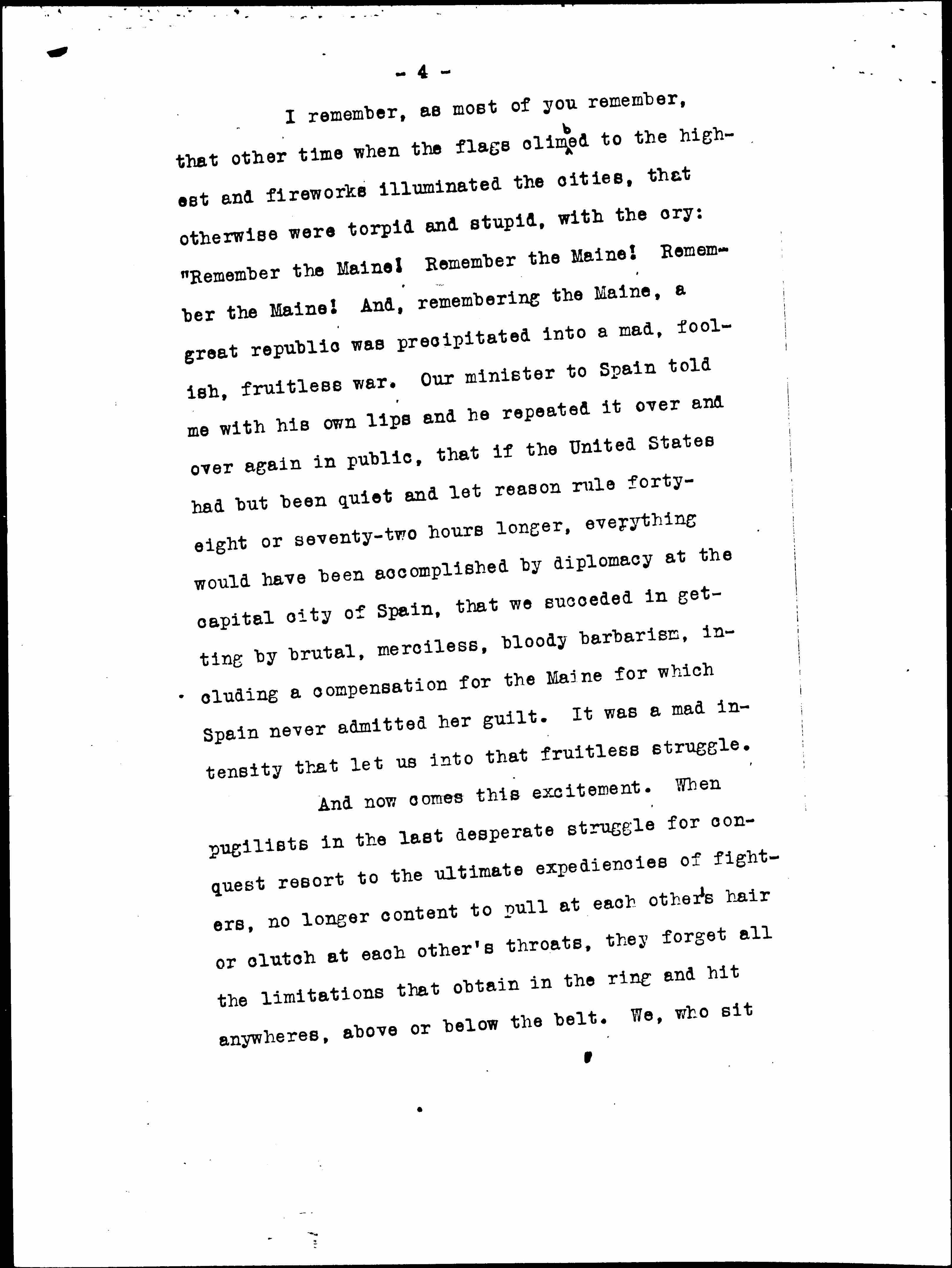 I remember, as most of you remember, that other time when the flags climbed to the highest and fireworks illuminated the cities, that otherwise were torpid and stupid, with the cry: "Remember the Maine! Remember the Maine! Remember the Maine!" And, remembering the Maine, a great republic was precipitated into a mad, foolish, fruitless war. Our minister to Spain told me with his own lips and he repeated it over and over again in public, that if the United States had but been quiet and let reason rule forty-eight or seventy-two hours longer, everything would have been accomplished by diplomacy at the capital city of Spain, that we [succeeded] in getting by brutal, merciless, bloody barbarism, including a compensation for the Maine for which Spain never admitted her guilt. It was a mad intensity that let us into that fruitless struggle.