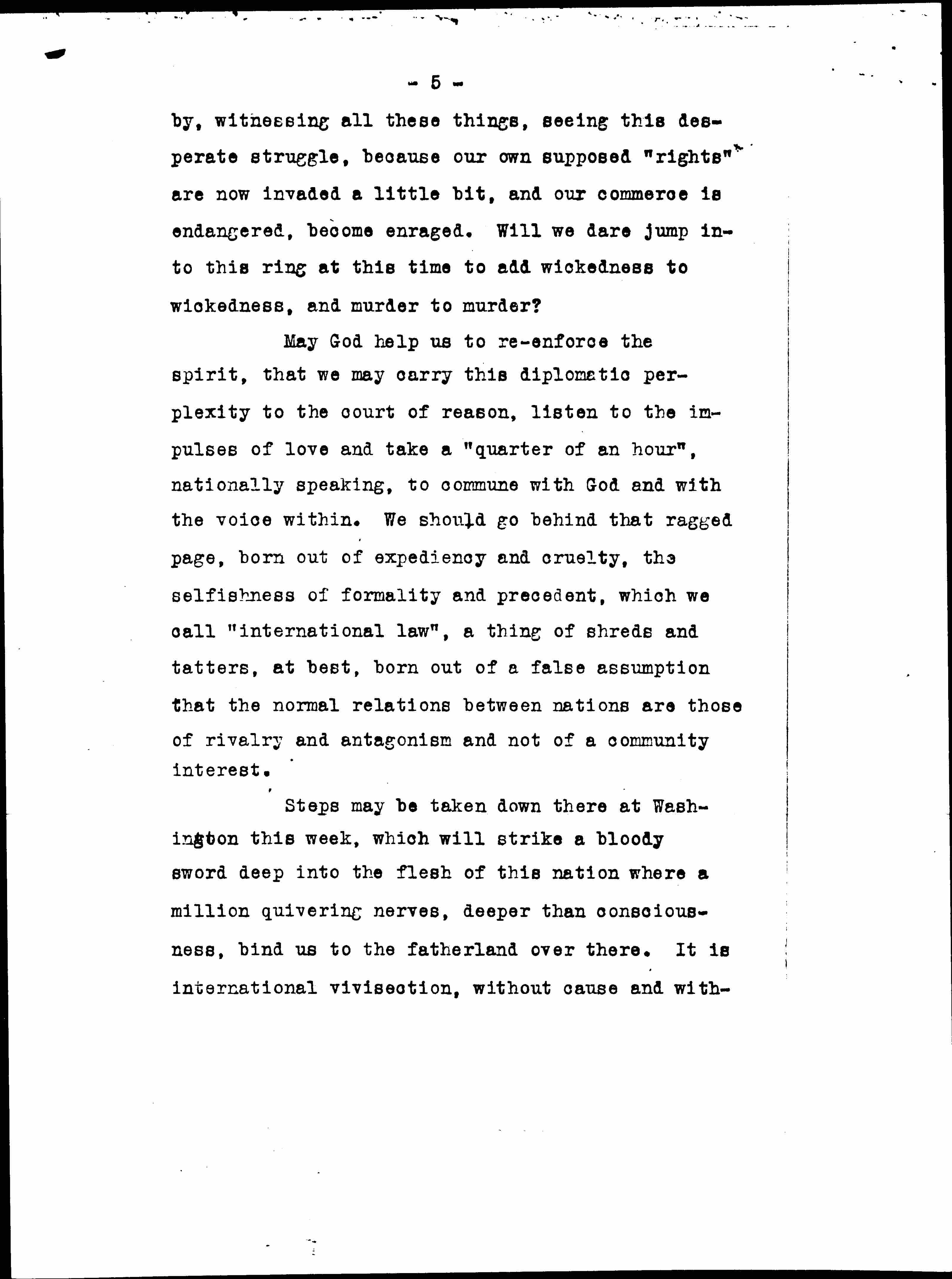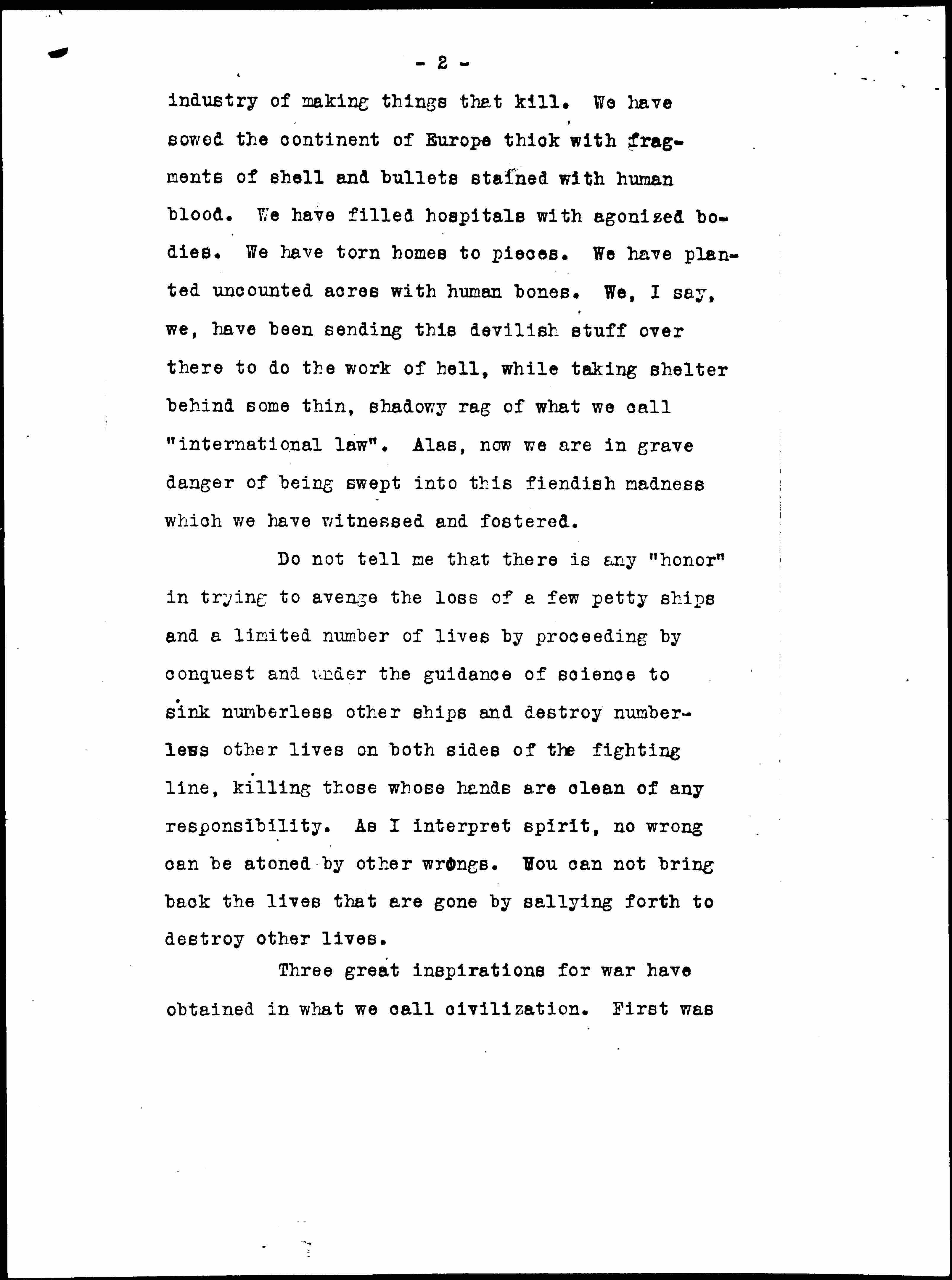 War is still a survival of brute forces. It occurs where spirit has not yet freed itself from the entanglements of things that can be measured, of things that can be weighed. We of the United States for two and a half years have been twiddling our thumbs while Europe was tearing itself to pieces. We have gloated over our increasing prosperity, the profits from our hellish [page 2] industry of making things that kill. We have sowed the continent of Europe thick with fragments of shell and bullets stained with human blood. We have filled hospitals with agonized bodies. We have torn homes to pieces. We have planted uncounted acres with human bones. We, I say, we, have been sending this devilish stuff over there to do the work of hell, while taking shelter behind some thin, shadowy rag of what we call "international law". Alas, now we are in grave danger of being swept into this fiendish madness which we have witnessed and fostered.
