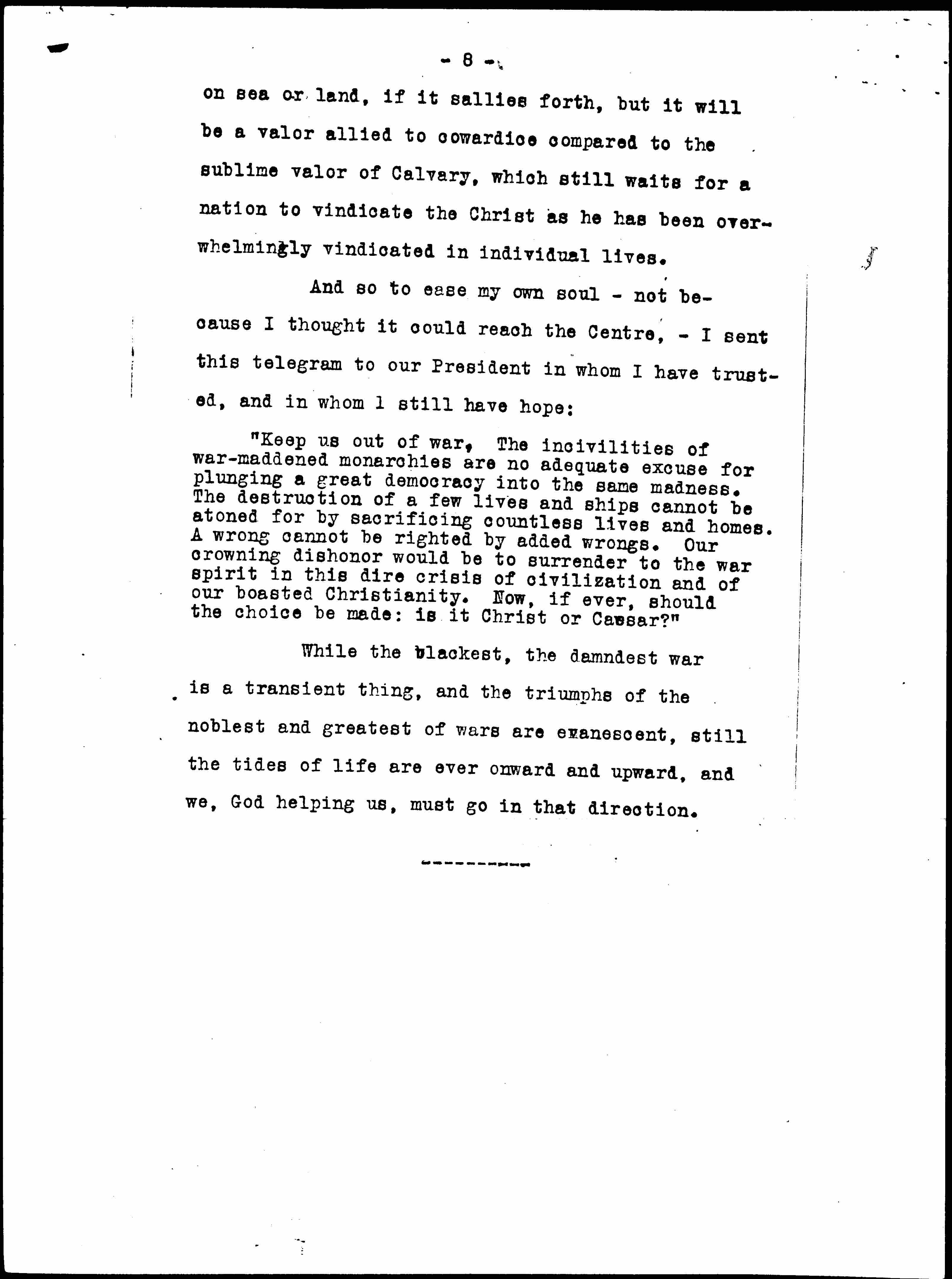 "Keep us out of war. The incivilities of war-maddened monarchies are no adequate excuse for plunging a great democracy into the same madness. The destruction of a few lives and ships cannot be atoned for by sacrificing countless lives and homes. A wrong cannot be righted by added wrongs. Our crowning dishonor would be to surrender to the war spirit in this dire crisis of civilization and of our boasted Christianity. Now, if ever, should the choice be made: is it Christ or Caesar?"