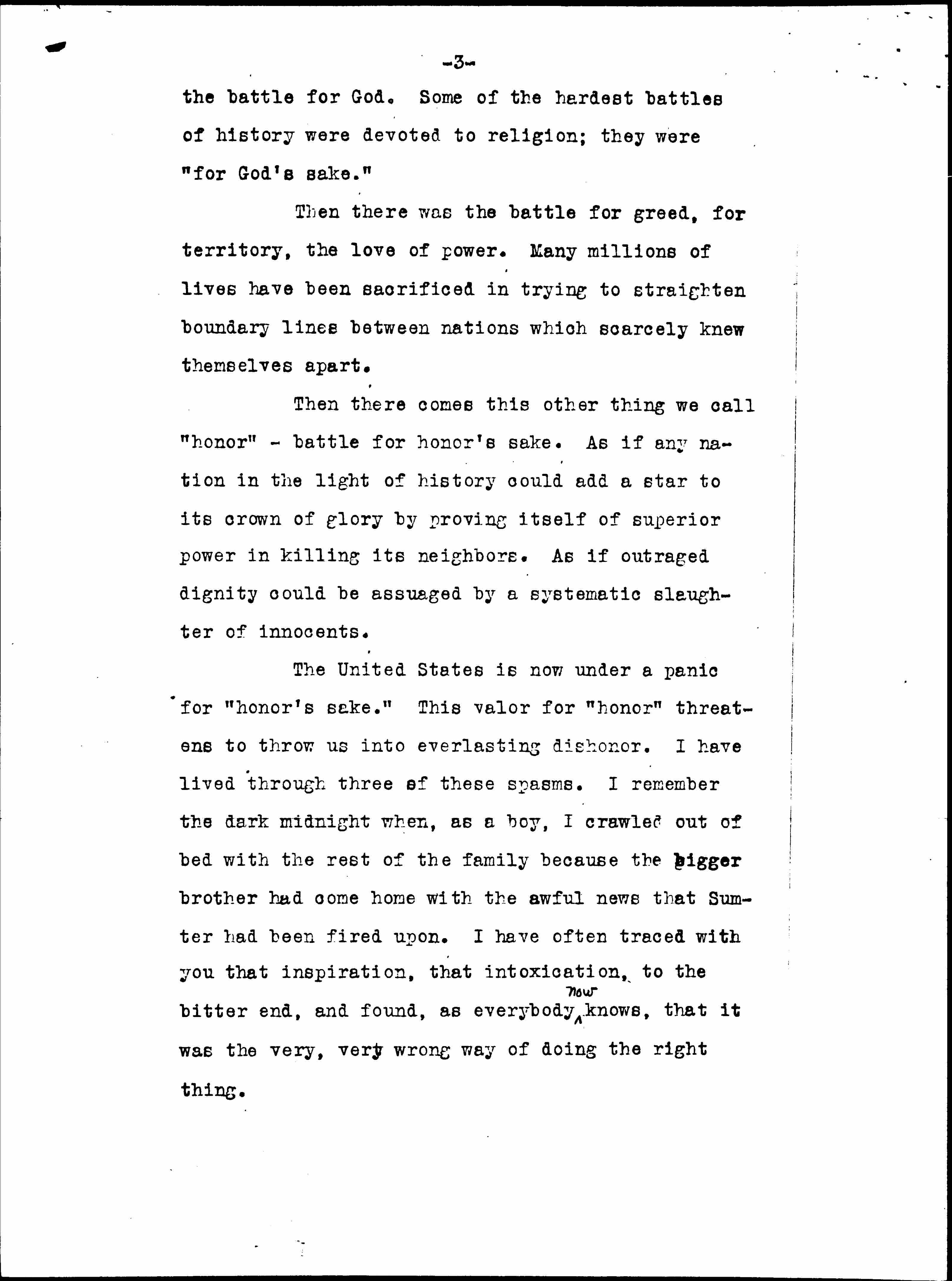 The United States is now under a panic for "honor's sake." This valor for "honor" threatens to throw us into everlasting dishonor. I have lived through three of these spasms. I remember the dark midnight when, as a boy, I crawled out of bed with the rest of the family because the bigger brother had come home with the awful news that Sumter had been fired upon. I have often traced with you that inspiration, that intoxication, to the bitter end, and found, as everybody <now> knows, that it was the very, very wrong way of doing the right thing. [page 4]