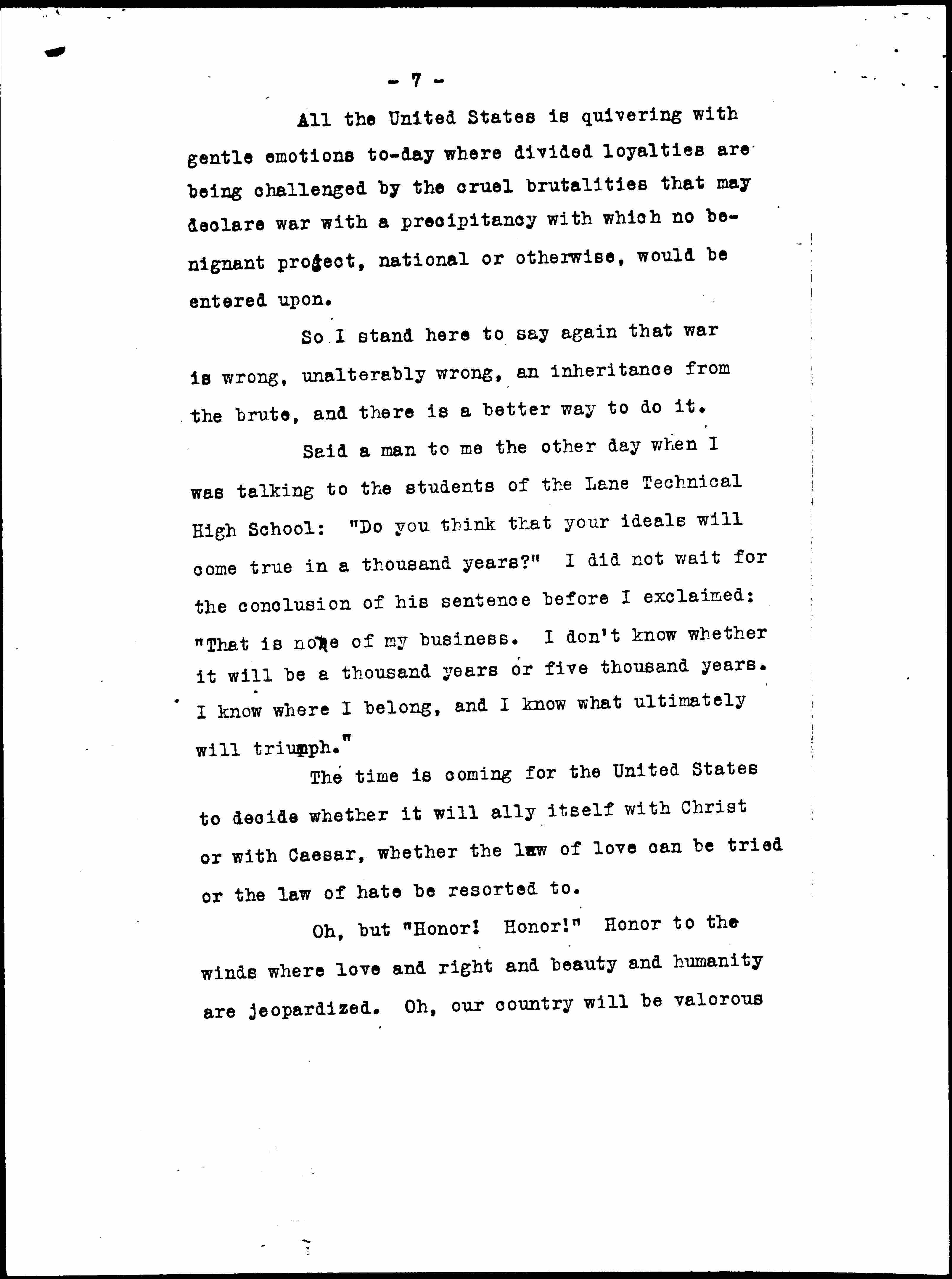 Oh, but "Honor! Honor!" Honor to the winds where love and right and beauty and humanity are jeopardized. Oh, our country will be valorous [page 8] on sea or land, if it sallies forth, but it will be a valor allied to cowardice compared to the sublime valor of Calvary, which still waits for a nation to vindicate the Christ as he has been overwhelmingly vindicated in individual lives.
