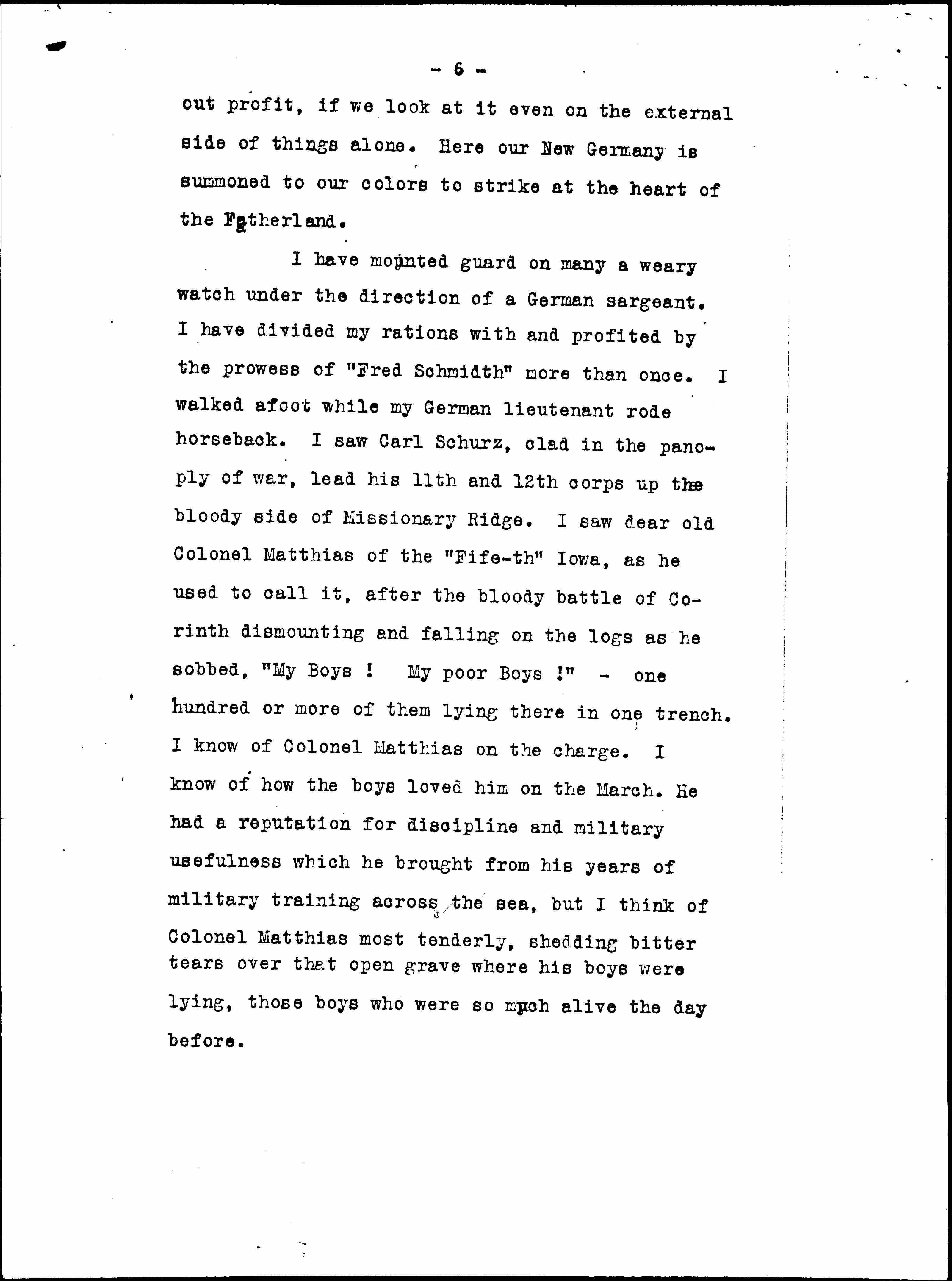 I have mounted guard on many a weary watch under the direction of a German [sergeant]. I have divided my rations with and profited by the prowess of "Fred [Schmidt]" more than once. I walked afoot while my German lieutenant rode horseback. I saw Carl Schurz, clad in the panoply of war, lead his 11th and 12th Corps up the bloody side of Missionary Ridge. I saw dear old Colonel [Matthies] of the "Fife-th" Iowa, as he used to call it, after the bloody Battle of Corinth dismounting and falling on the logs as he sobbed, "My Boys! My poor Boys!" -- one hundred or more of them lying there in one trench. I know of Colonel [Matthies] on the charge. I know of how the boys loved him on the March. He had a reputation for discipline and military usefulness which he brought from his years of military training across the sea, but I think of Colonel [Matthies] most tenderly, shedding bitter tears over that open grave where his boys were lying, those boys who were so much alive the day before. [page 7]