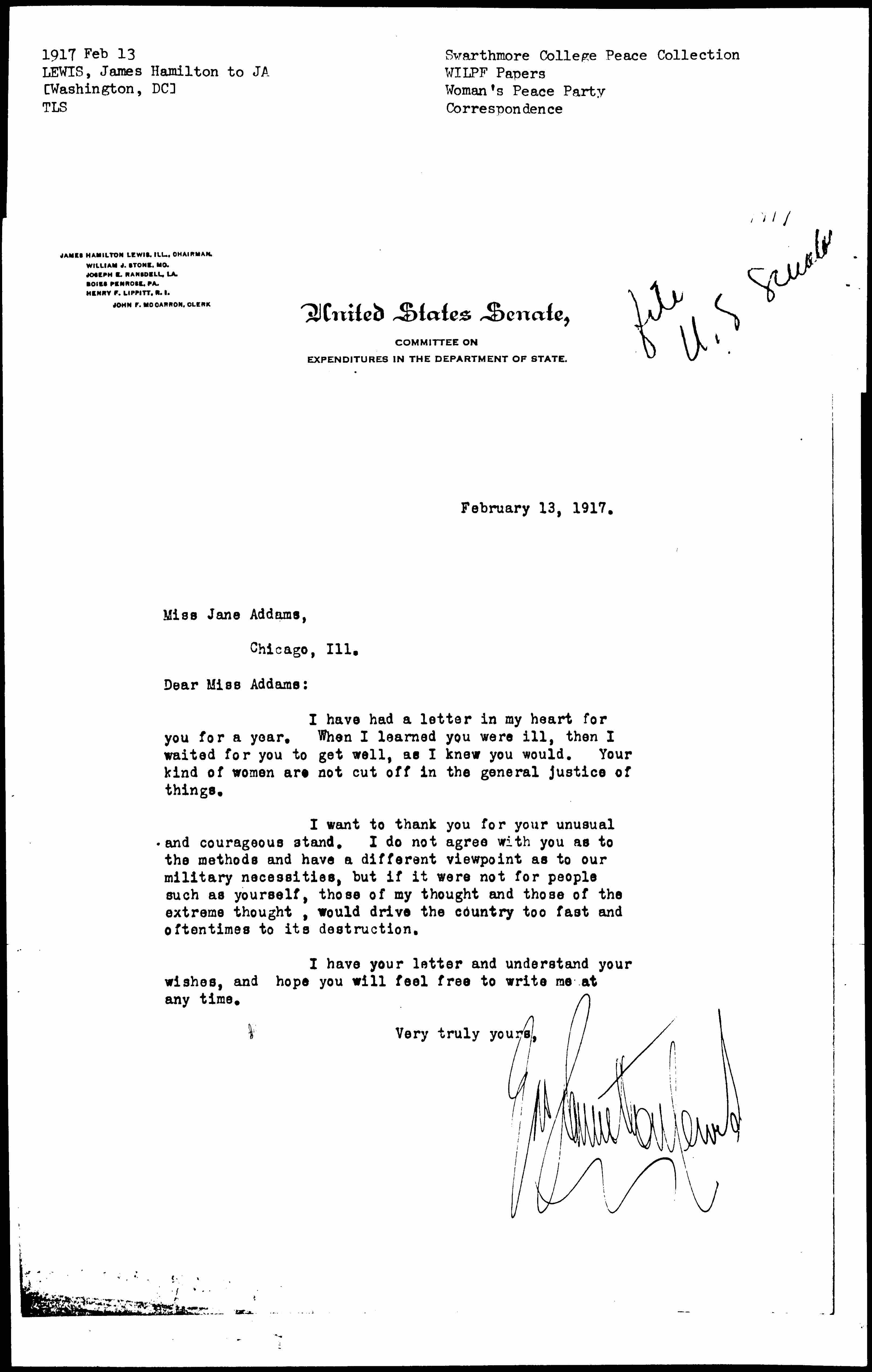I want to thank you for your unusual and courageous stand. I do not agree with you as to the methods and have a different viewpoint as to our military necessities, but if it were not for people such as yourself, those of my thought and those of the extreme thought, would drive the country too fast and oftentimes to its destruction.