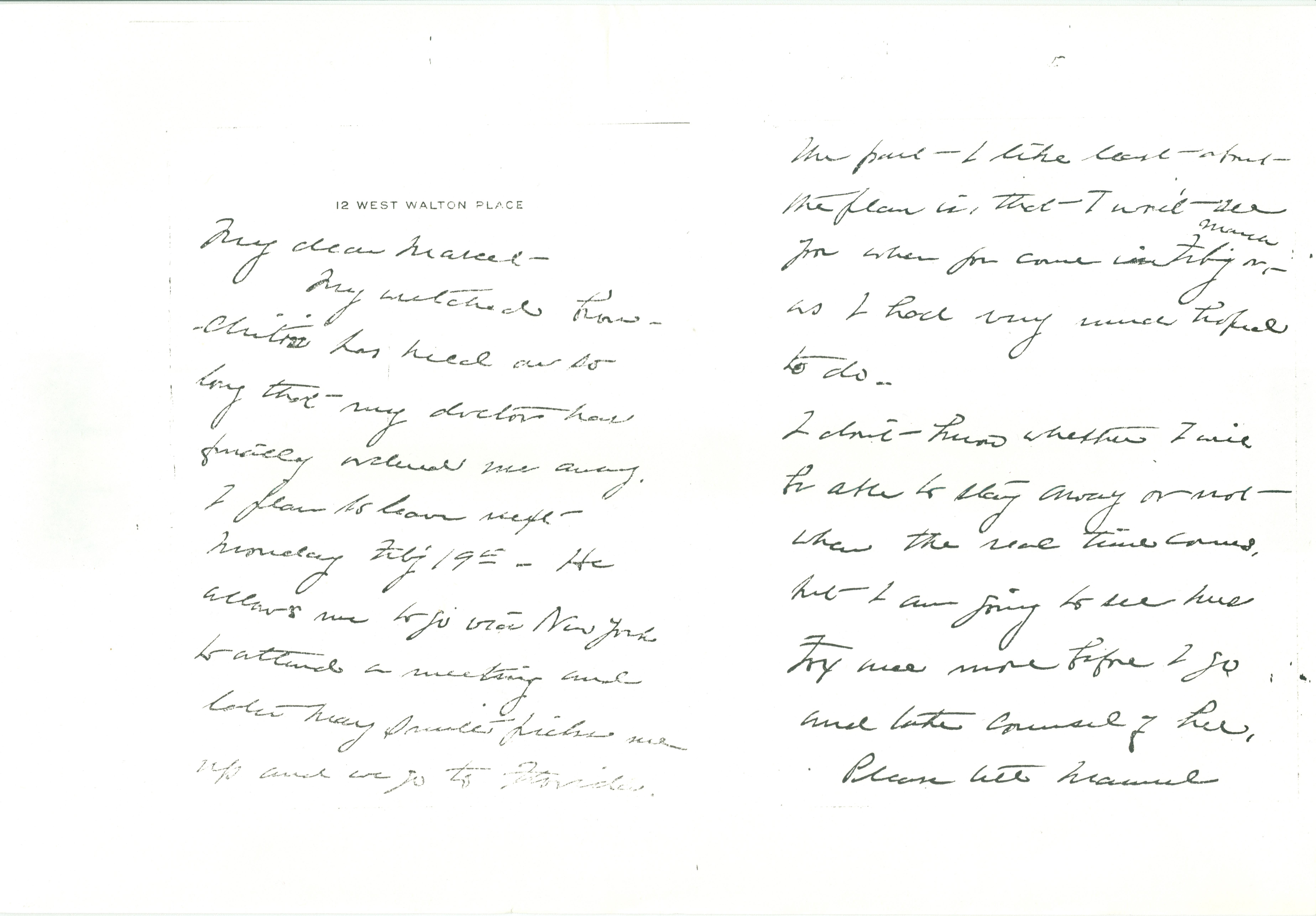 My wretched bronchitis has held on so long that my doctor has finally ordered me away. I plan to leave next Monday Feb'y 19th -- He allows me to go via New York to attend a meeting and later Mary Smith picks me up and we go to Florida. [page 2] The part I like least about the plan is, that I won't see you when you come in Feb'y or <March> as I had very much hoped to do.