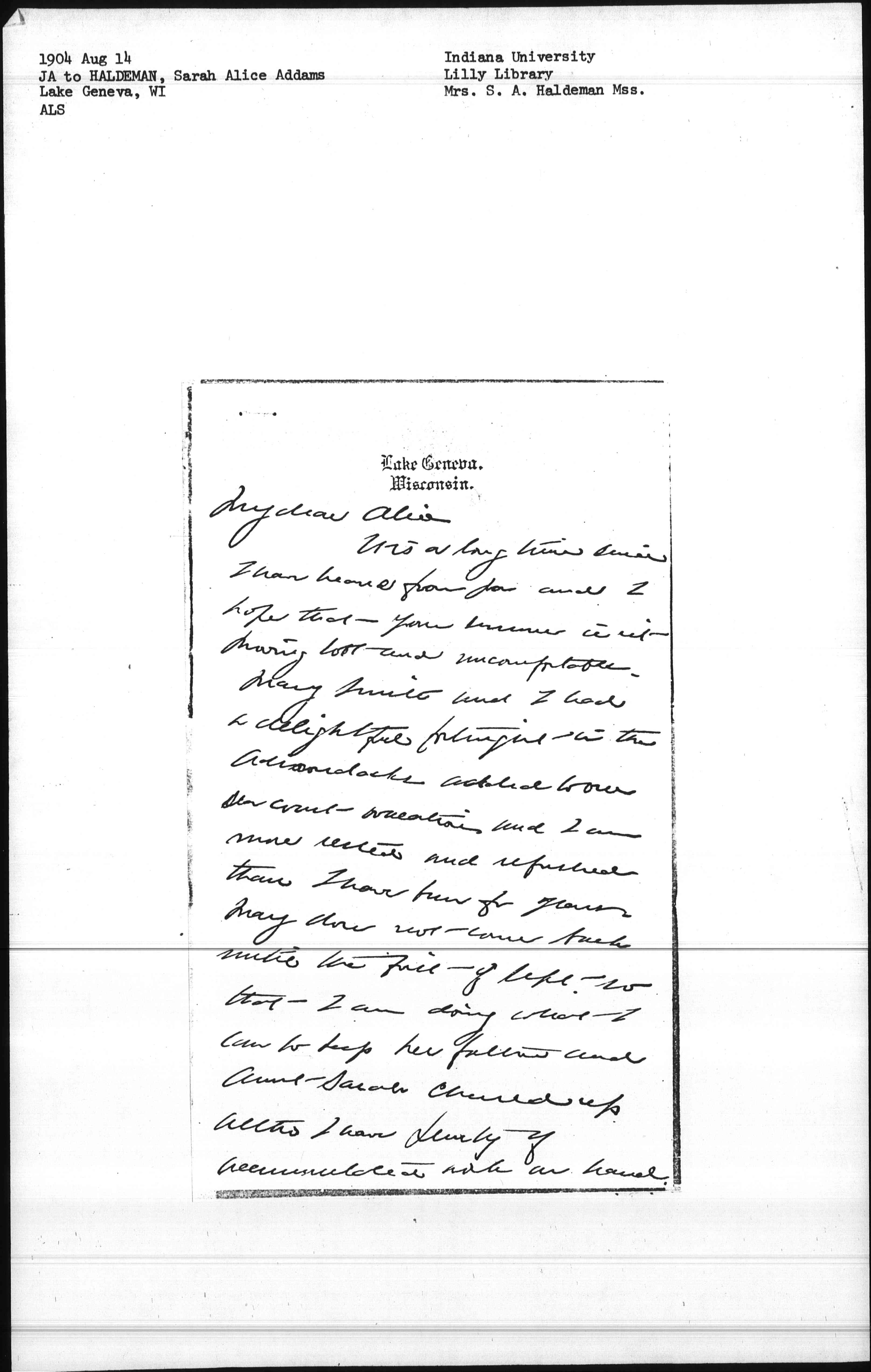 Mary Smith and I had a delightful fortnight in the Adirondacks added to our sea coast vacation and I am more rested and refreshed than I have been for years. Mary does not come back until the first of Sept. so that I am doing what I can to keep her father and Aunt Sarah cheered up [although] I have plenty of accumulated work on hand. [page 2] The new building is begun and promises to add greatly to the equipment. I am spending Sunday in this delightful spot with Mrs Wilmarth and we are together seeing some people who are interested in the Nursery plans.