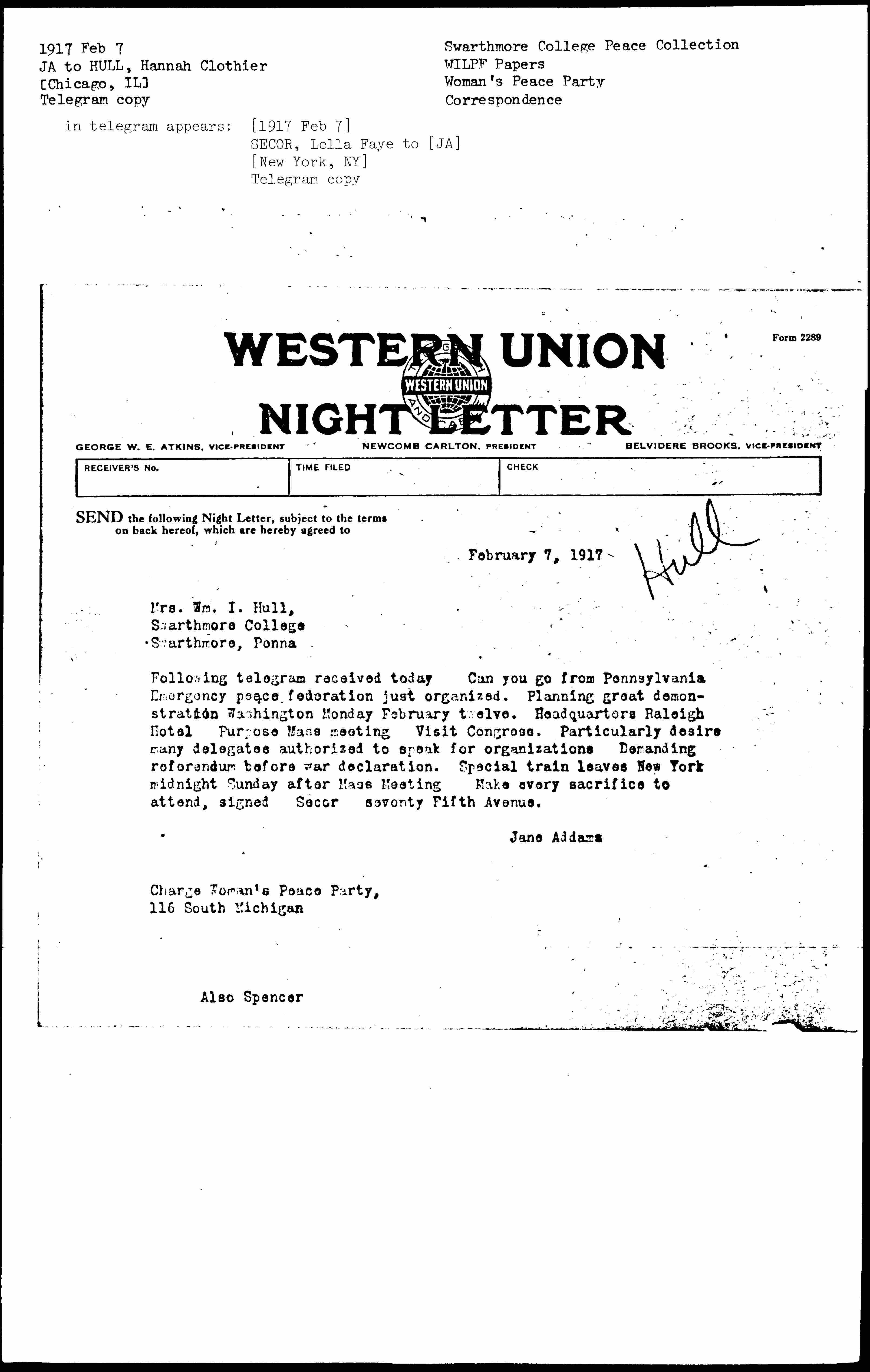Following telegram received today. Can you go from Pennsylvania Emergency peace federation just organized. Planning great demonstration Washington Monday February twelve. Headquarters Raleigh Hotel. Purpose Mass meeting. Visit Congress. Particularly desire many delegates authorized to speak for organizations. Demanding referendum before war declaration. Special train leaves New York midnight Sunday after Mass Meeting. Make every sacrifice to attend, signed Secor seventy Fifth Avenue.