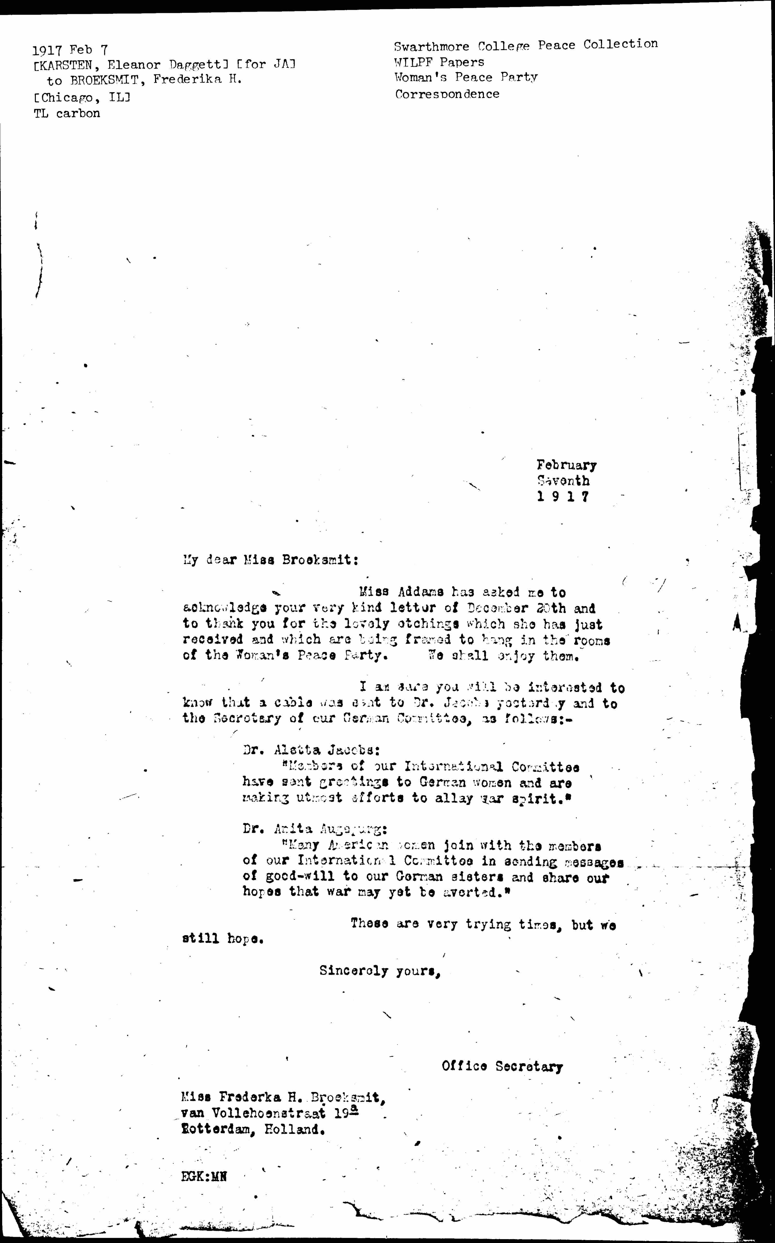"Members of our International Committee have sent greetings to German women and are making utmost efforts to allay war spirit."