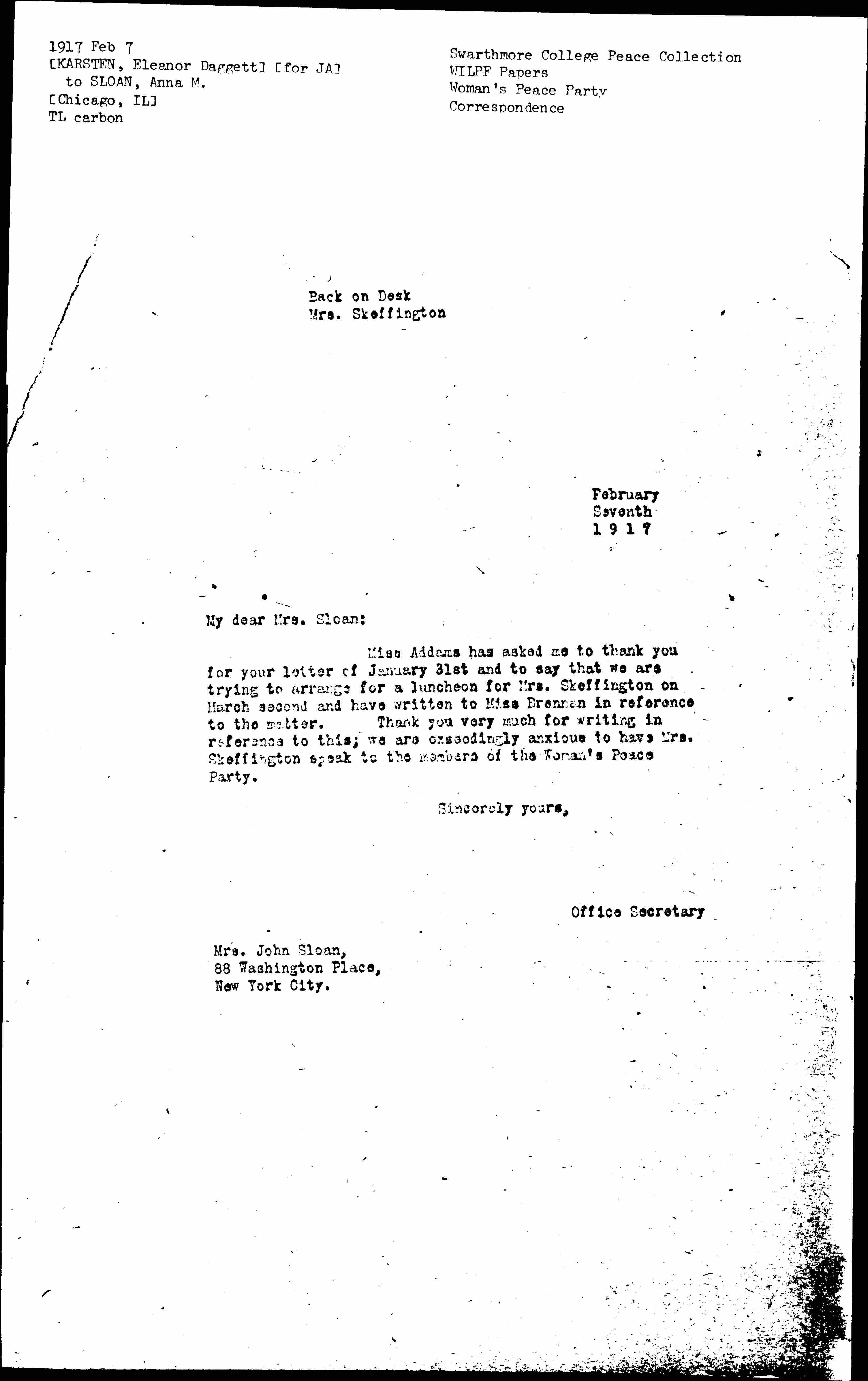 Miss Addams has asked me to thank you for your letter of January 31st and to say that we are trying to arrange for a luncheon for Mrs. Skeffington on March second and have written to Miss Brennan in reference to the matter. Thank you very much for writing in reference to this; we are exceedingly anxious to have Mrs. Skeffington speak to the members of the Woman's Peace Party.