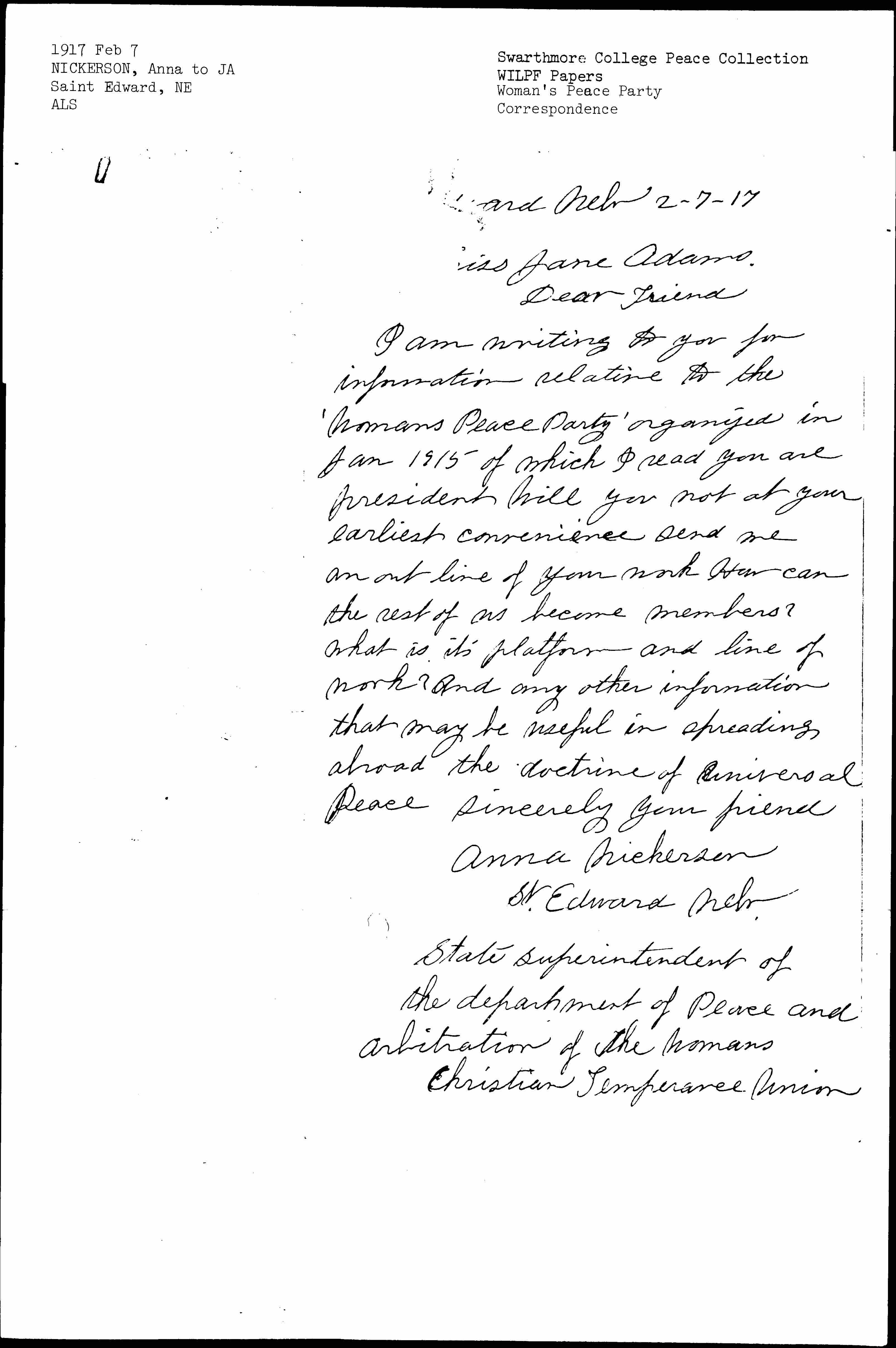 I am writing to you for information relative to the 'Womans Peace Party' organized in Jan 1915 of which I read you are president. Will you not at your earliest convenience send me an [outline] of your work. How can the rest of us become members? What is its platform and line of work? And any other information that may be useful in spreading abroad the doctrine of universal Peace Sincerely your friend