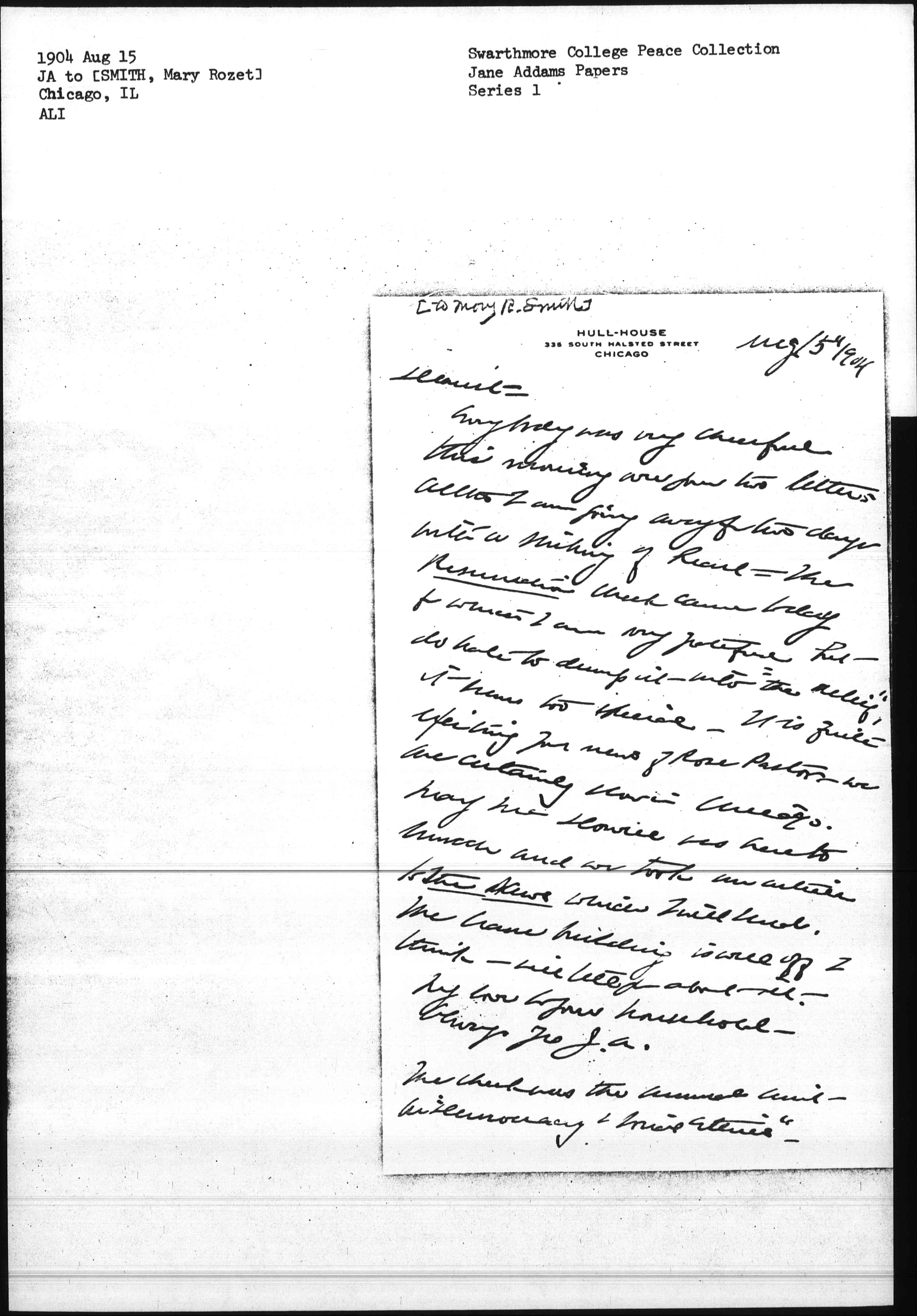Everybody was very cheerful this morning over your two letters [although] I am going away for two days with a sinking of heart. The Resurrection check came today for which I am very grateful but do hate to dump it into "the relief," it seems too special. It is quite exciting your news of Rose Pastor--we are certainly slow in Chicago. Mary McDowell was here to lunch and we took an article to The News which I will send. The Crane building is well off I think—will tell you about it.