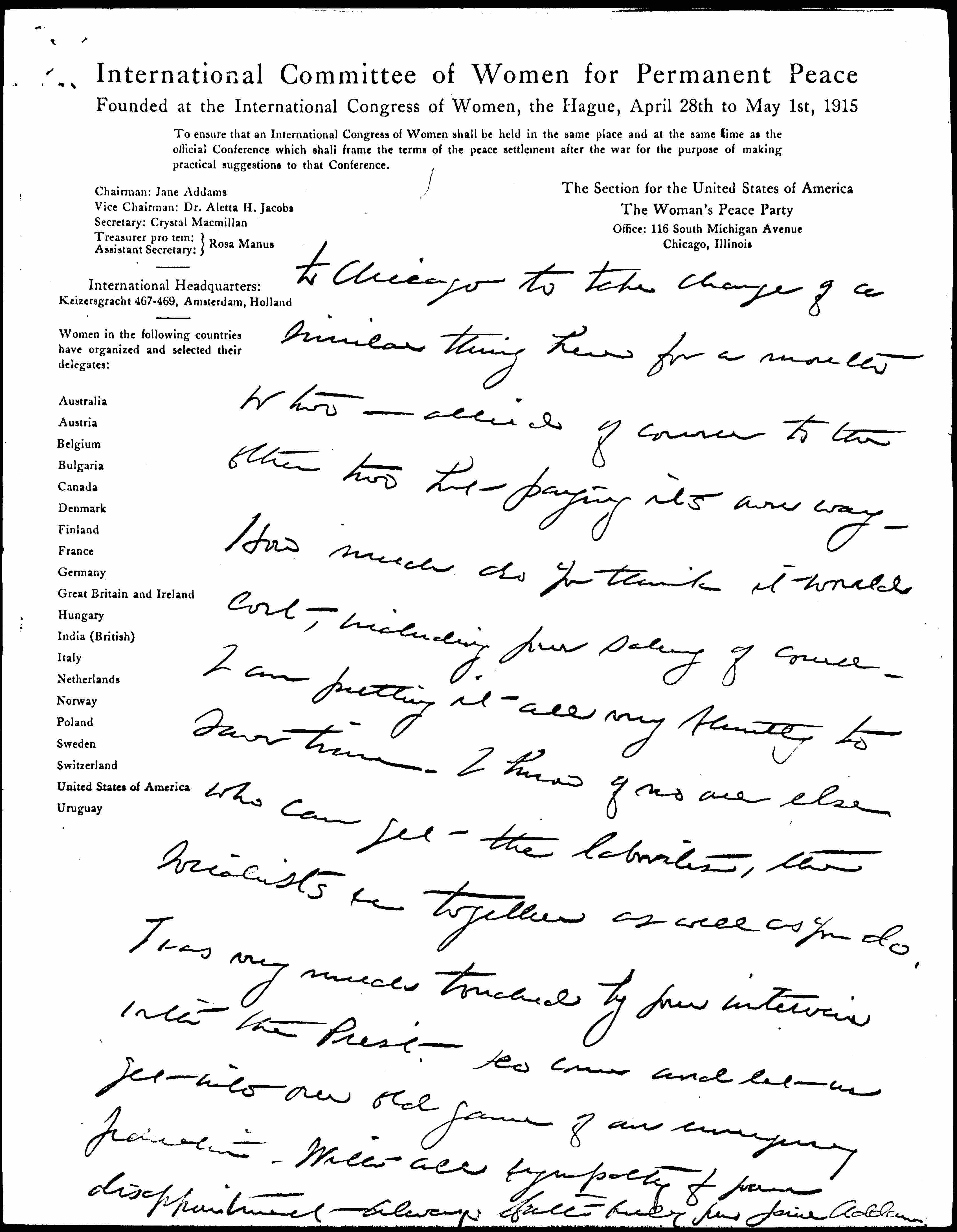 In case there is no opening with the N.Y or Washington body, would you come [page 2] to Chicago to take charge of a similar thing here for a month or two -- allied of course to the other two but paying its own way. How much do you think it would cost, including your salary of course. I am putting it all very bluntly to save time. I know of no one else who can get the [laborites], the socialists [etc.] together as well as you do.