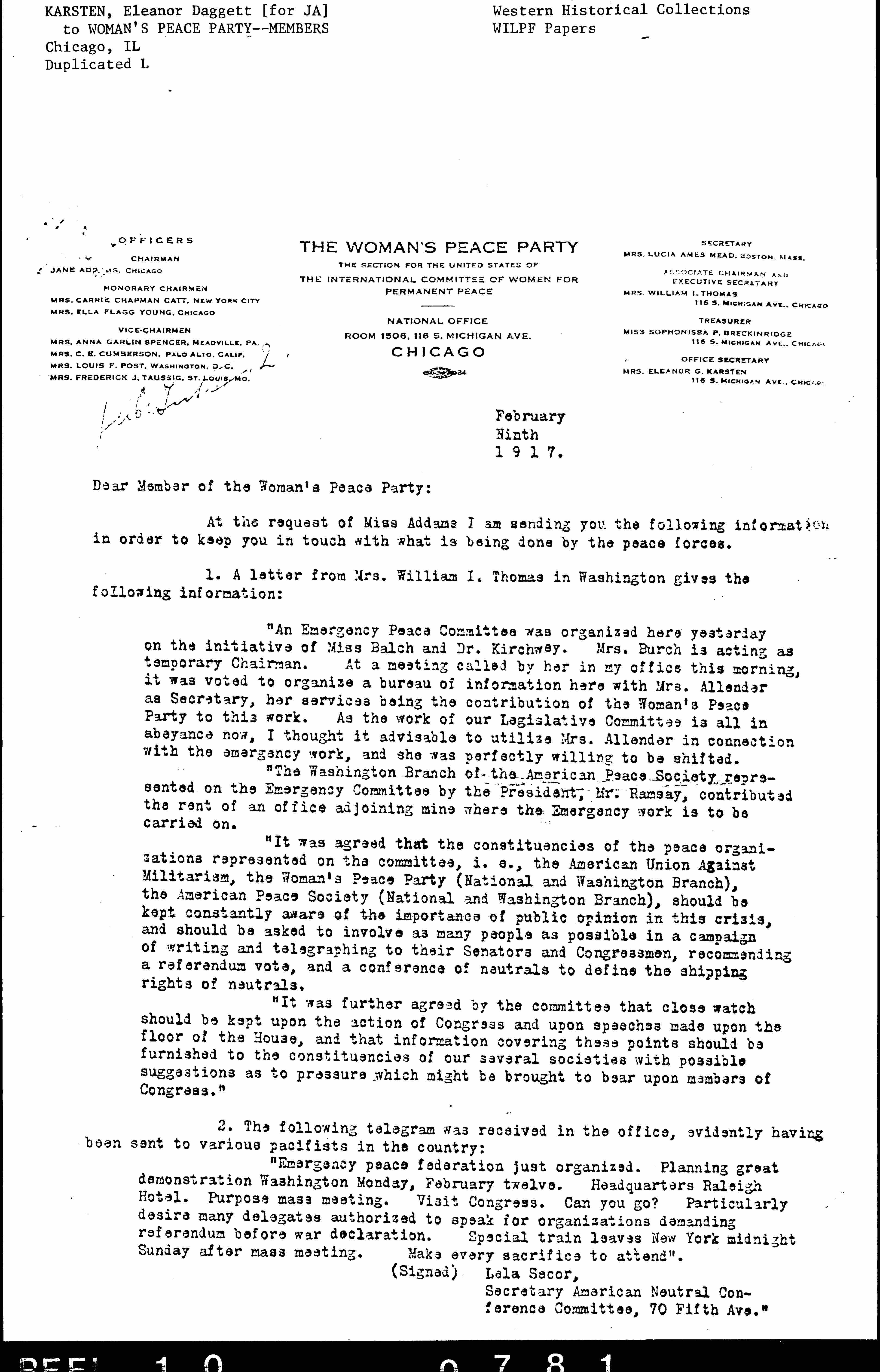 At the request of Miss Addams I am sending you the following information in order to keep you in touch with what is being done by the peace forces.