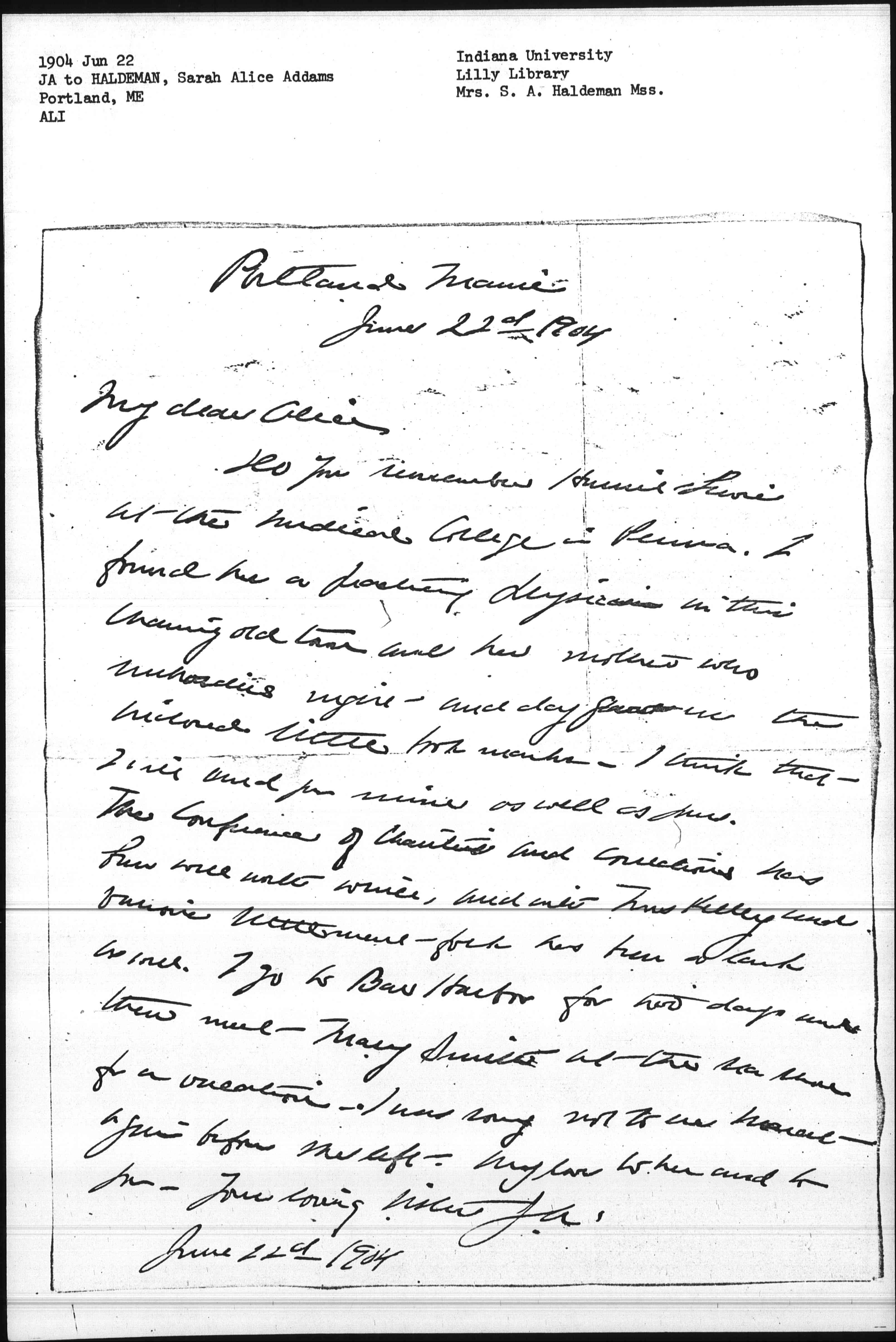 The Conference of Charities and Corrections has been well worth while, and [illegible] Mrs Kelley and various settlement folk has been a lark as well. I go to Bar Harbor for two days and then meet Mary Smith at the sea shore for a vacation. I was sorry not to see Marcet again before she left. My love to her and to you. Your loving sister JA