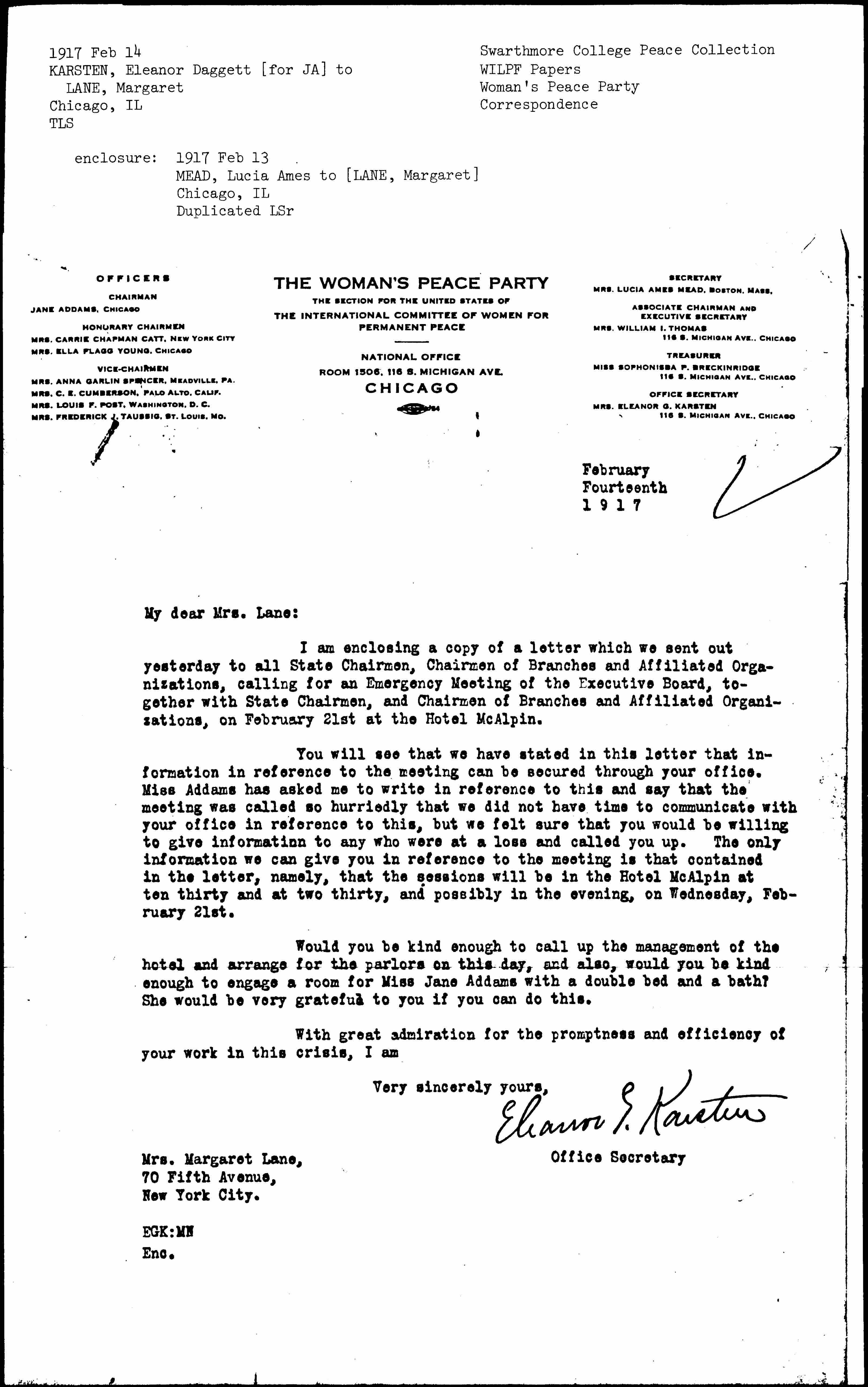 You will see that we have stated in this letter that information in reference to the meeting can be secured through your office. Miss Addams has asked me to write in reference to this and say that the meeting was called so hurriedly that we did not have time to communicate with your office in reference to this, but we felt sure that you would be willing to give information to any who were at a loss and called you up. The only information we can give you in reference to the meeting is that contained in the letter, namely, that the sessions will be in the Hotel McAlpin at ten thirty and at two thirty, and possibly in the evening, on Wednesday, February 21st.