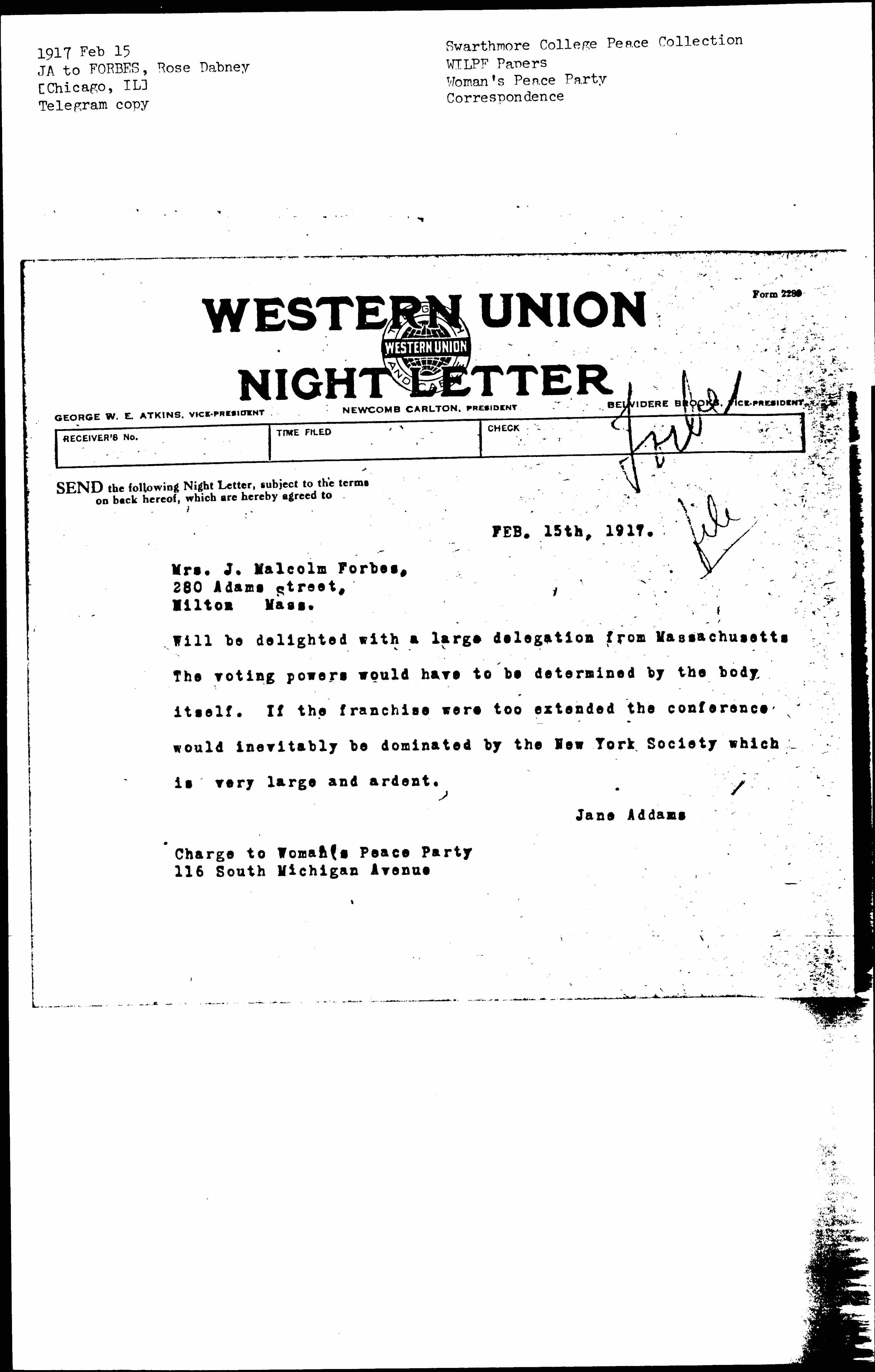 Will be delighted with a large delegation from Massachusetts. The voting powers would have to be determined by the body itself. If the franchise were too extended the conference would inevitably be dominated by the New York Society which is very large and ardent.