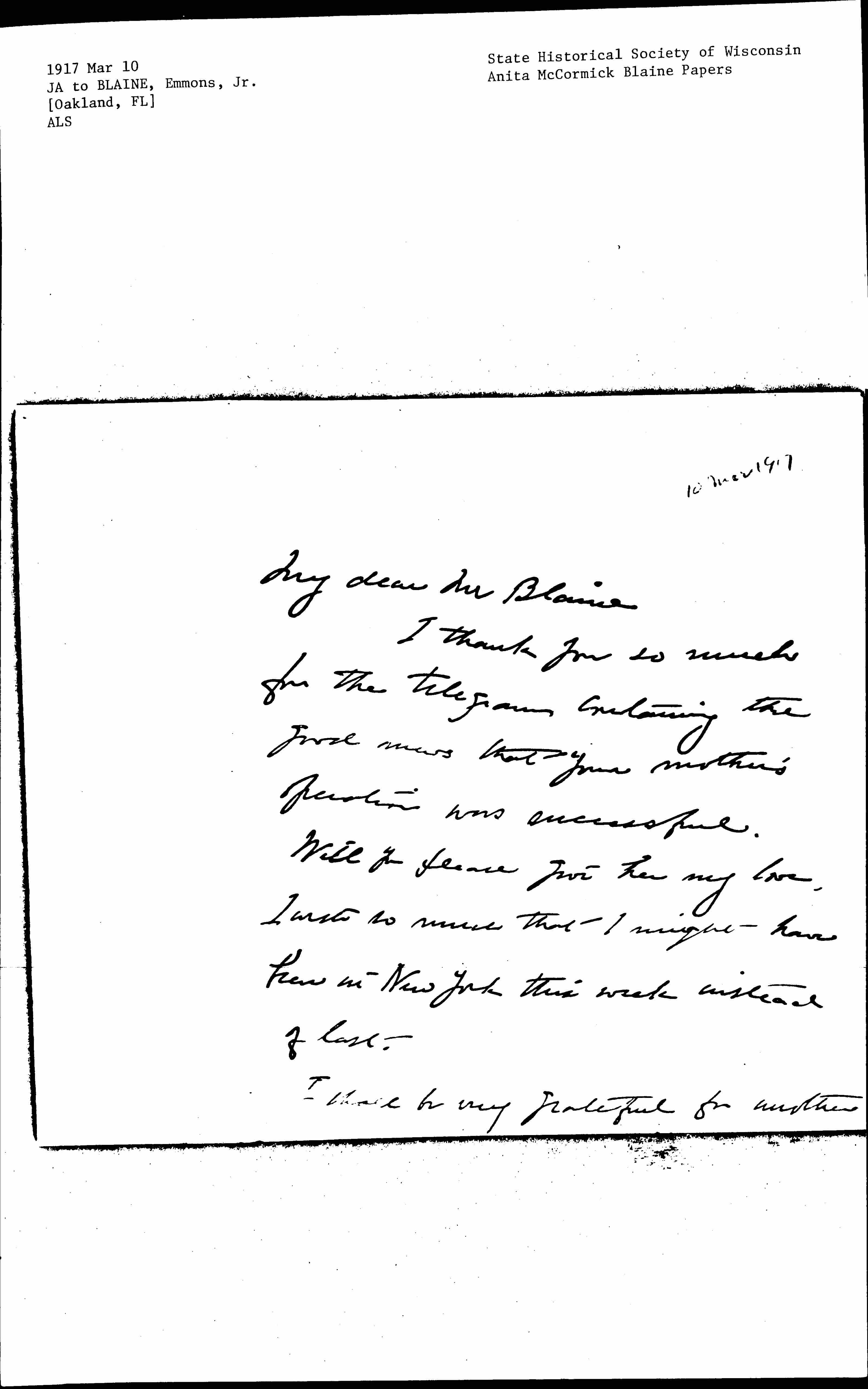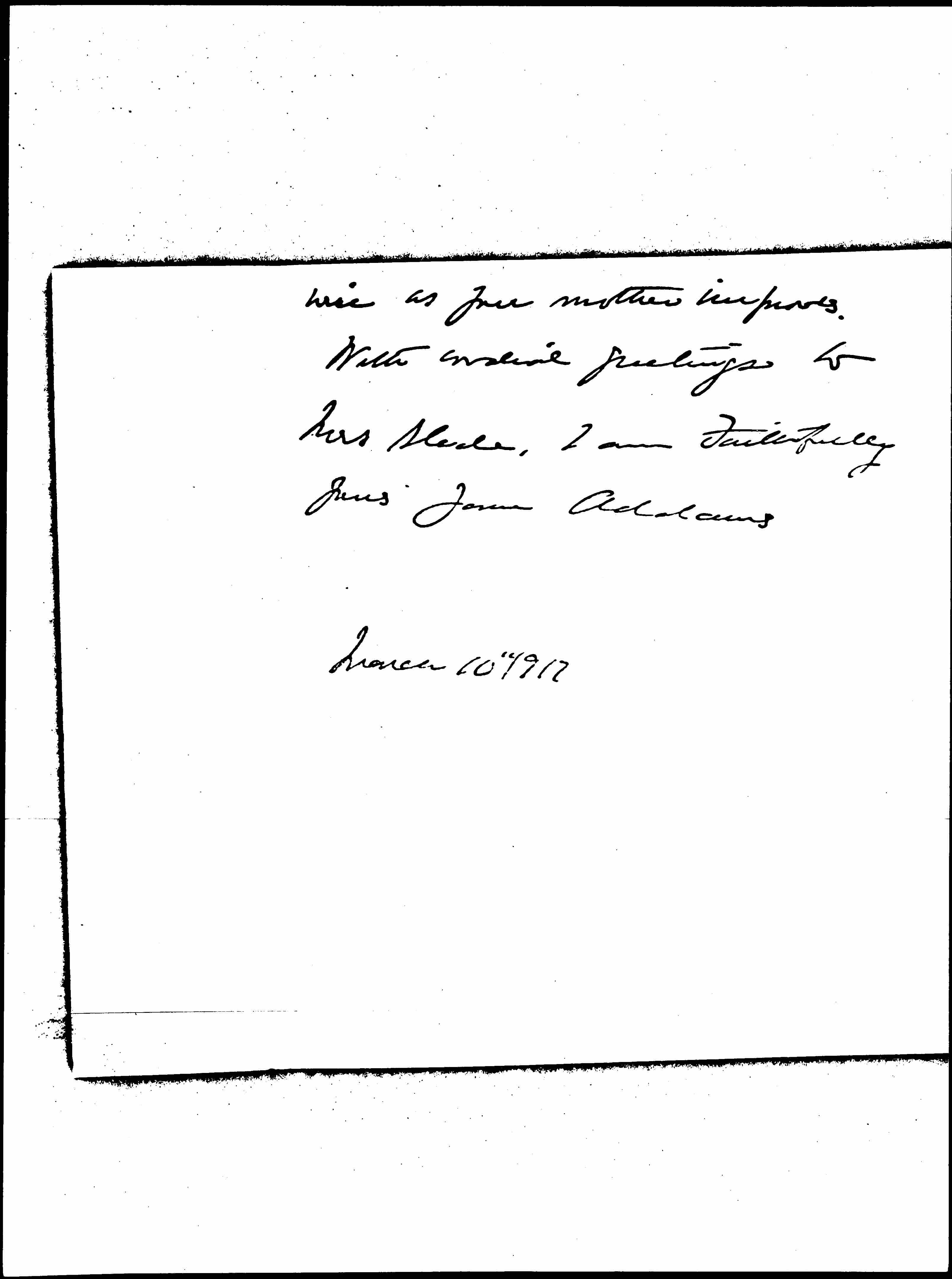 With cordial greetings to Mrs Slade, I am Faithfully yours Jane Addams