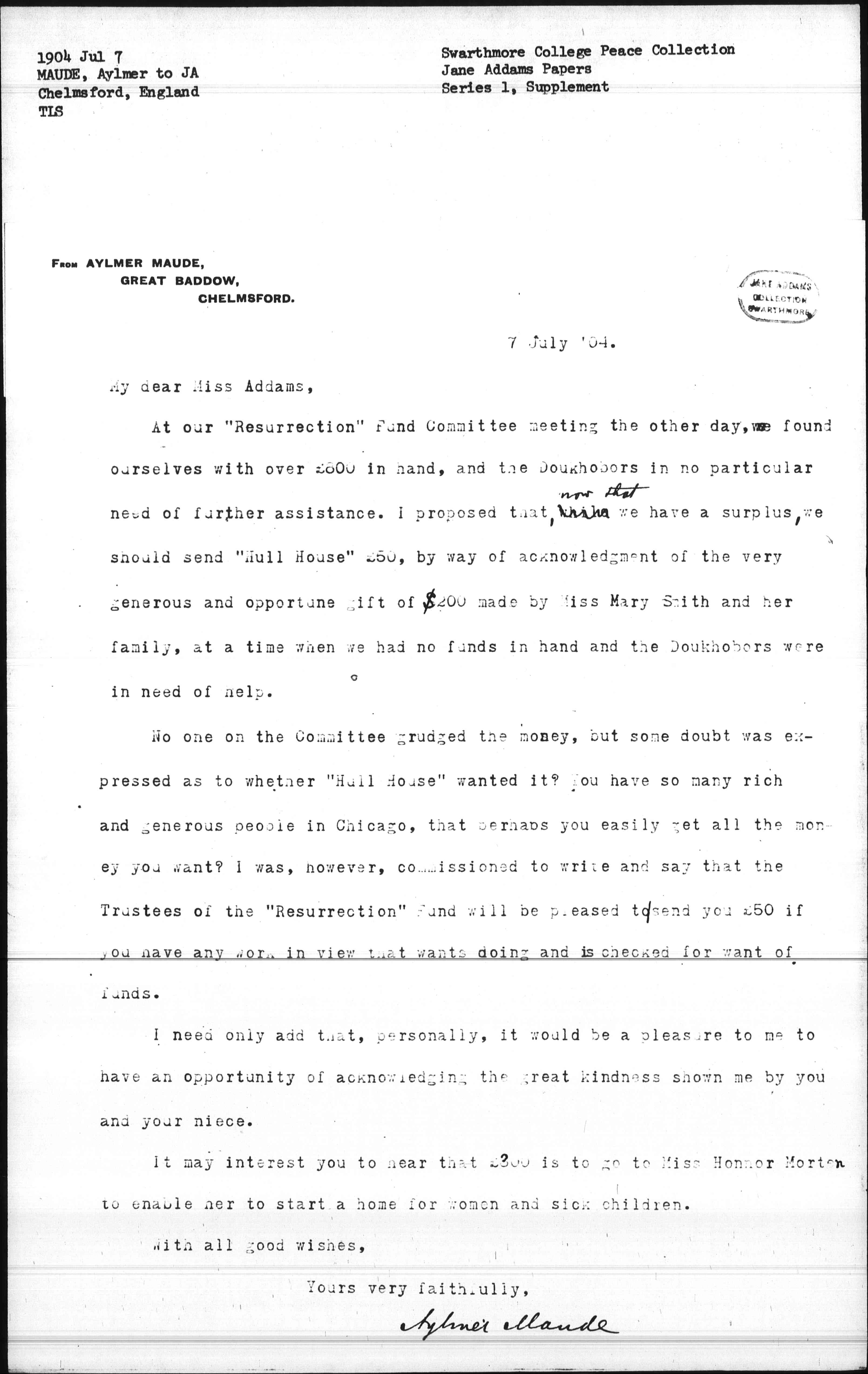 At our "Resurrection" fund Committee meeting the other day, we found ourselves with over £600 in hand, and the Doukhobors in no particular need of further assistance. I proposed that, while ↑now that↓ we have a surplus, we should send "Hull House" £50, by way of acknowledgement of the very generous and opportune gift of $200 made by Miss Mary Smith and her family, at a time when we had no funds in hand and the Doukhobors were in need of help.