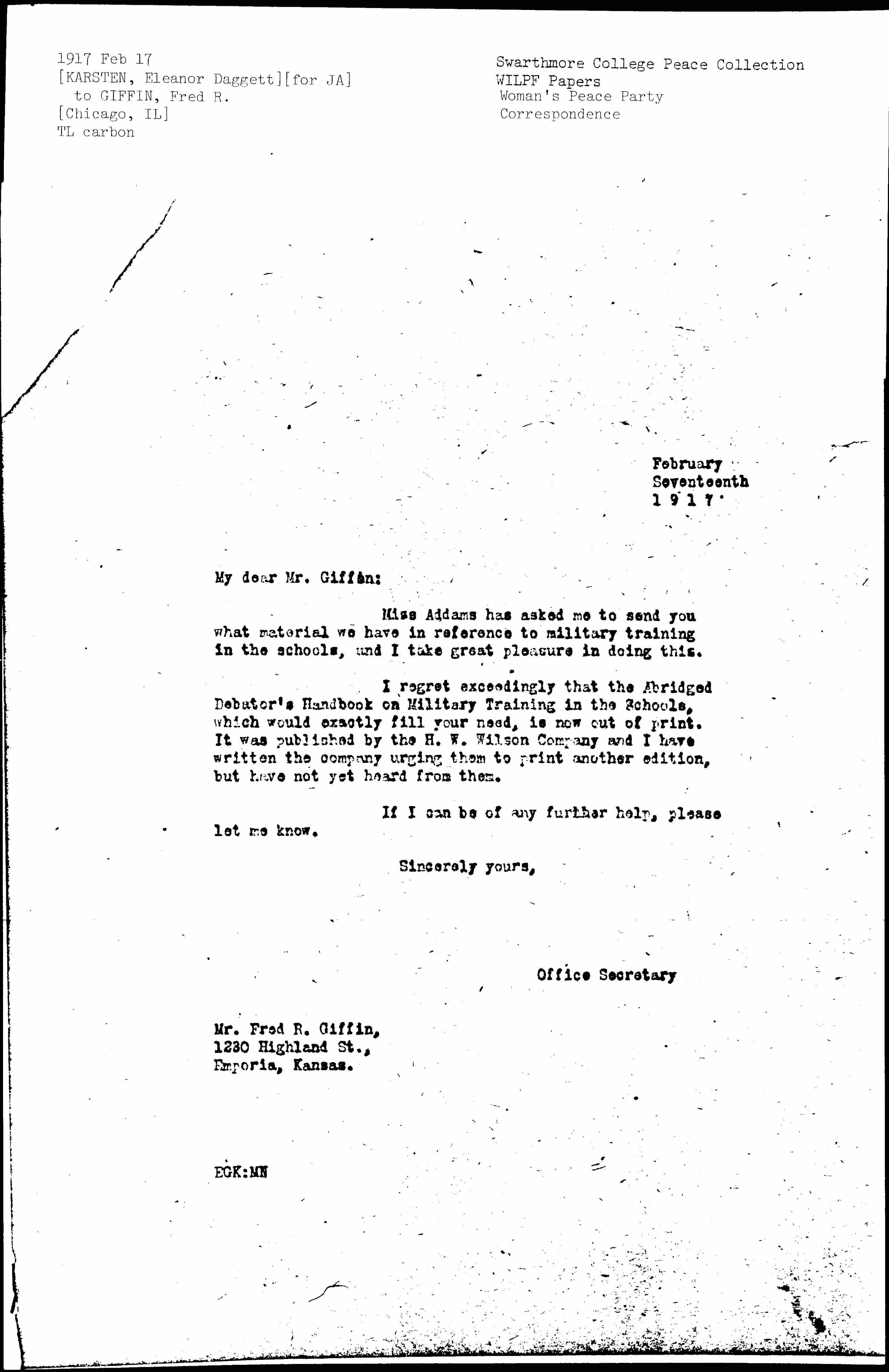 Miss Addams has asked me to send you what material we have in reference to military training in the schools, and I take great pleasure in doing this.