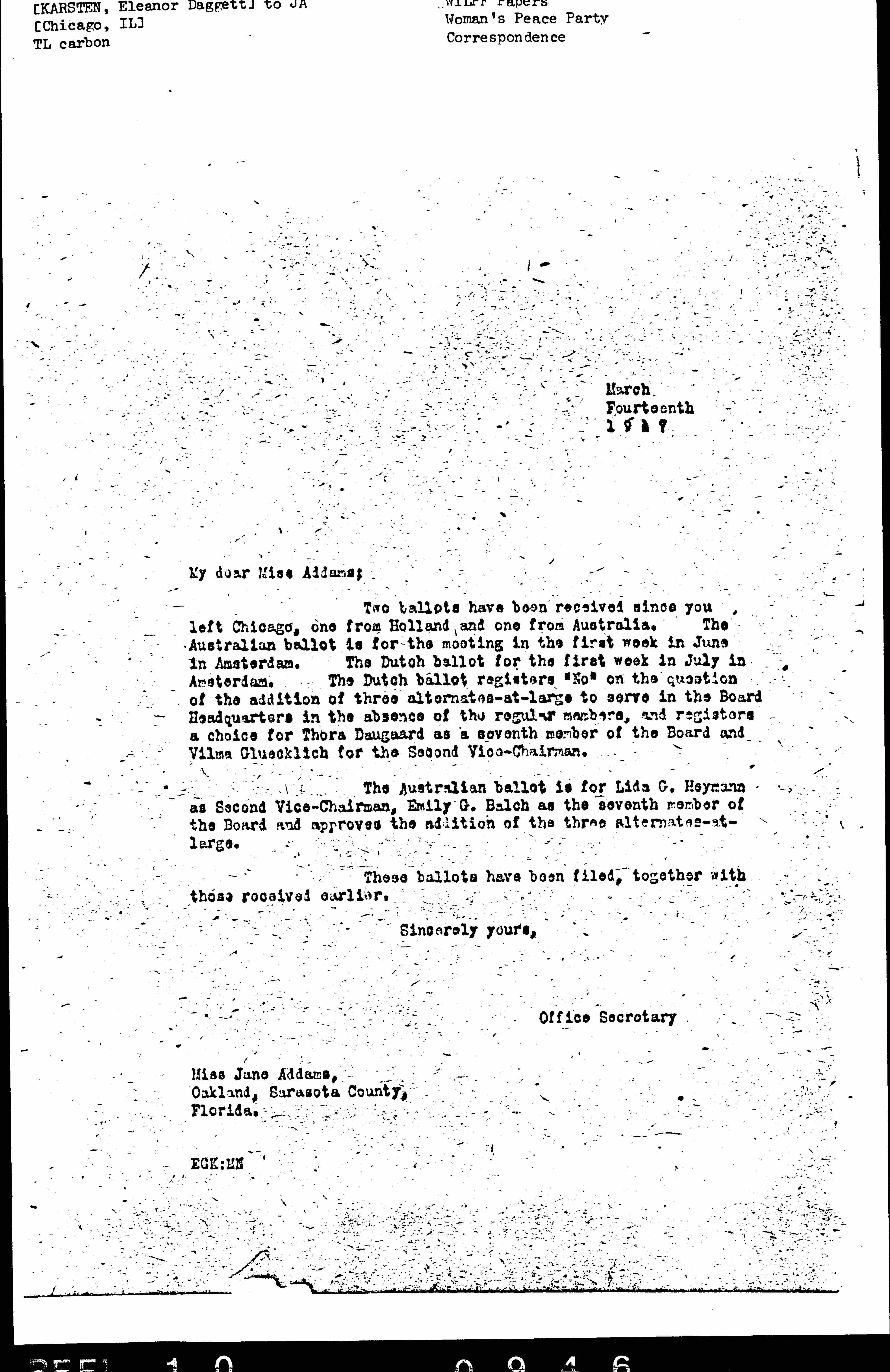 Two ballots have been received since you left Chicago, one from Holland and one from Australia. The Australian ballot is for the meeting in the first week in June in Amsterdam. The Dutch ballot for the first week in July in Amsterdam. The Dutch ballot registers "No" on the question of the addition of three alternates-at-large to serve in the Board Headquarters in the absence of the regular members, and registers a choice for Thora Daugaard as a seventh member of the Board and Vilma [Glücklich] for the Second Vice-Chairman.