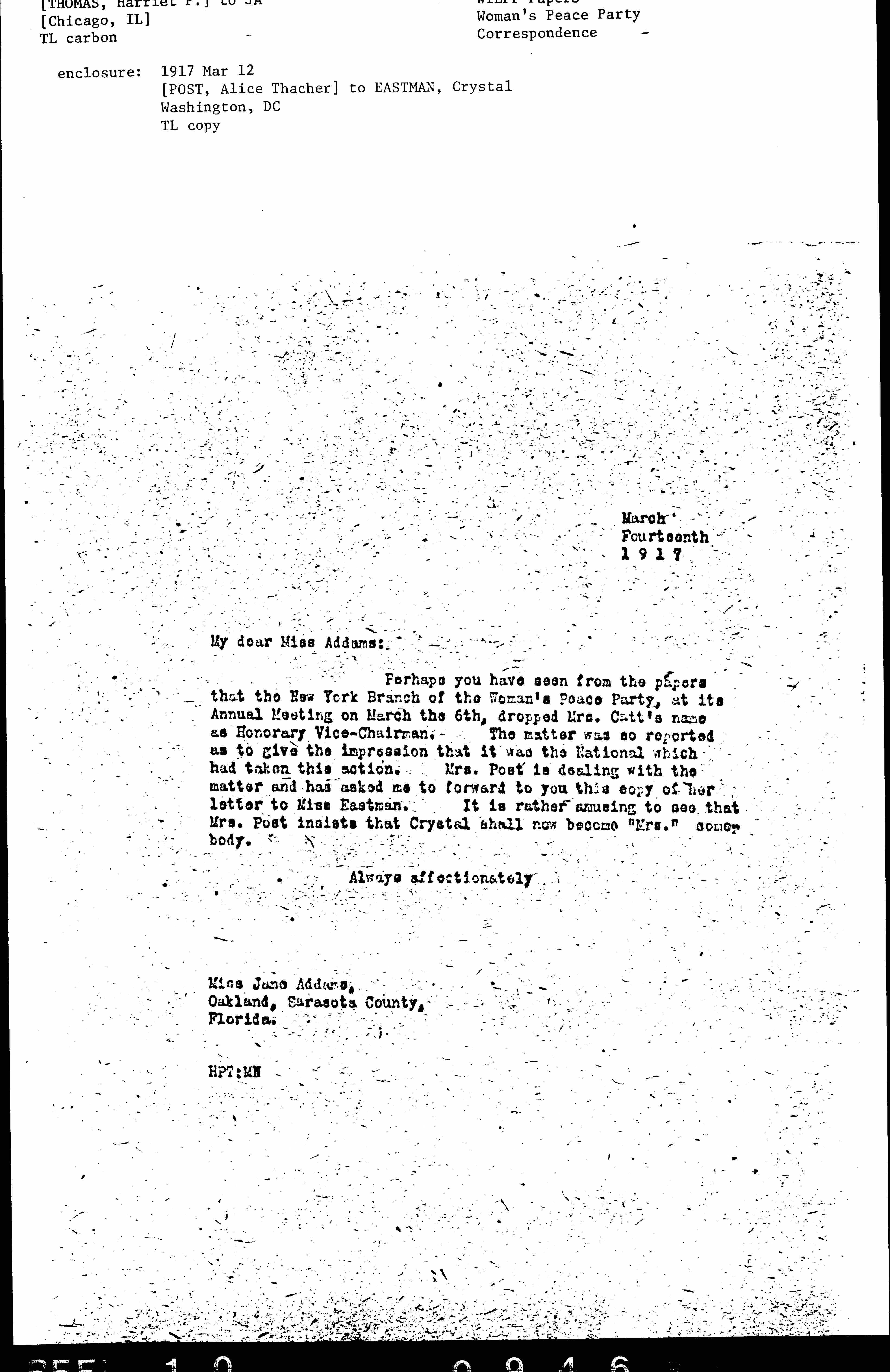 Perhaps you have seen from the papers that the New York Branch of the Woman's Peace Party, at its Annual Meeting on March the 6th, dropped Mrs. Catt's name as Honorary Vice-Chairman. The matter was so reported as to give the impression that it was the National which had taken this action. Mrs. Post is dealing with the matter and has asked me to forward you this copy of her letter to Miss Eastman. It is rather amusing to see that Mrs. Post insists that Crystal shall now become "Mrs." somebody.