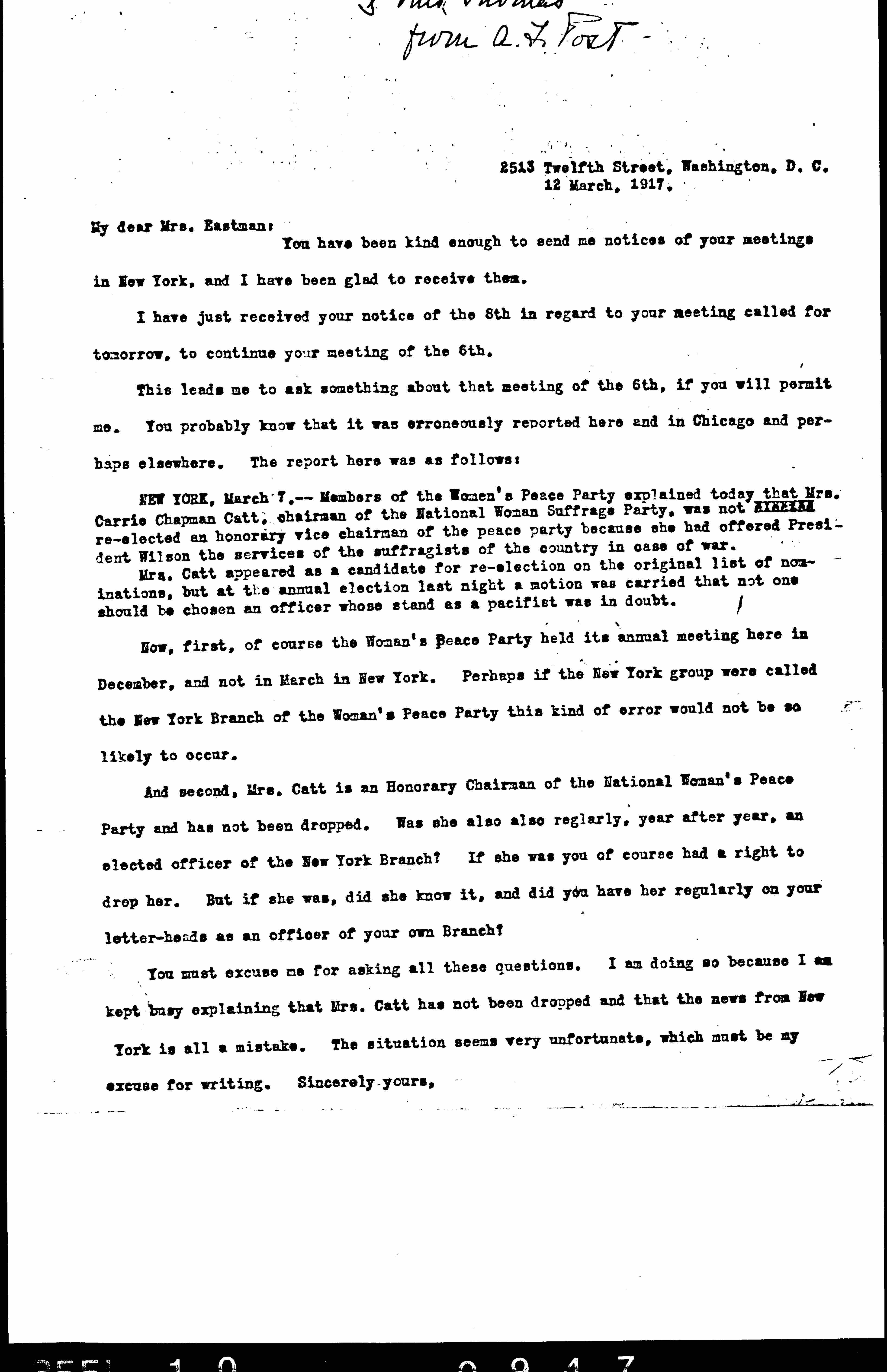 And second, Mrs. Catt is an Honorary Chairman of the National Woman's Peace Party and has not been dropped. Was she also [regularly], year after year, an elected officer of the New York Branch? If she was you of course had a right to drop her. But if she was, did she know it, and did you have her regularly on you letter-heads as an officer of your own Branch?