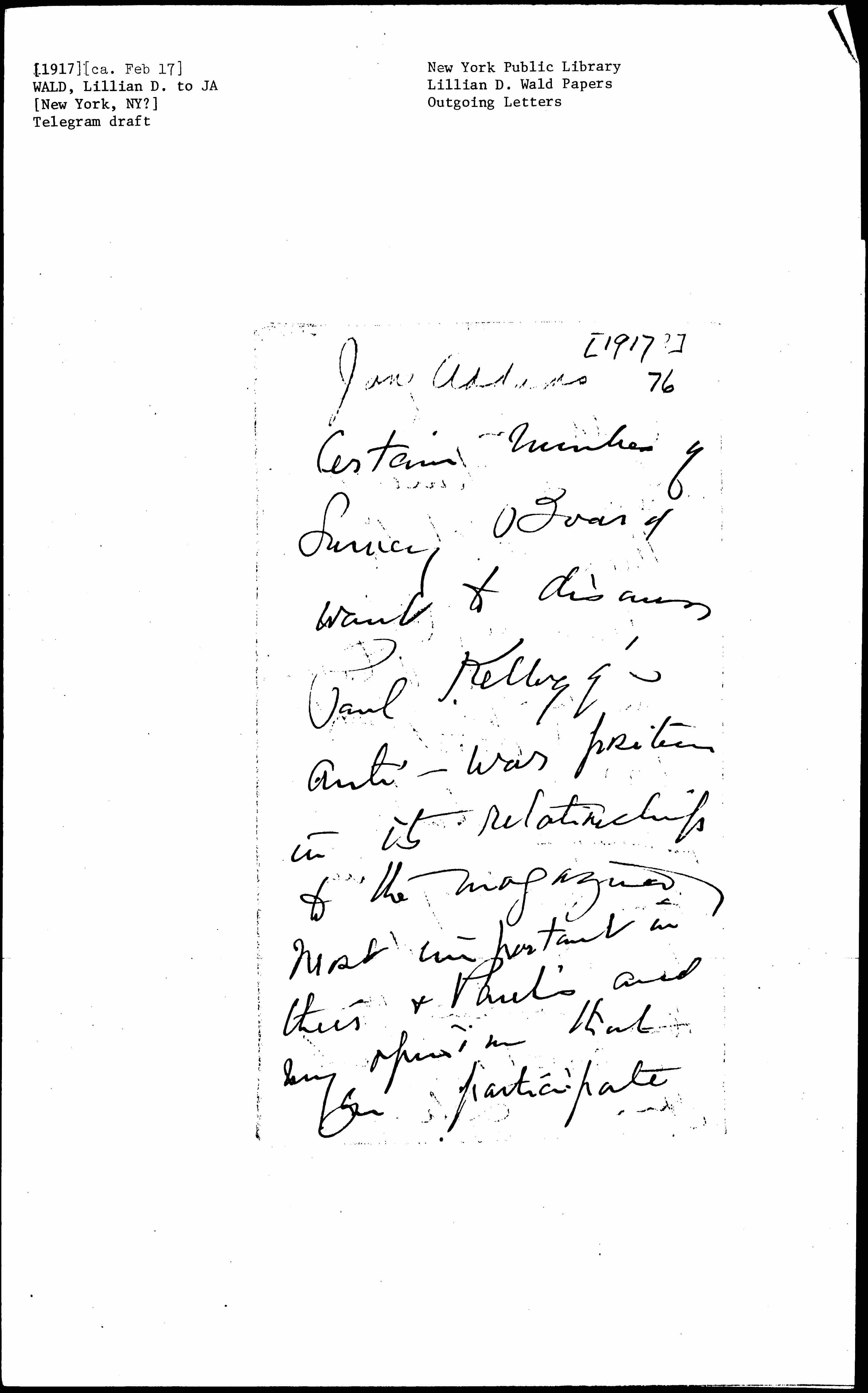 Could you be here in time for three o'clock Tuesday (2 meeting. Please wire directly that Kellogg ↑[illegible]↓ that me meeting may be arranged. What train you [illegible]. Love to you. Lillian