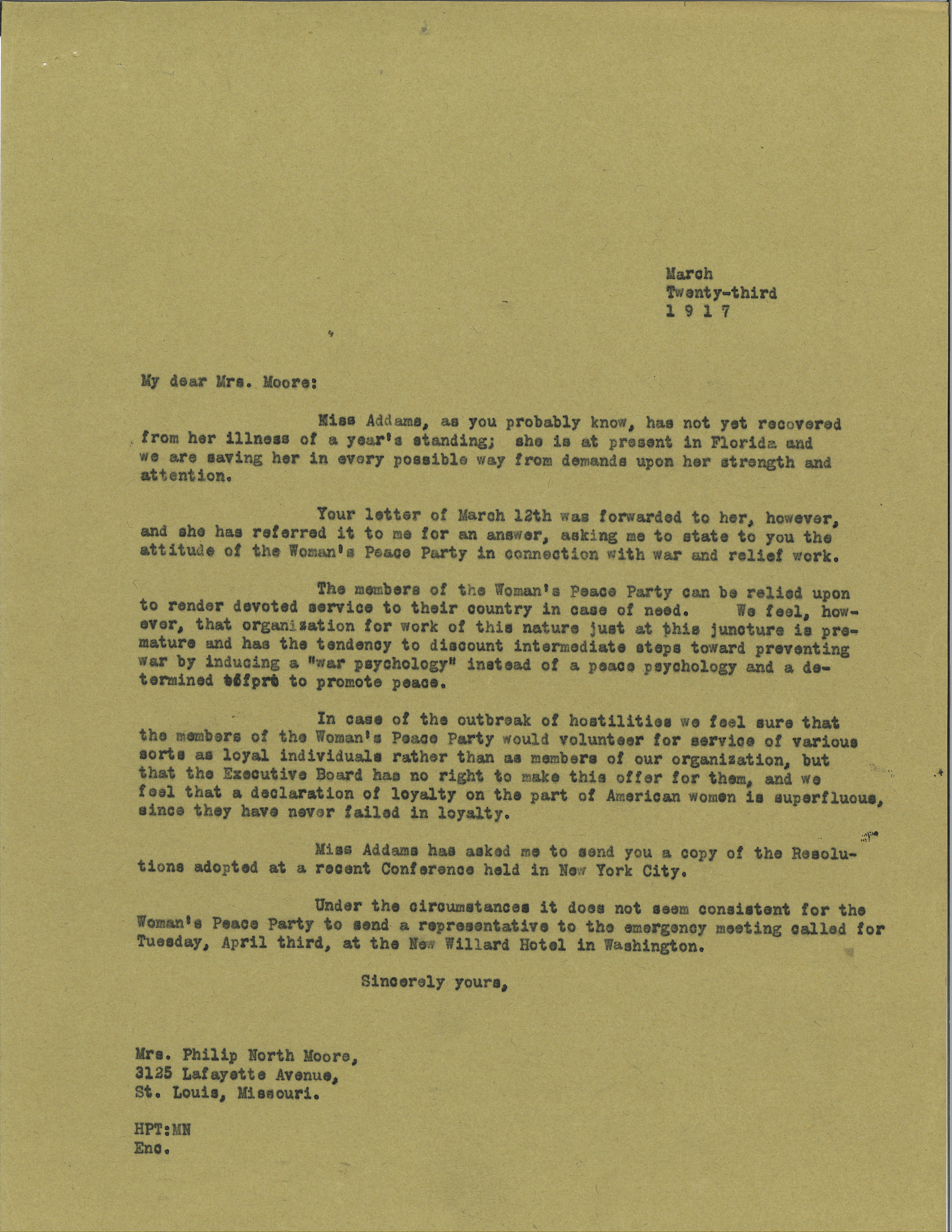 Your letter of March 12th was forwarded to her, however, and she has referred it to me for an answer, asking me to state to you the attitude of the Woman's Peace Party in connection with war and relief work.
