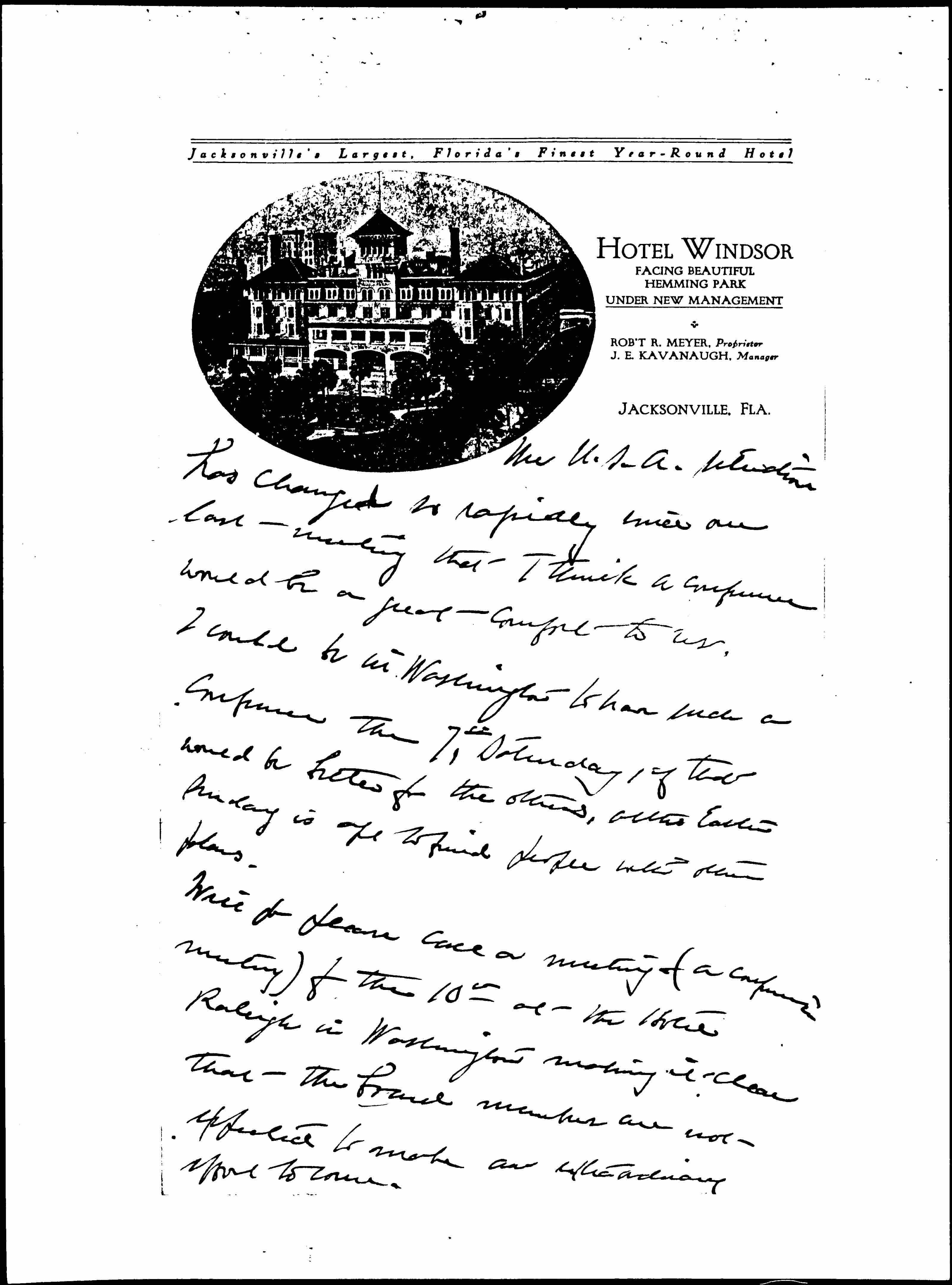 Will you please call a meeting -- (a conference meeting) for the 10th at the Hotel Raleigh in Washington making it clear that the board members are not expected to make an extraordinary effort to come. [page 3]