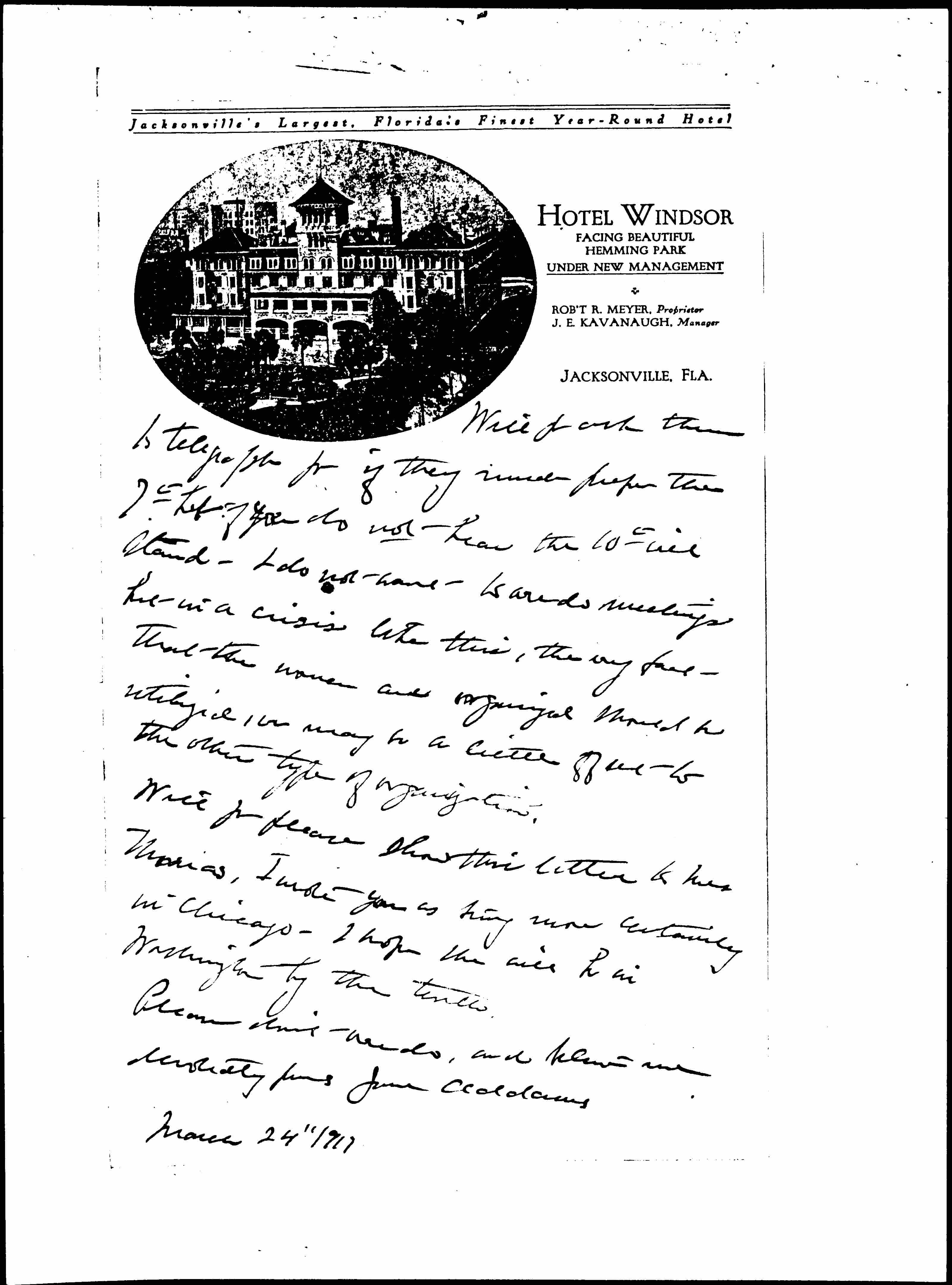 Will you ask them to telegraph you if they [much] prefer the 7th but if you do not hear the 10th will stand. I do not want to [overdo] meetings but in a crisis like this, the very fact that the women are organized should be utilized, we may be a little [offset] to the other type of organization.