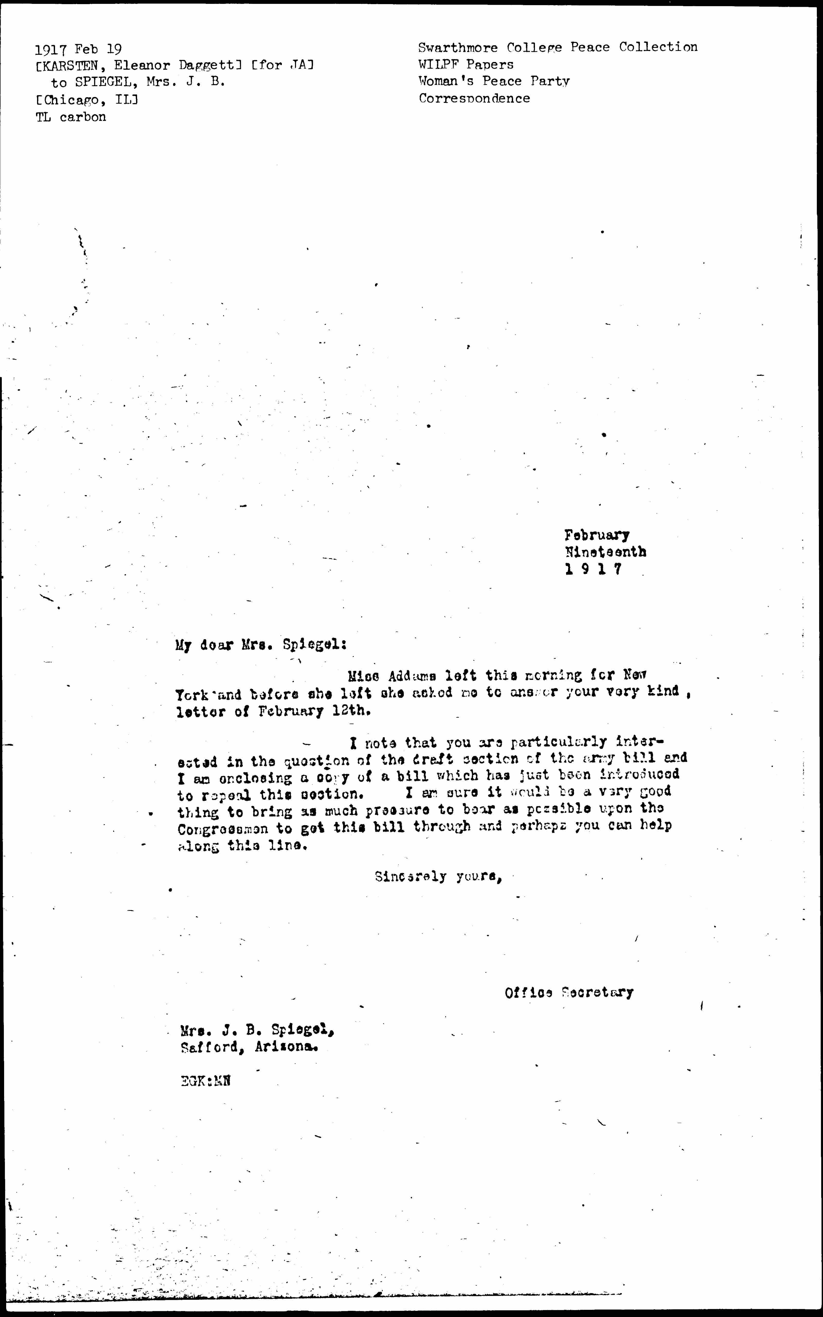 I note that you are particularly interested in the question of the draft section of the army bill and I am enclosing a copy of a bill which has just been introduced to repeal this section. I am sure it would be a very good thing to bring as much pressure to bear as possible upon the Congressmen to get this bill through and perhaps you can help along this line.