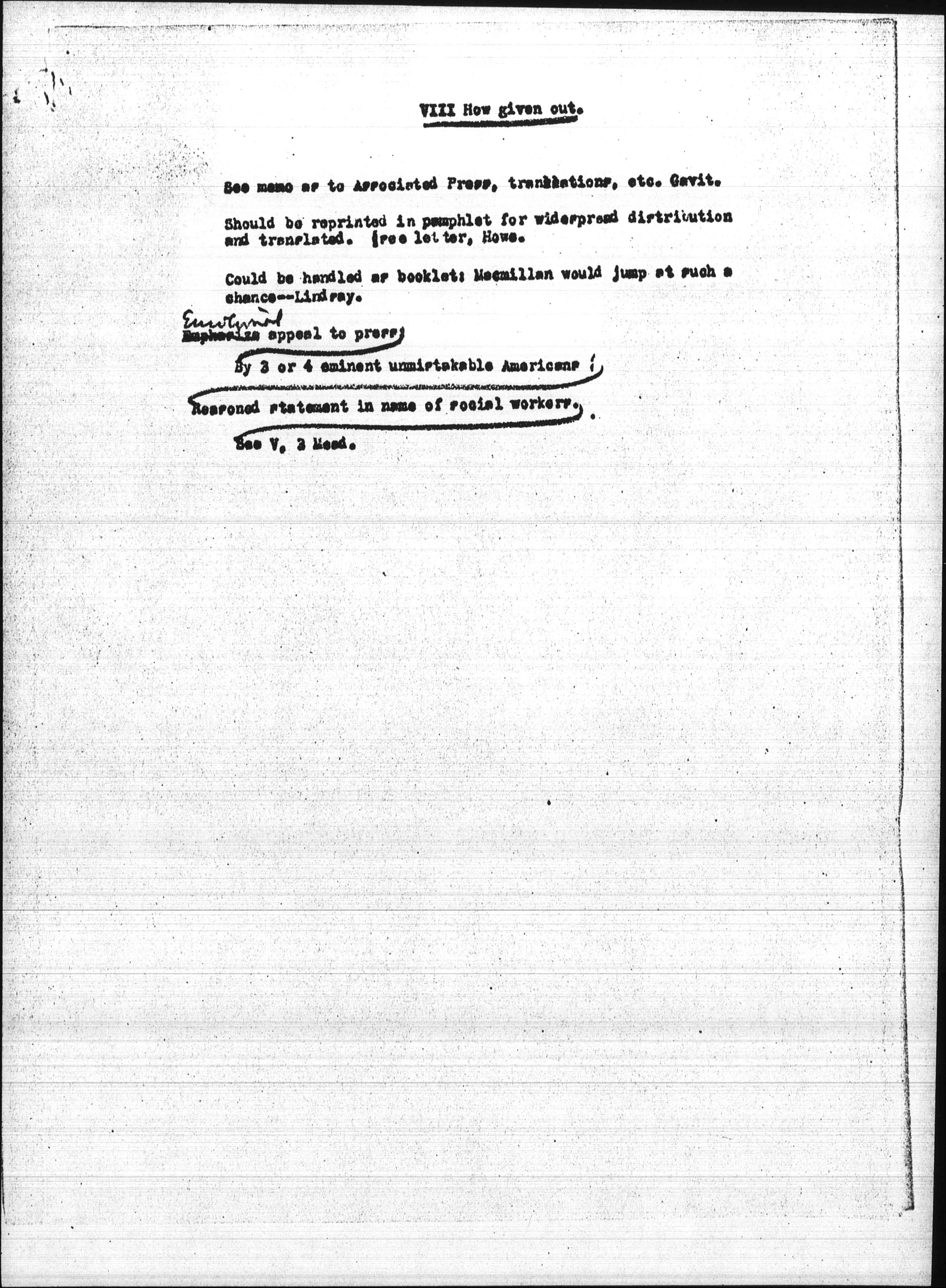 Emphasize <Emotional> appeal to press By 3 or 4 eminent unmistakable Americans; Reasoned statement in name of social workers. See V. G. Mead. [page 11]