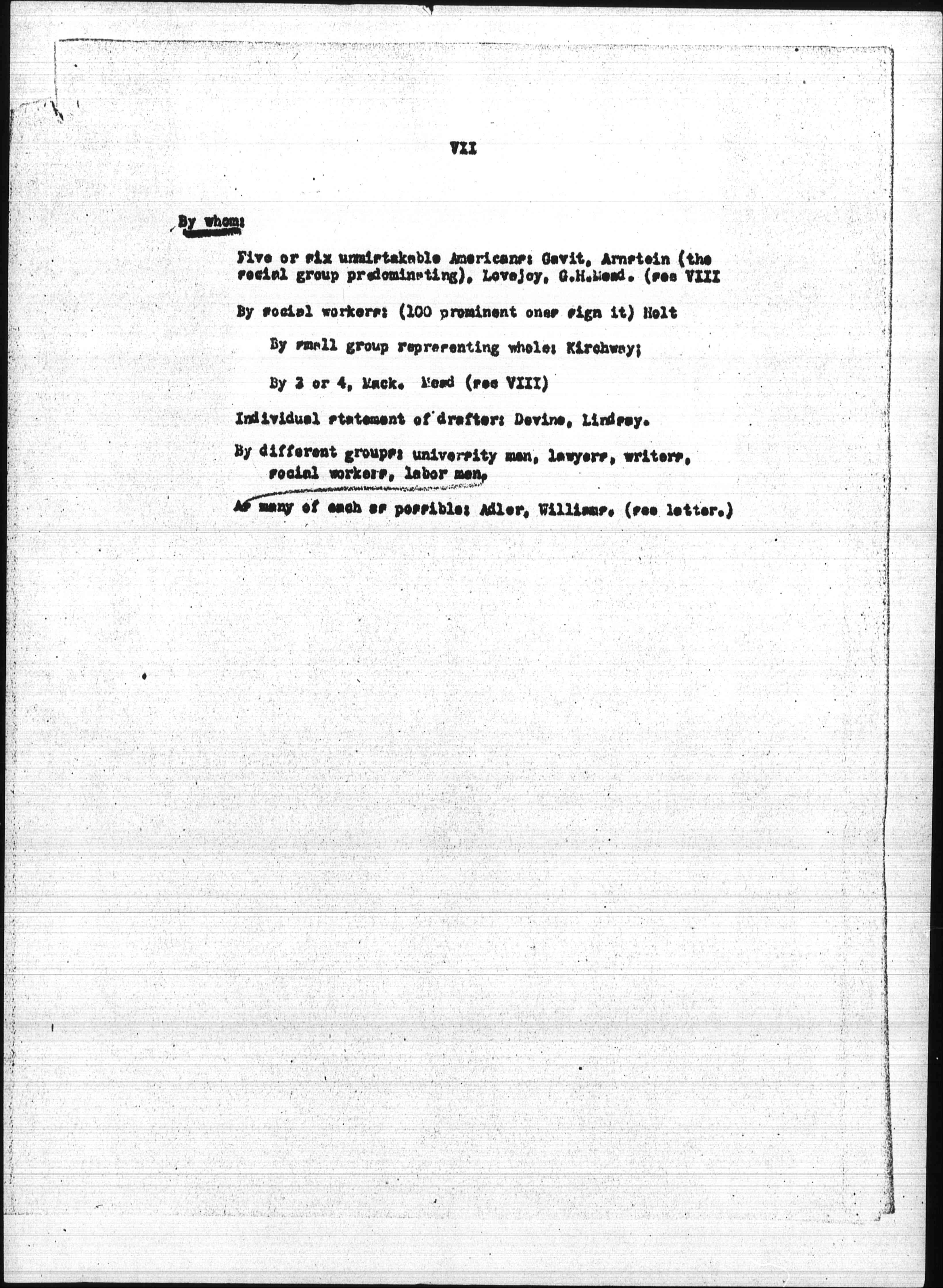 By different groups: university men, lawyers, writers, social workers, labor men. As many of each as possible: Adler, Williams. (see letter.) [page 10]