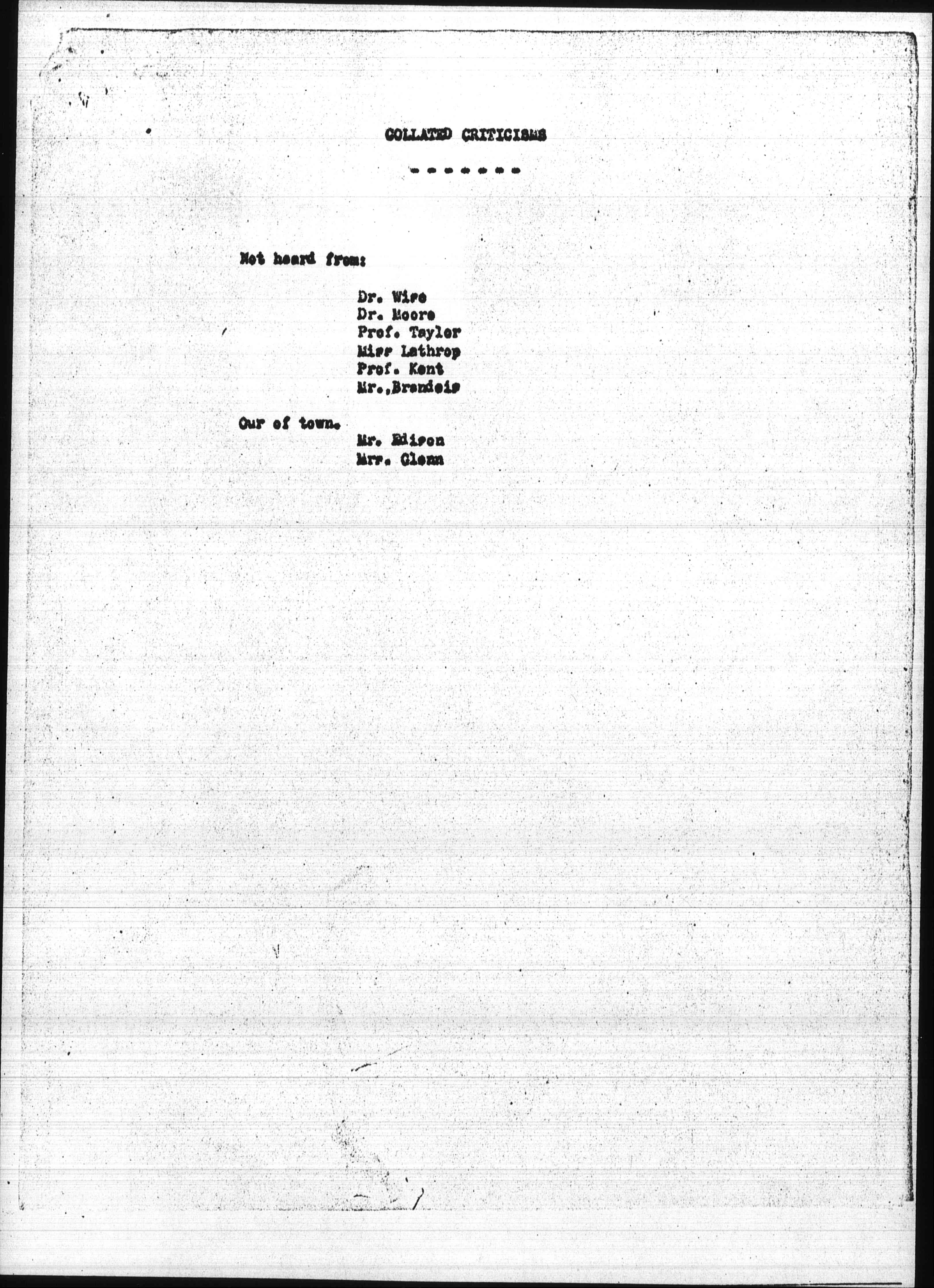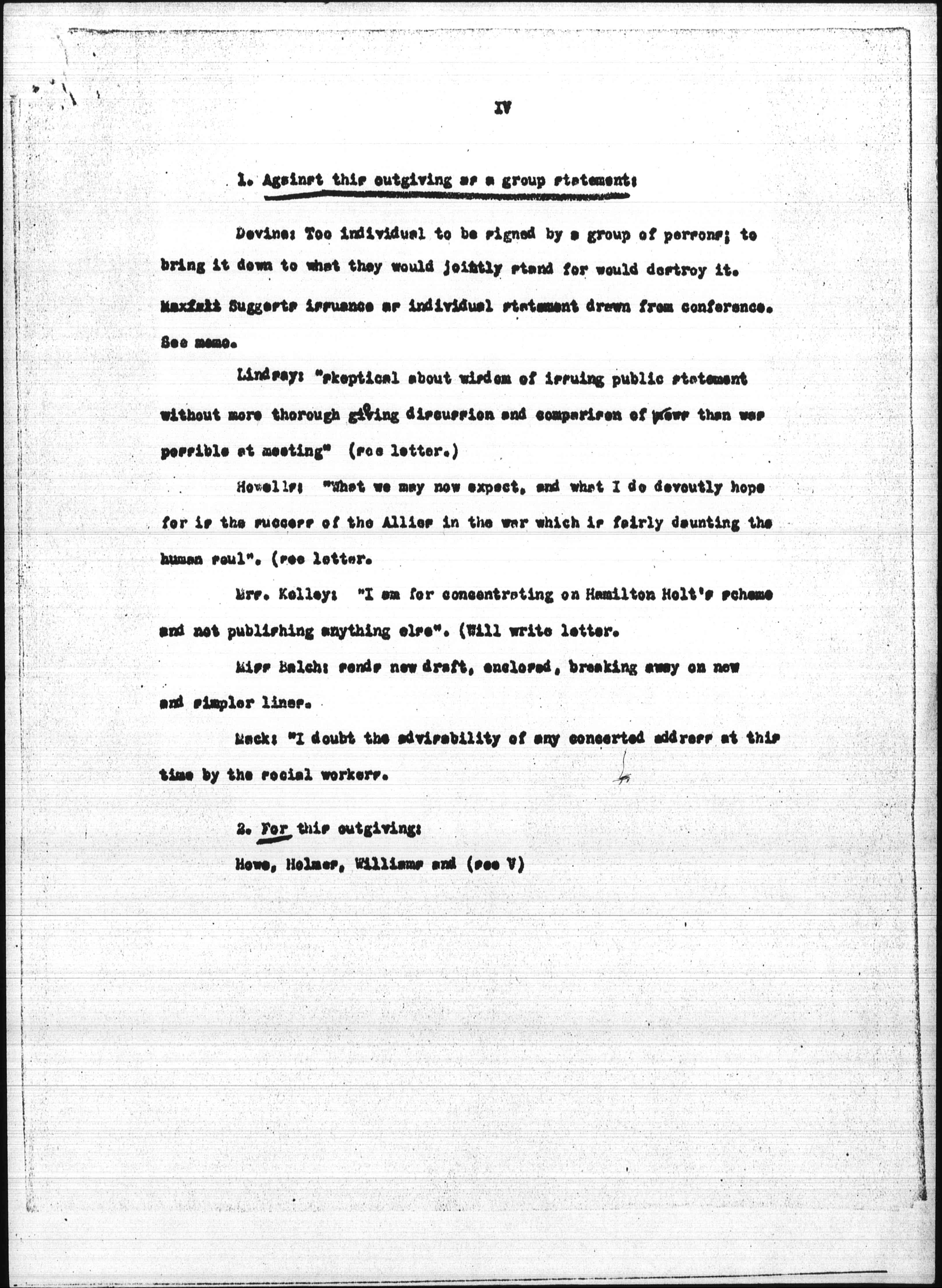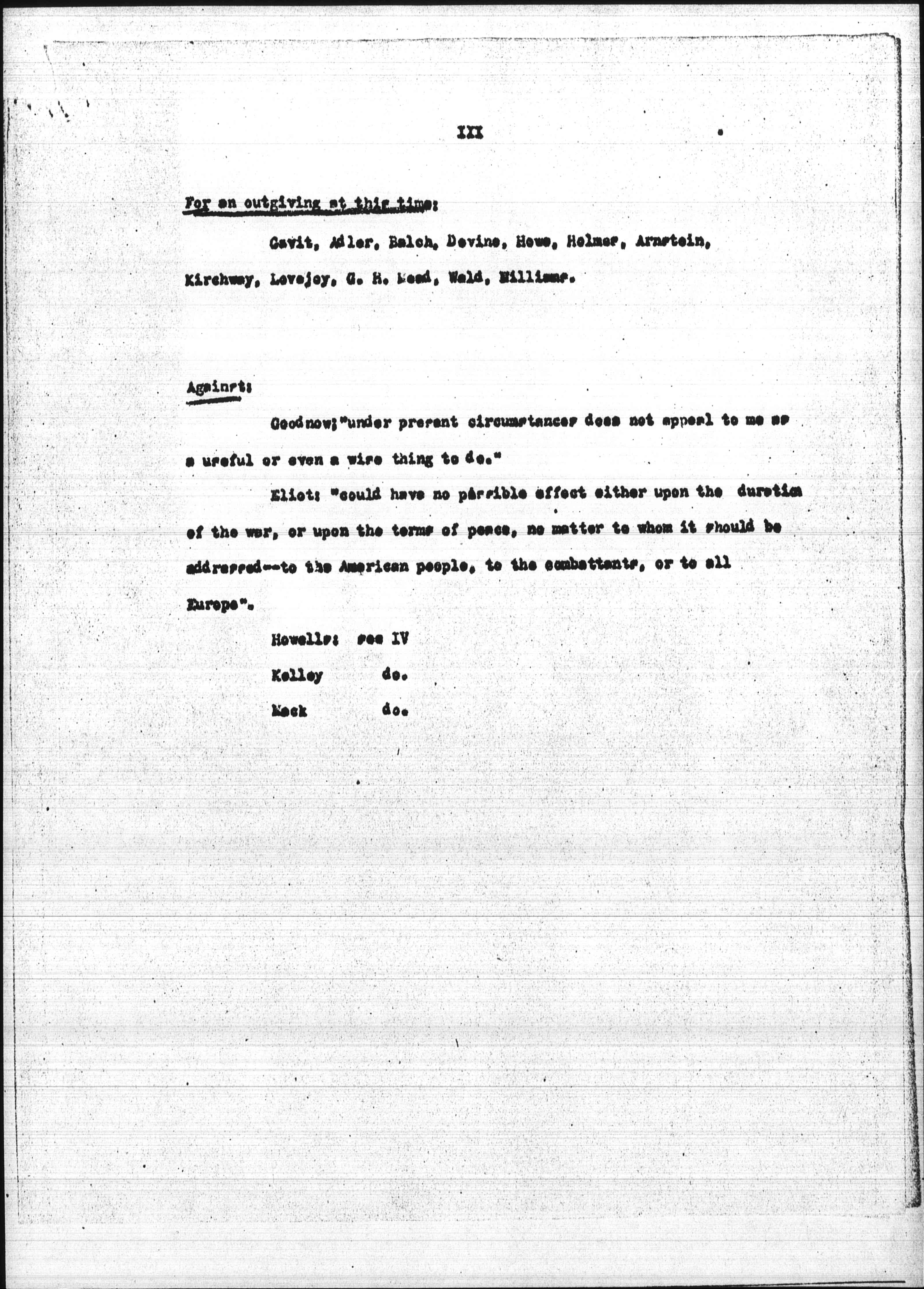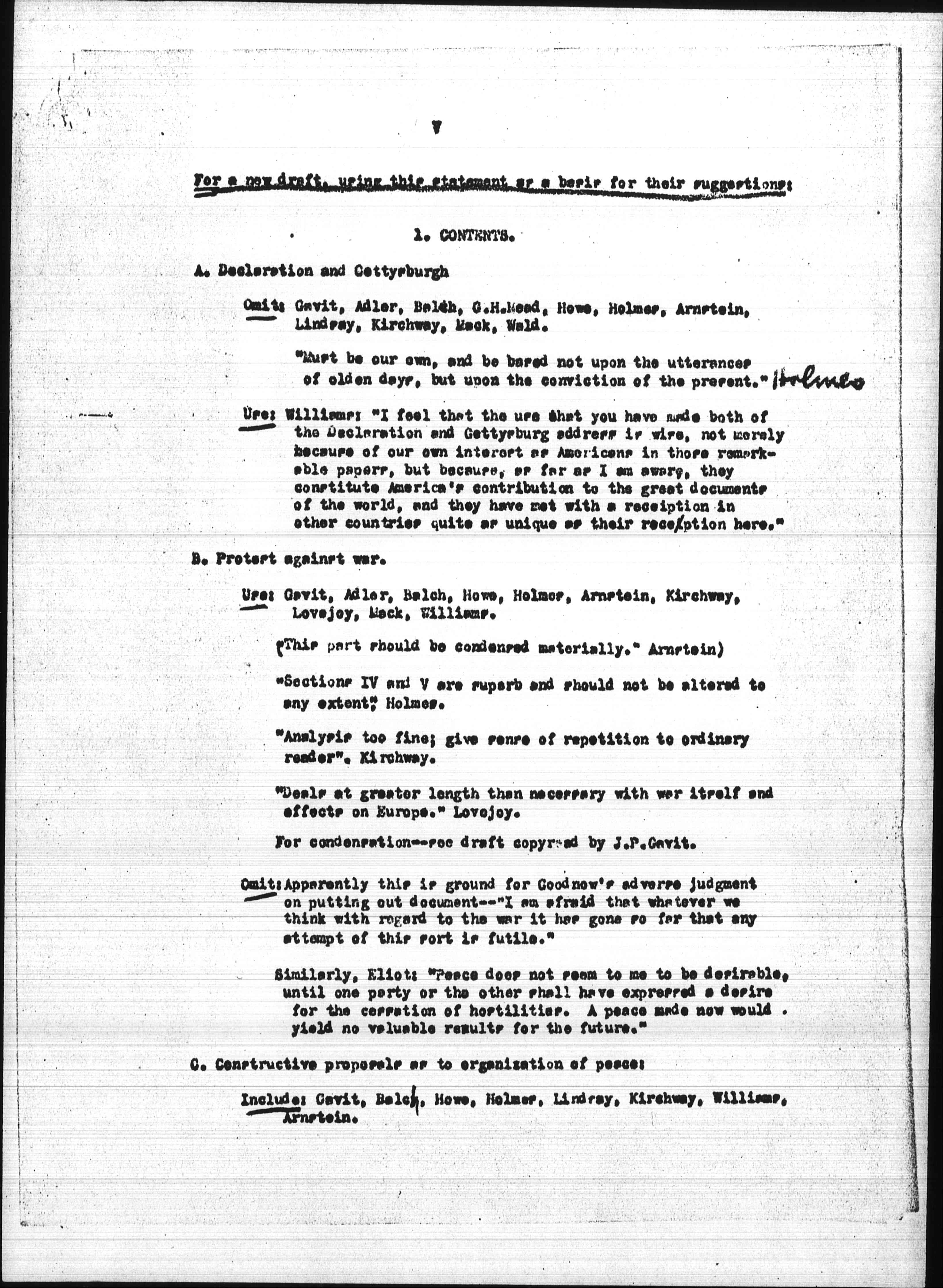 "I think that the document falls between two stools. It undertakes to be an impassioned appeal to the people of Europe and it becomes too detached and too reasoned for an impassioned appeal. If it is to be such it seems to me [page 7] that it should be much shorter and should be made up of short sentences giving our emotional attitude without the grounds and reasons. If the whole most admirable presentation is to be given it seems to me that the effort to keep the level of strong emotion must be abandoned, and that the power of the statement must come from the reasoned statement." G. H. Mead [page 8]