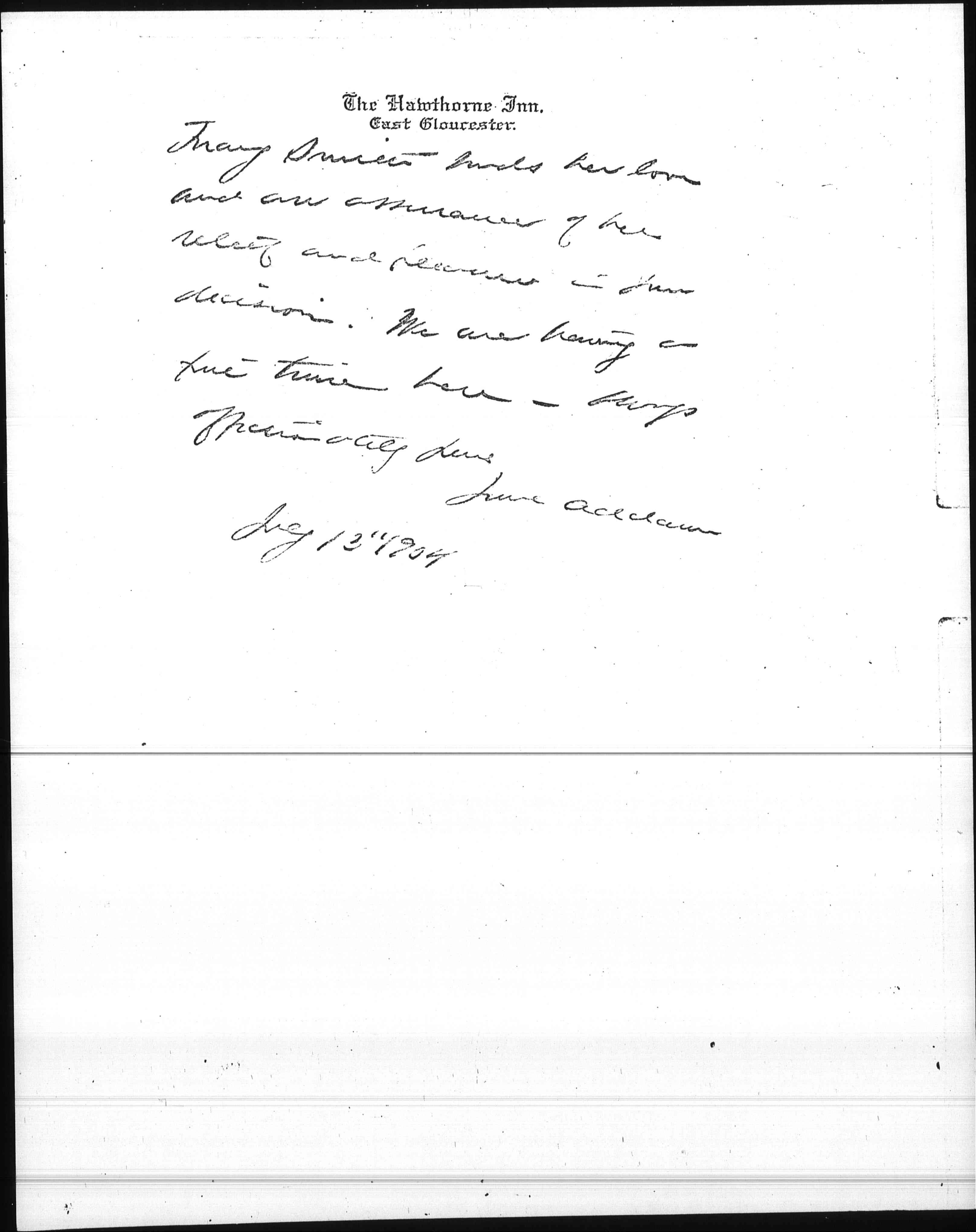 I have written her this morning saying that you would stay and [mightily] glad I was to get a chance to. [page 2] Mary Smith sends her love and an assurance of her relief and pleasure in your decision. We are having a fine time here. Always affectionately yours