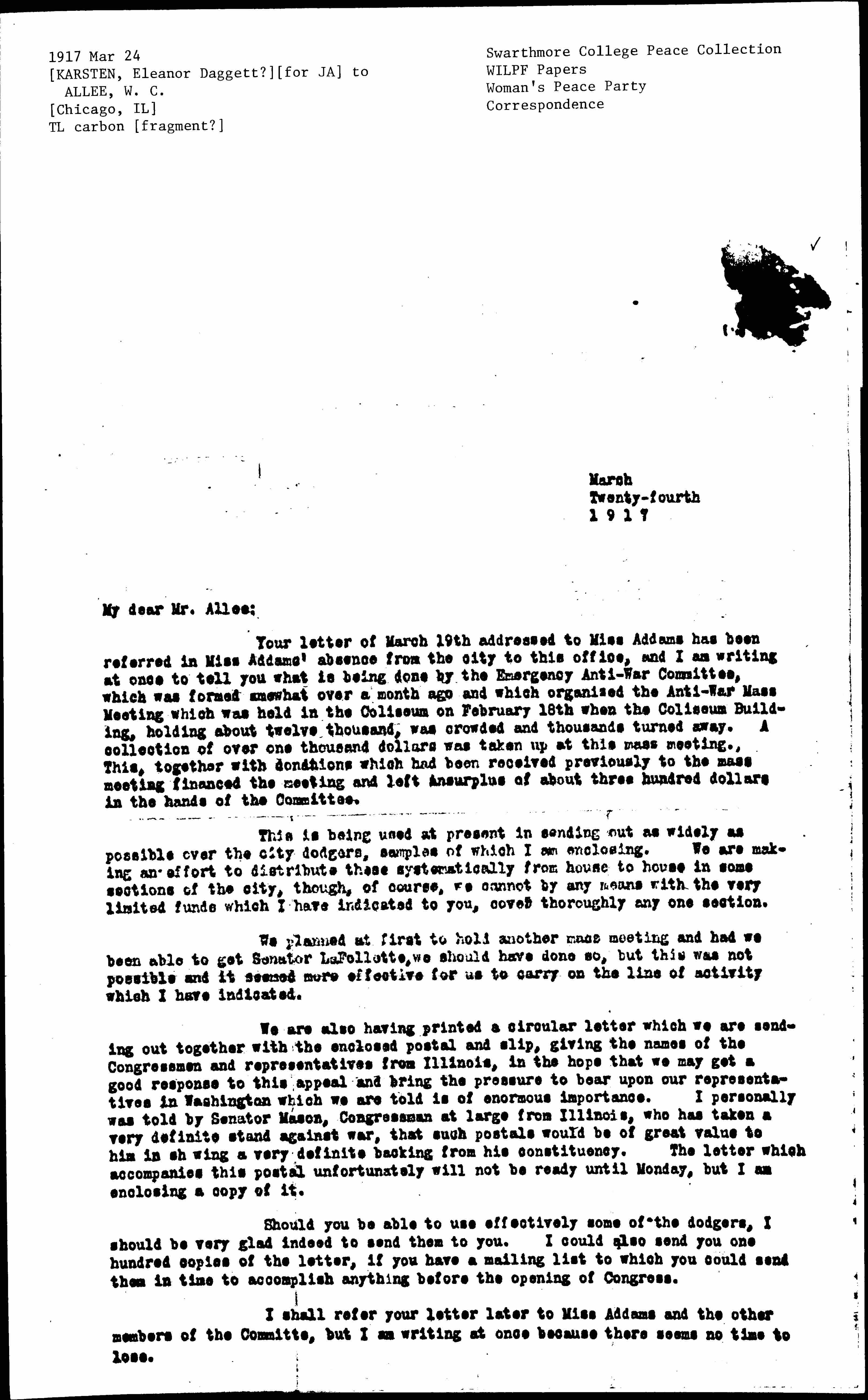 Your letter of March 19th addressed to Miss Addams has been referred in Miss Addams' absence from the city to this office, and I am writing at once to tell you what is being done by the Emergency Anti-War Committee, which was formed somewhat over a month ago and which organized the Anti-War Mass Meeting which was held in the Coliseum on February 18th when the Coliseum Building, holding about twelve thousand, was crowded and thousands turned away. A collection of over one thousand dollars was taken up at this mass meeting. This, together with donations which had been received previously to the mass meeting financed the meeting and left a surplus of about three hundred dollars in the hands of the Committee.