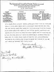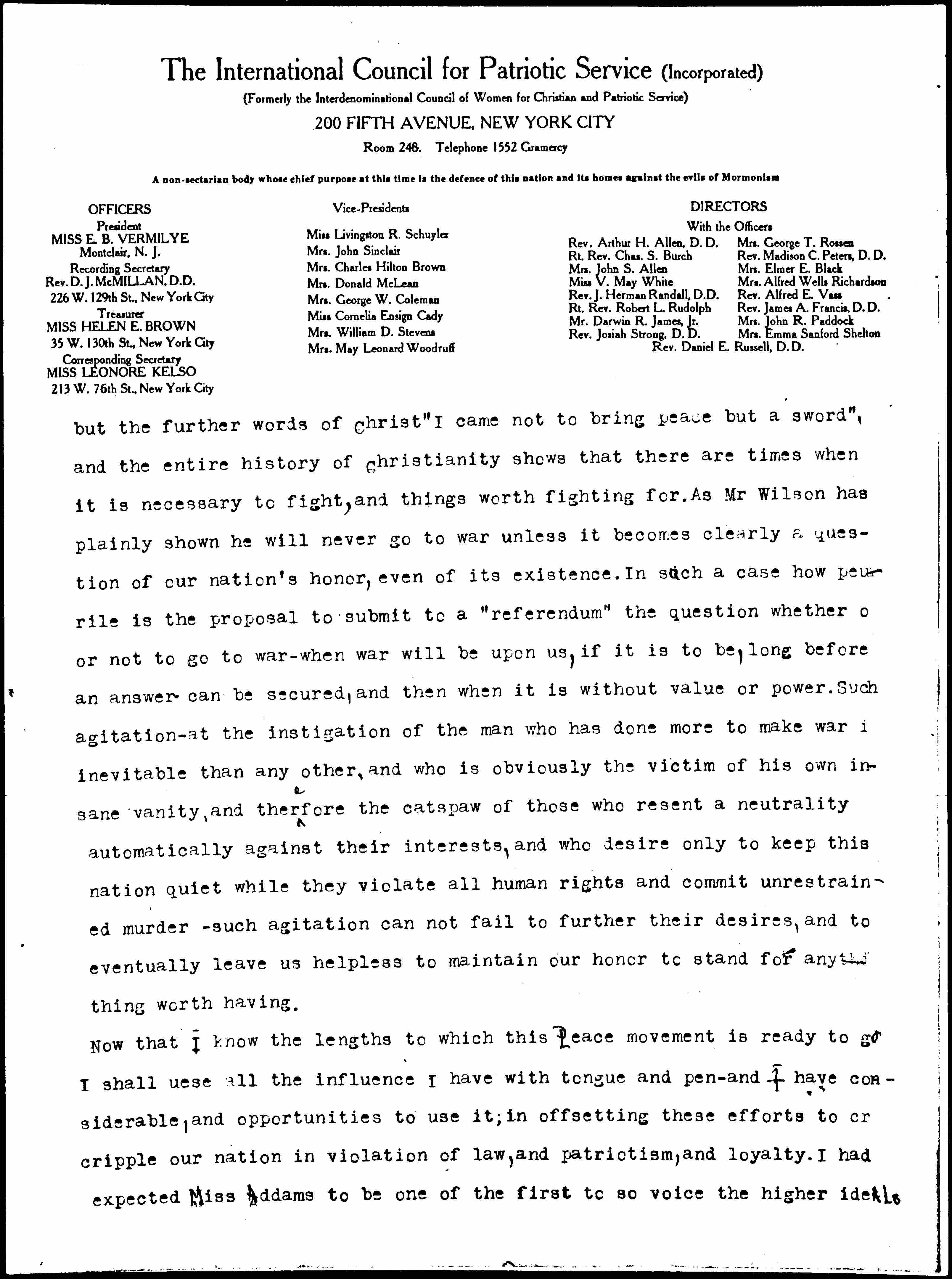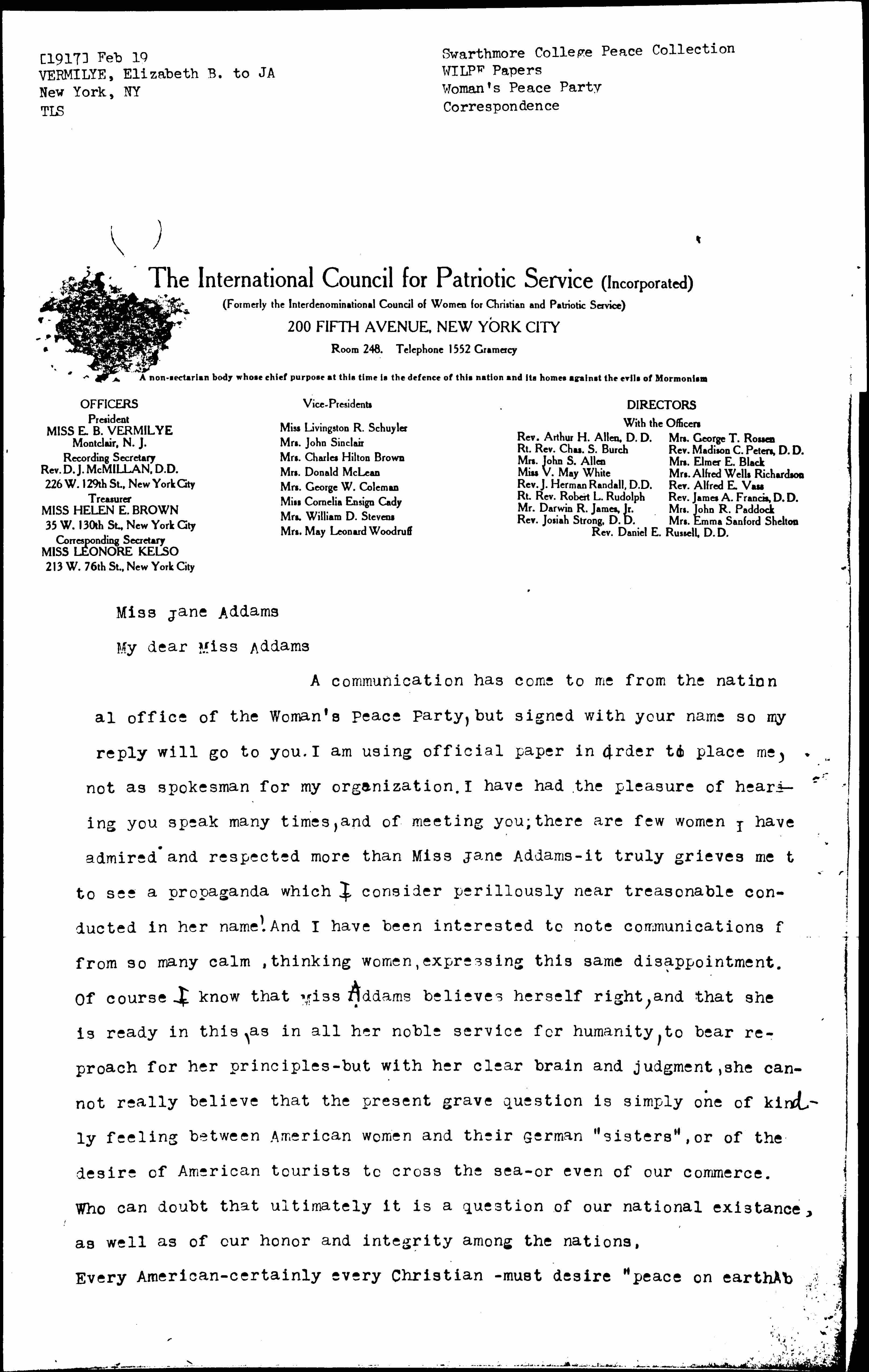 A communication has come to me from the national office of the Woman's Peace Party, but signed with your name so my reply will go to you. I am using official paper in order to place me, not as spokesman for my organization. I have had the pleasure of hearing you speak many times, and of meeting you; there are few women I have admired and respected more than Miss Jane Addams -- it truly grieves me to see a propaganda which I consider [perilously] near treasonable conducted in her name! And I have been interested to note communications from so many calm, thinking women, expressing this same disappointment. Of course I know that Miss Addams believes herself right, and that she is ready in this, as in all her noble service for humanity, to bear reproach for her principles -- but with her clear brain and judgment, she cannot really believe that the present grave question is simply one of kindly feeling between American women and their German "sisters", or of the desire of American tourists to cross the sea -- or even of our commerce. Who can doubt that ultimately it is a question of our national [existence], as well as of our honor and integrity among the nations.