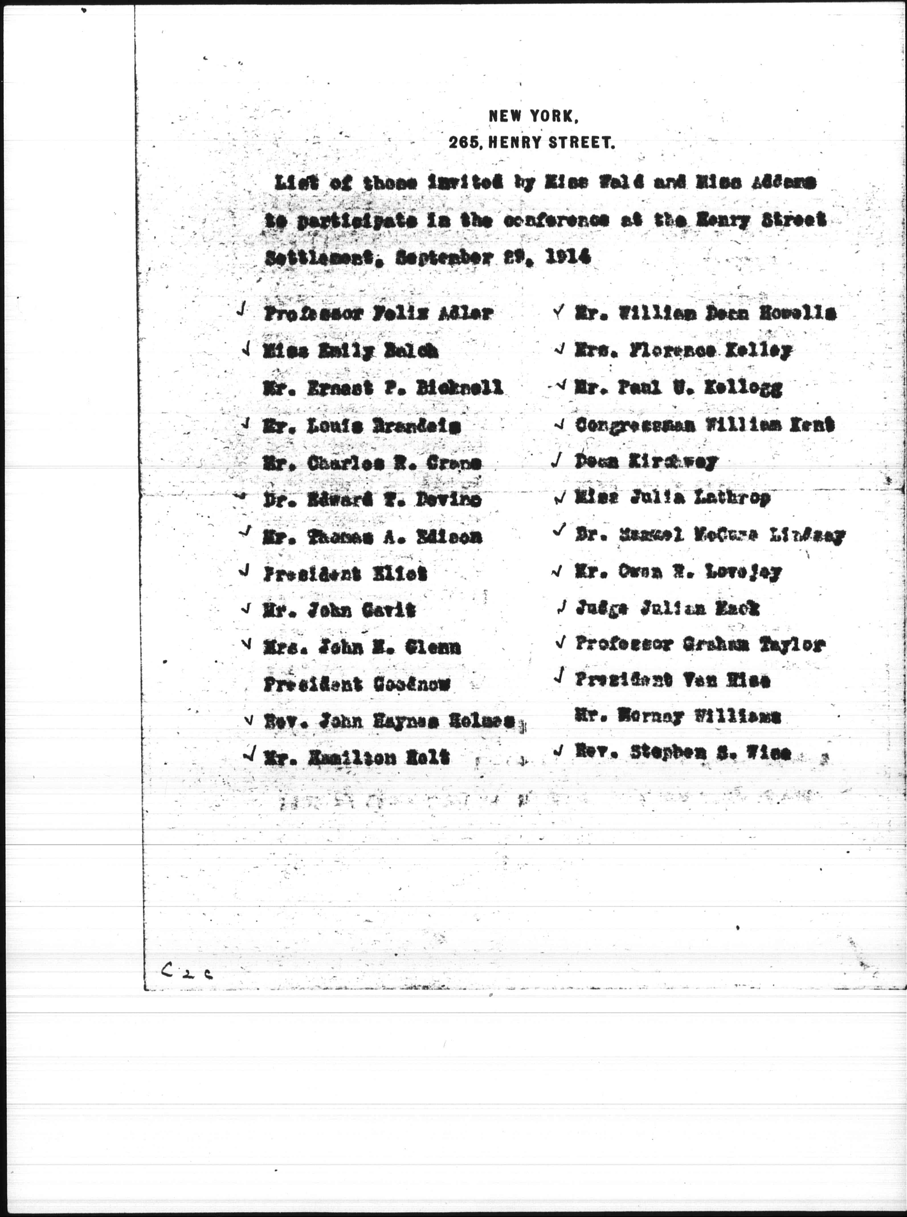 List of those invited by Miss Wald and Miss Addams to participate in the conference at the Henry Street Settlement, September 29, 1914