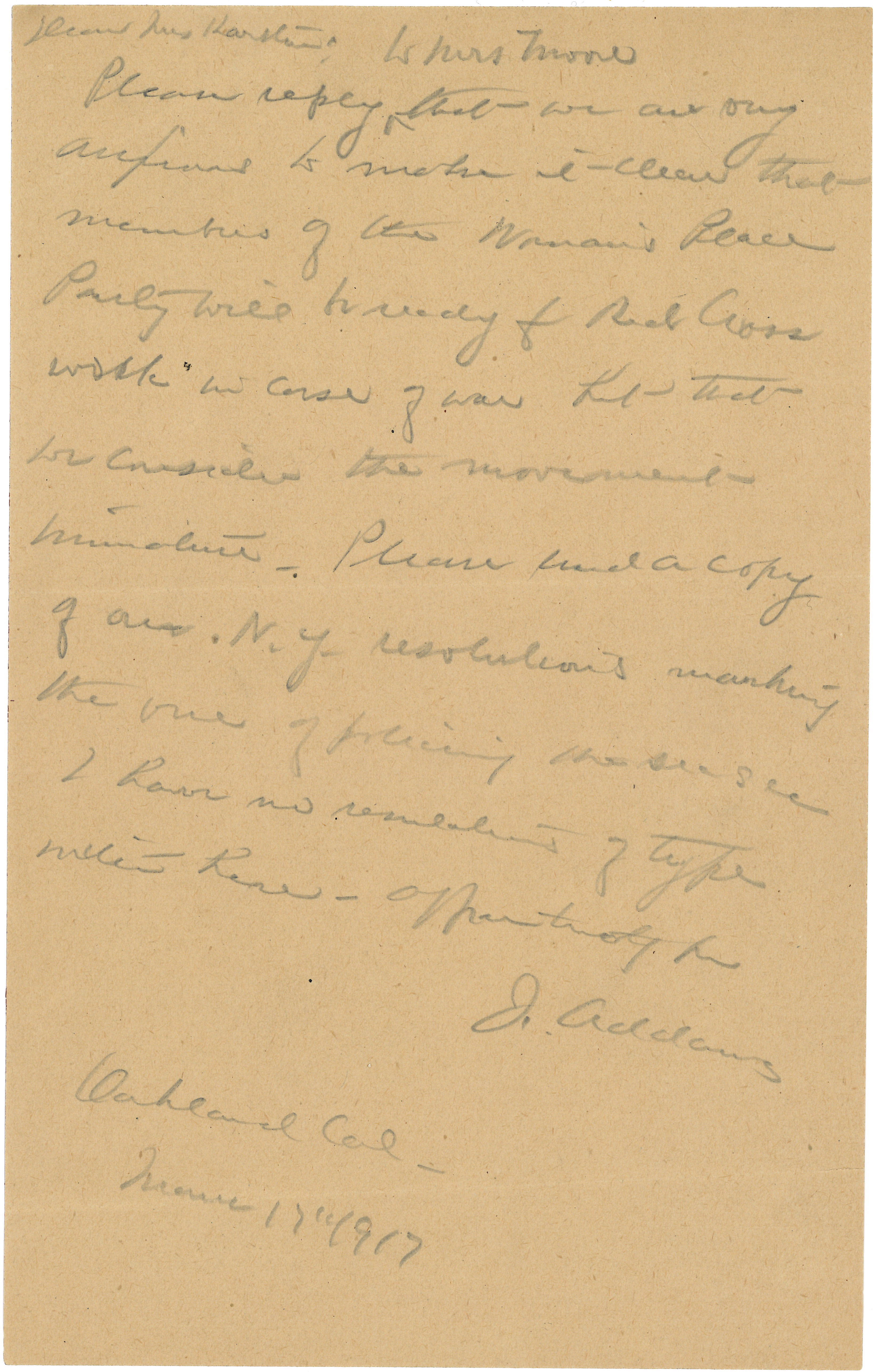 Please reply <to Mrs Moore> that we are very anxious to make it clear that members of the Woman's Peace Party will be ready for Red Cross work in case of war but that we consider the movement [premature]. Please send a copy of our N.Y. resolutions marking the one of policing the seas [etc].