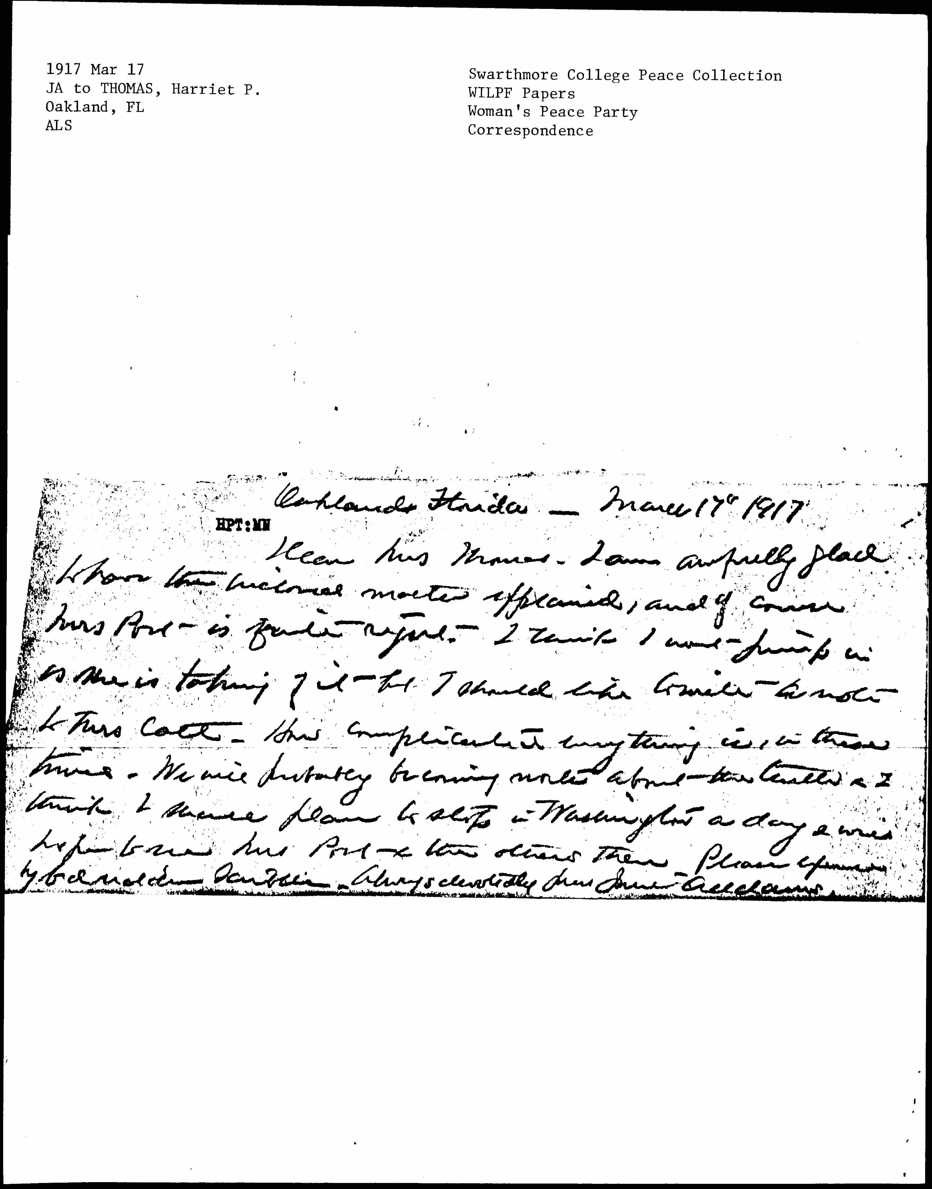 Dear Mrs Thomas -- I am awfully glad to have the [enclosed] matter explained, and of course Mrs Post is quite right. I think I won't jump in as she is taking of it but I should like to write a note to Mrs Catt. How complicated everything is, in these times. We will probably be coming north about the tenth & I think I shall plan to stop in Washington a day & will hope to see Mrs Post & the others then. Please excuse my bad [illegible] scribble. Always devotedly yours Jane Addams.