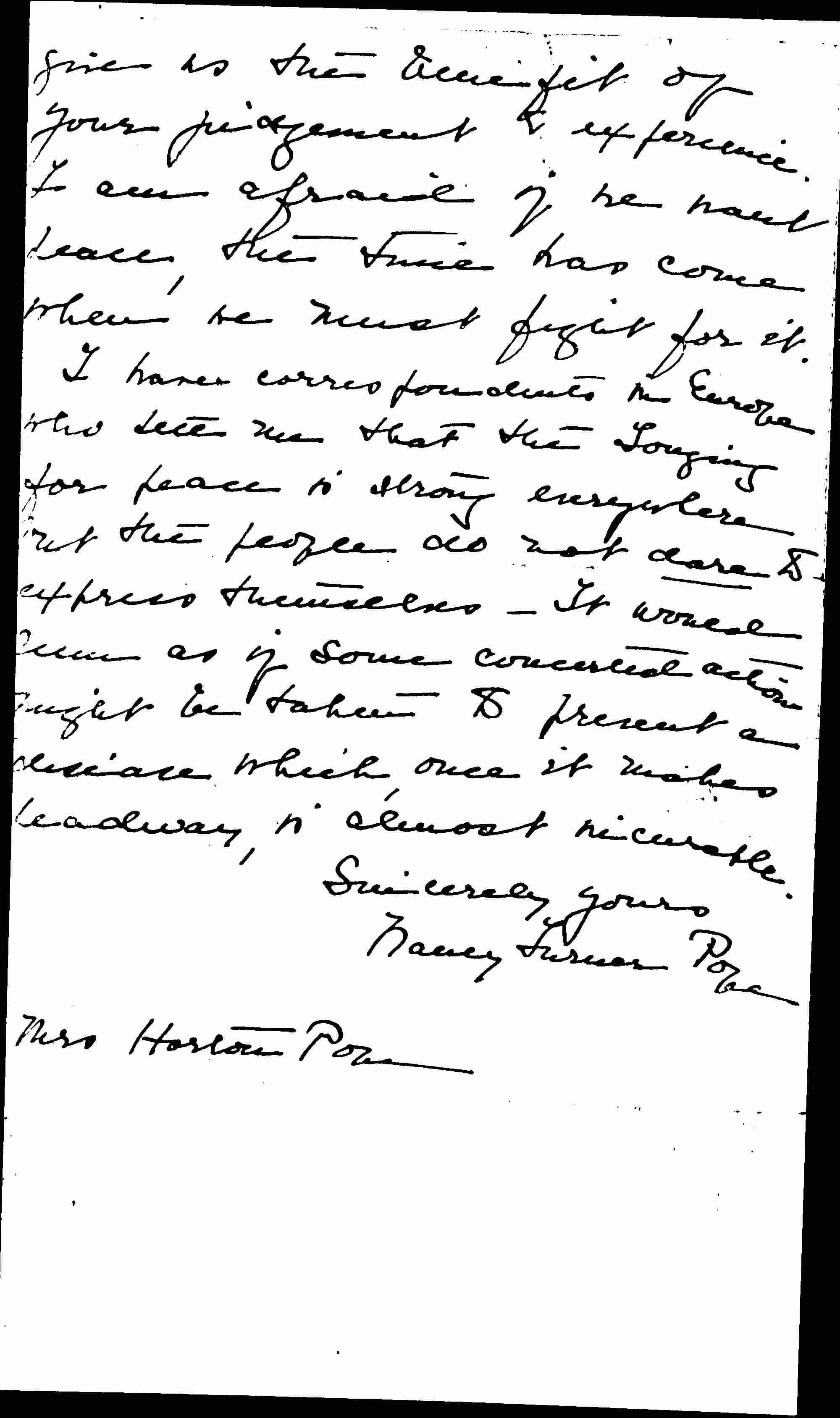 I have correspondents in Europe who tell me that the Longing for peace is strong everywhere but the people do not dare to express themselves. It would seem as if some concerted action might be taken to prevent a disease which, once it makes headway, is almost incurable.