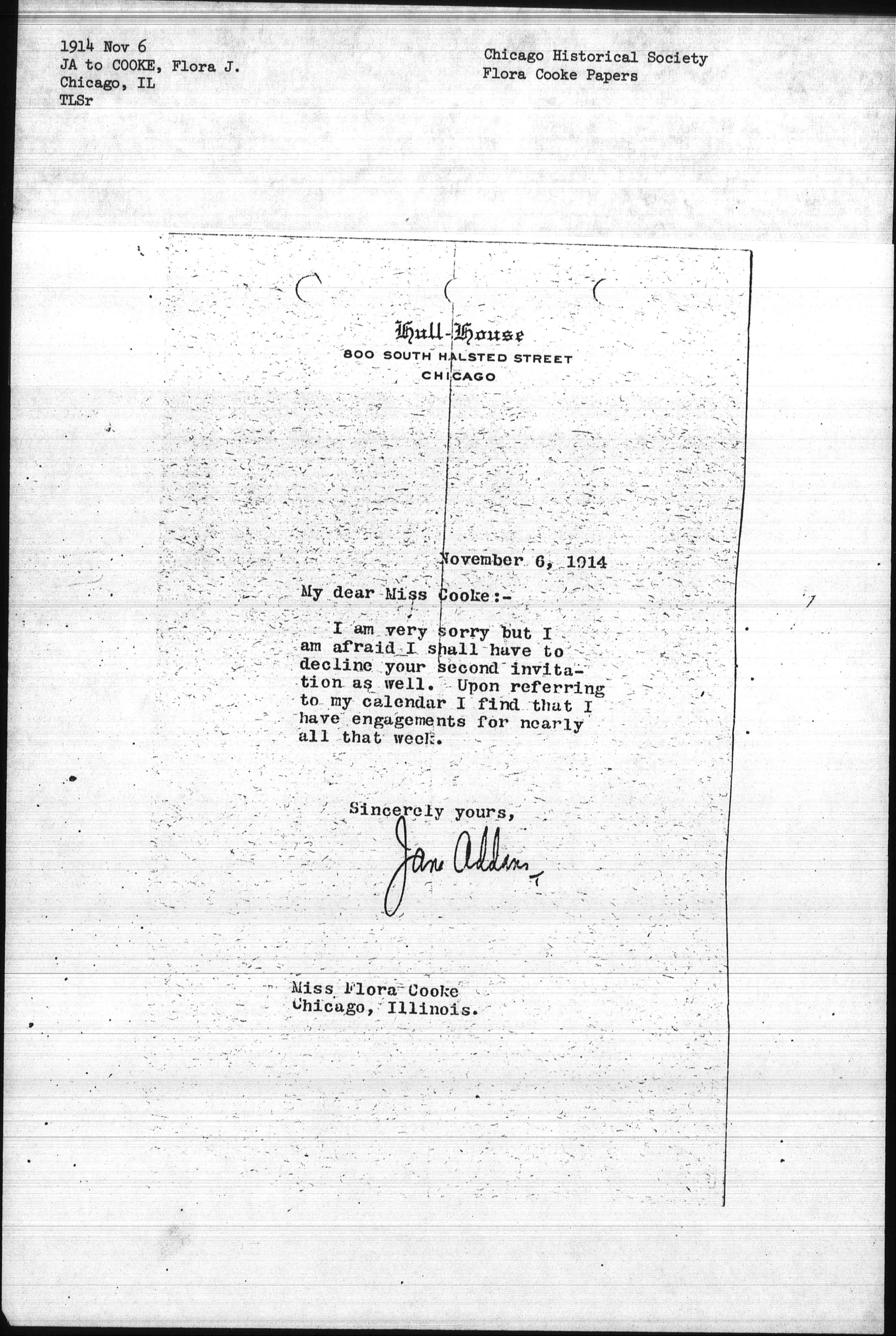 Jane Addams [signed by secretary] T.