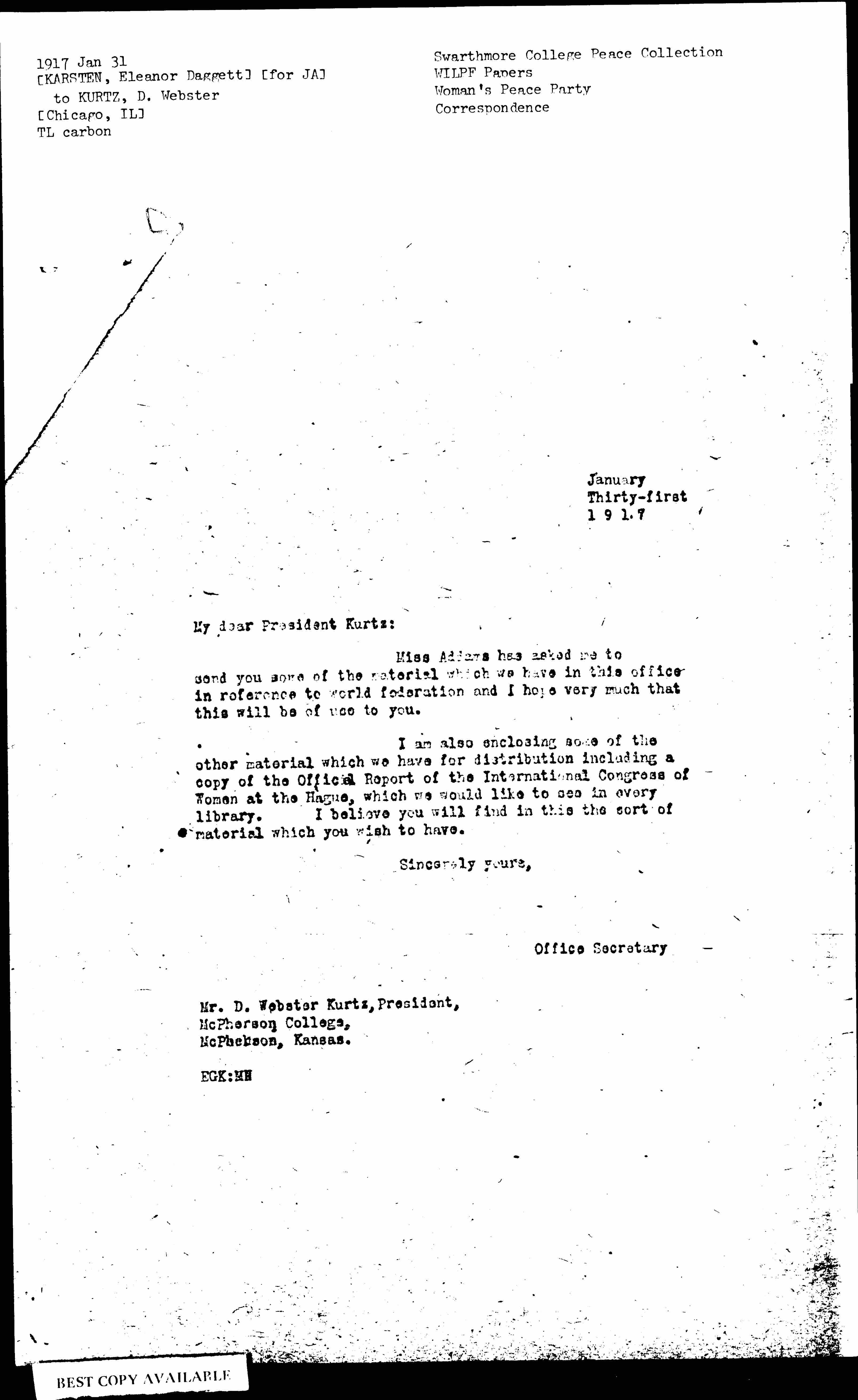 I am also enclosing some of the other material which we have for distribution including a copy of the Official Report of the International Congress of Women at The Hague, which we would like to see in every library. I believe you will find in this the sort of material which you wish to have.