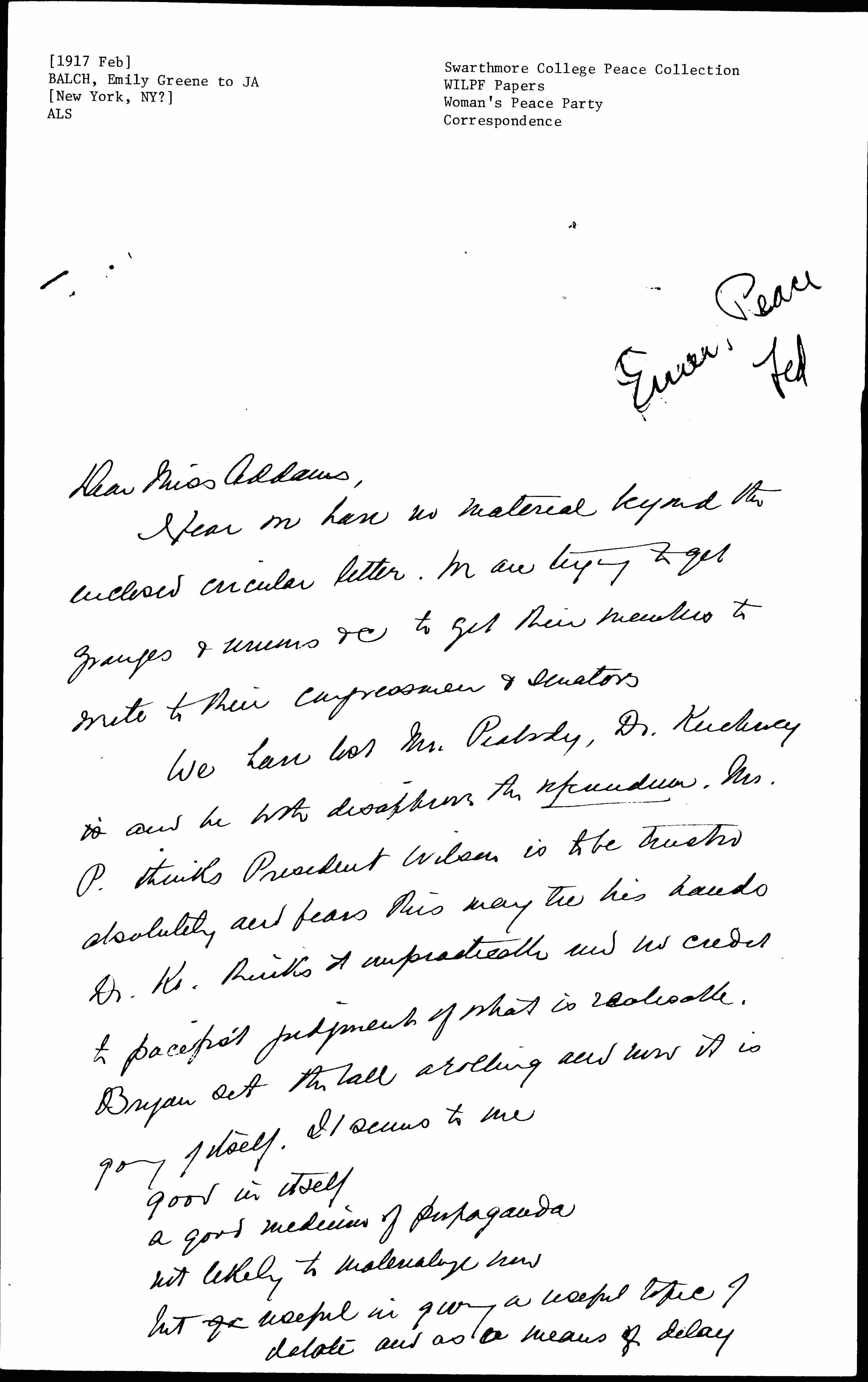 We have lost Mr. Peabody, Dr. Kirchwey is and he both disapprove the referendum. Mr. P. thinks President Wilson is to be trusted absolutely and fears this may tie his hands. Dr. K. thinks it unpracticable and no credit to pacifist judgment of what is [realizable]. Bryan set the ball arolling and now it is going of itself. It seems to me good in itself a good medicine of propaganda not likely to materialize now but gr useful in giving a useful topic of debate and as a means of delay [page 2] and a way out for members of Cong. too cowardly to vote against war straight out if the break comes.