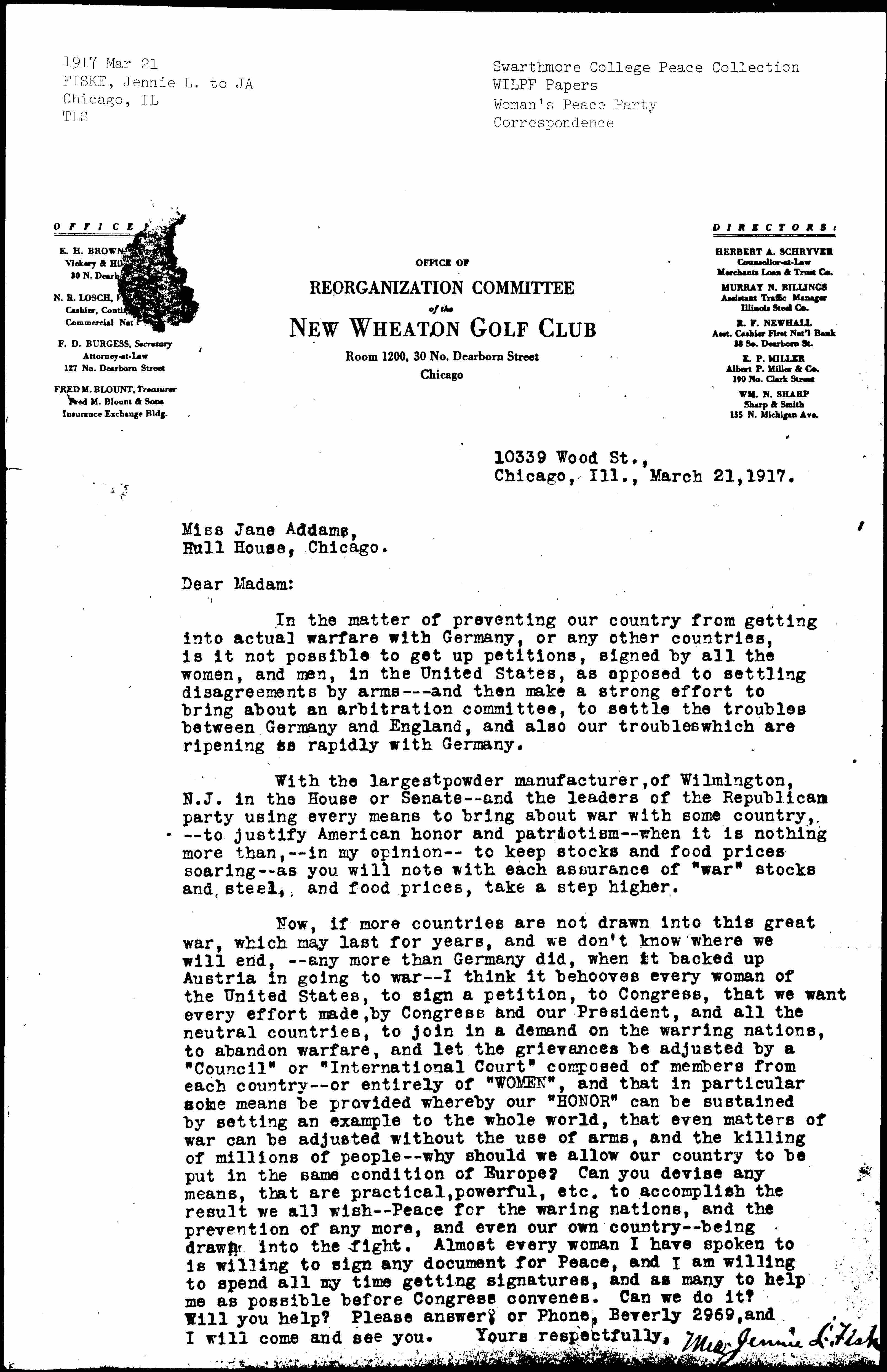 Now, if more countries are not drawn into this great war, which may last for years, and we don't know where we will end,-- any more than Germany did, when it backed up Austria in going to war-- I think it behooves every woman of the United States, to sign a petition, to Congress, that we want every effort made, by Congress and our President, and all the neutral countries, to join in a demand on the warring nations, to abandon warfare, and let the grievances be adjusted by a "Council" or "International Court" composed of members from each country-- or entirely of "WOMEN", and that in particular some means be provided whereby our "HONOR" can be sustained by setting an example to the whole world, that even matters of war can be adjusted without the use of arms, and the killing of millions of people-- why should we allow our country to be put in the same condition as Europe? Can you devise any means that are practical, powerful, etc. to accomplish the result we all wish-- Peace for the [warring] nations, and the prevention of any more, and even our own country-- being drawn into the fight. Almost every woman I have spoken to is willing to sign any document for Peace, and I am willing to spend all my time getting signatures, and as many to help me as possible before Congress convenes. Can we do it? Will you help? Please answer, or Phone, Beverly 2969, and I will come and see you. Yours respectfully,