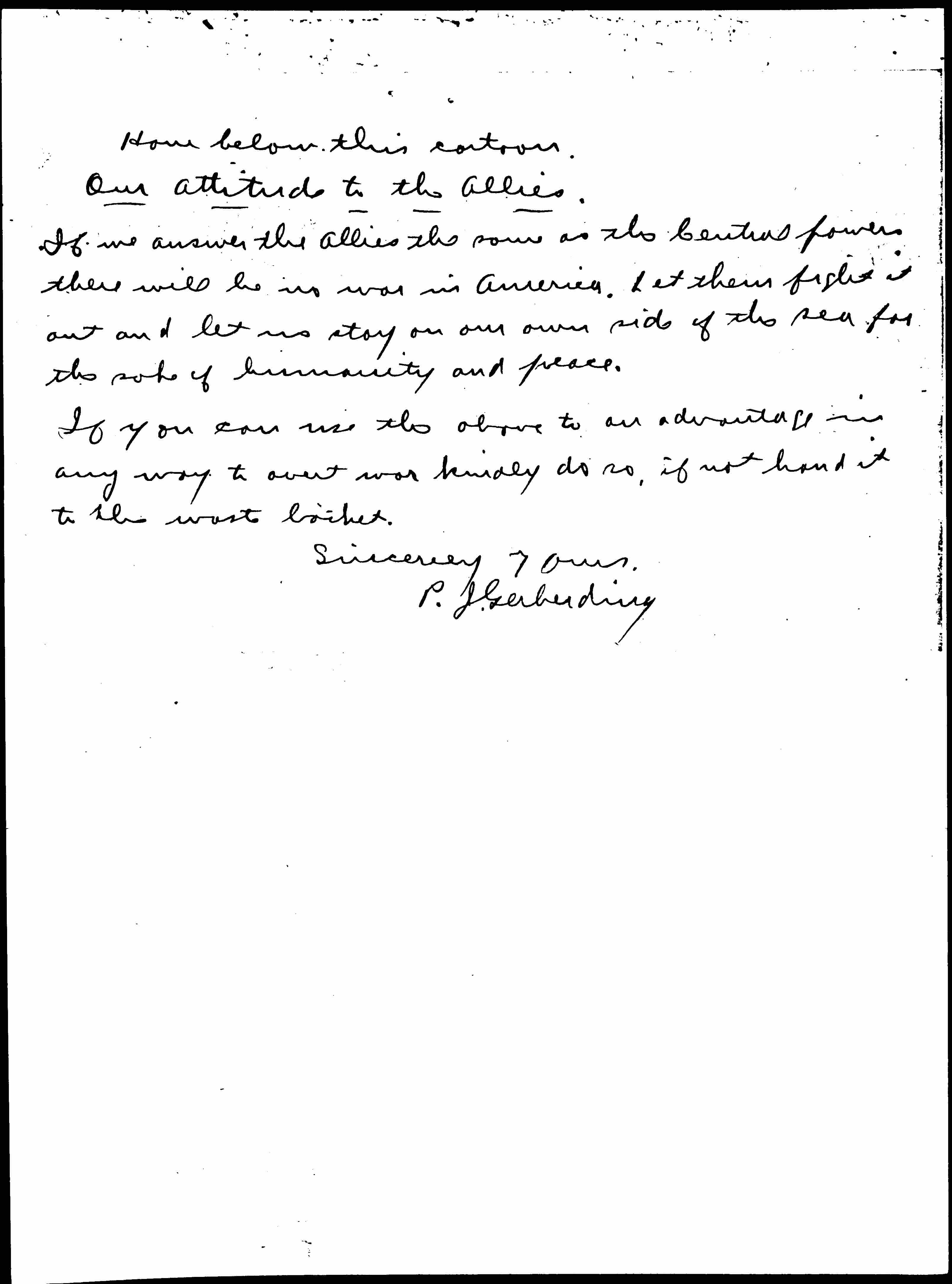 If we answer the Allies the same as the Central powers there will be no war in America. Let them fight it out and let us stay on our own side of the sea for the sake of humanity and peace.