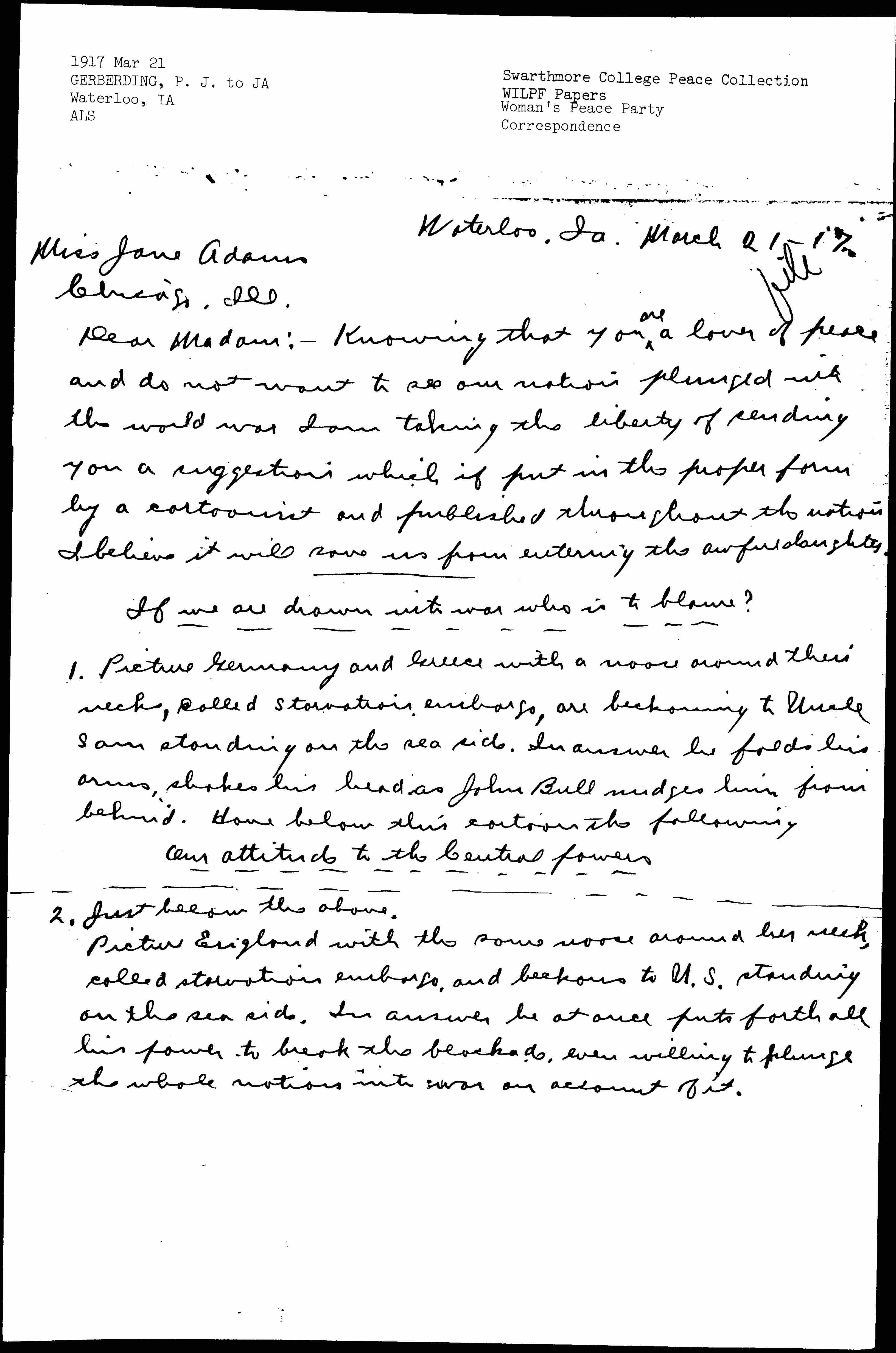 Dear Madam: -- Knowing that you <are> a lover of peace and do not want to see our nation plunged [into] the world war I am taking the liberty of sending you a suggestion which if put in the proper form by a cartoonist and published throughout the nation I believe it will save us from entering the awful slaughter.